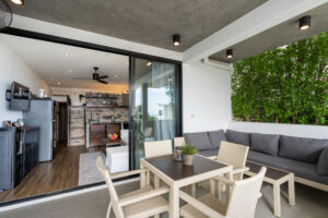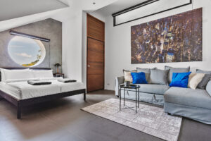 Welcome to C2, a penthouse apartment, offering 231 sqm of space designed to accommodate up to 8 guests in comfort. With its industrial design featuring black steel beams, high ceilings, and raw cement block walls, this apartment creates a unique yet cozy atmosphere. A private Jacuzzi and stunning sea views and mountain views.
