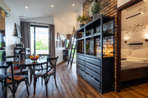 Welcome to H3, a stylish apartment with an industrial design theme, perfect for up to four guests. These open-plan studios offer a comfortable and functional space for a relaxing stay. The studio features a king-size bunk bed, with mattresses from IKEA and quality linens to ensure a restful night’s sleep.