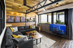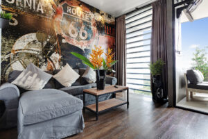 Welcome to C4, a spacious and modern apartment with private pool for up to six guests. Its industrial design, with black steel beams, high ceilings, and raw cement block walls, creates a unique yet cozy atmosphere. Colorful art pieces add warmth and cleverly conceal the bedroom doors.