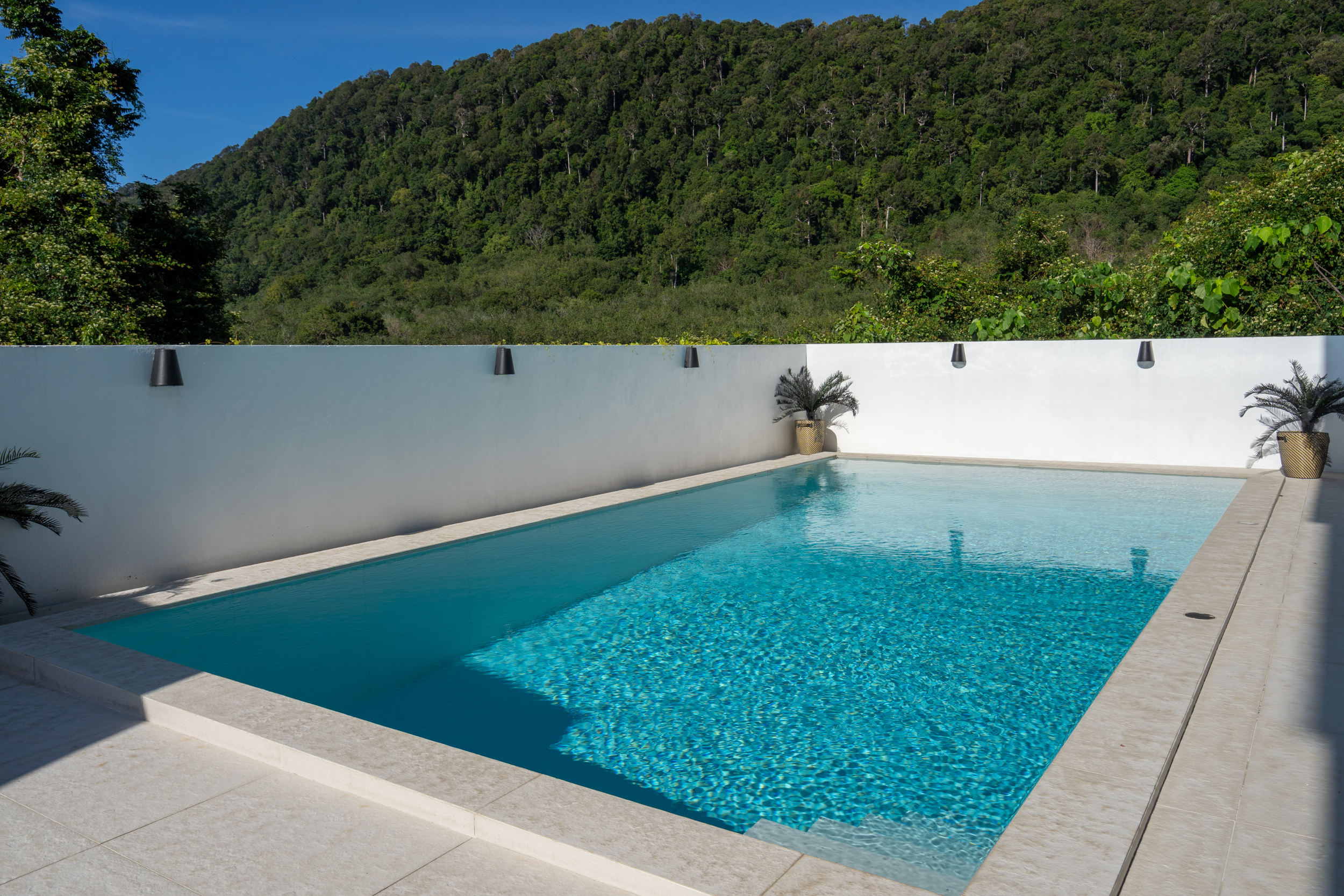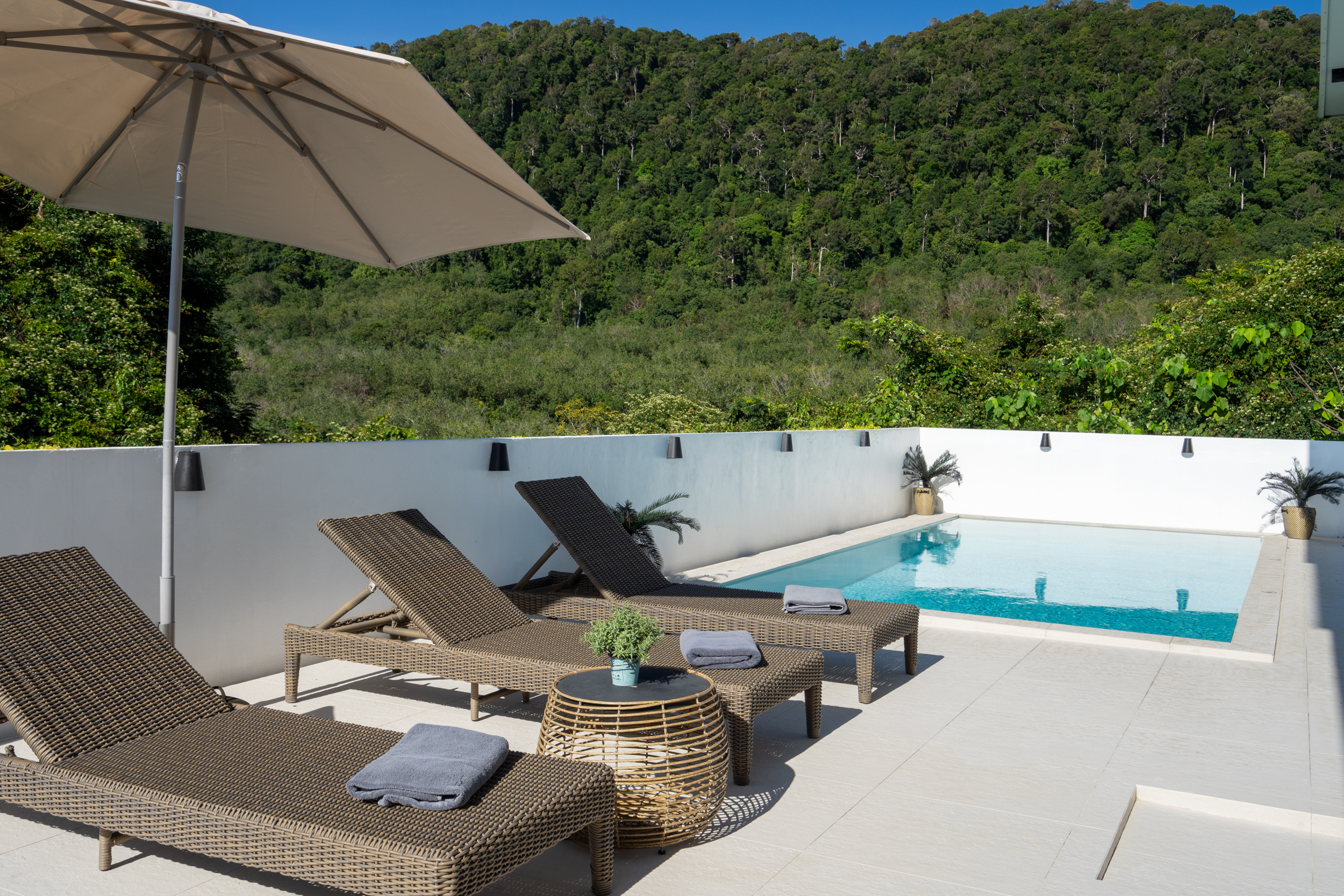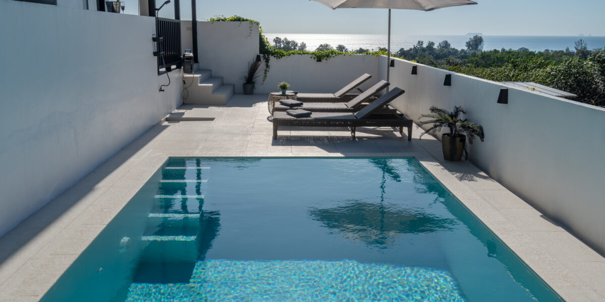 Just a few steps down from the terrace, you’ll find the 6×3 meter swimming pool, equipped with sunbeds, an umbrella, and breathtaking views of the mountains and ocean. Overlooking the pool is a bar table with stools, completing the perfect outdoor space for relaxation and entertainment.