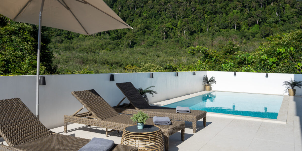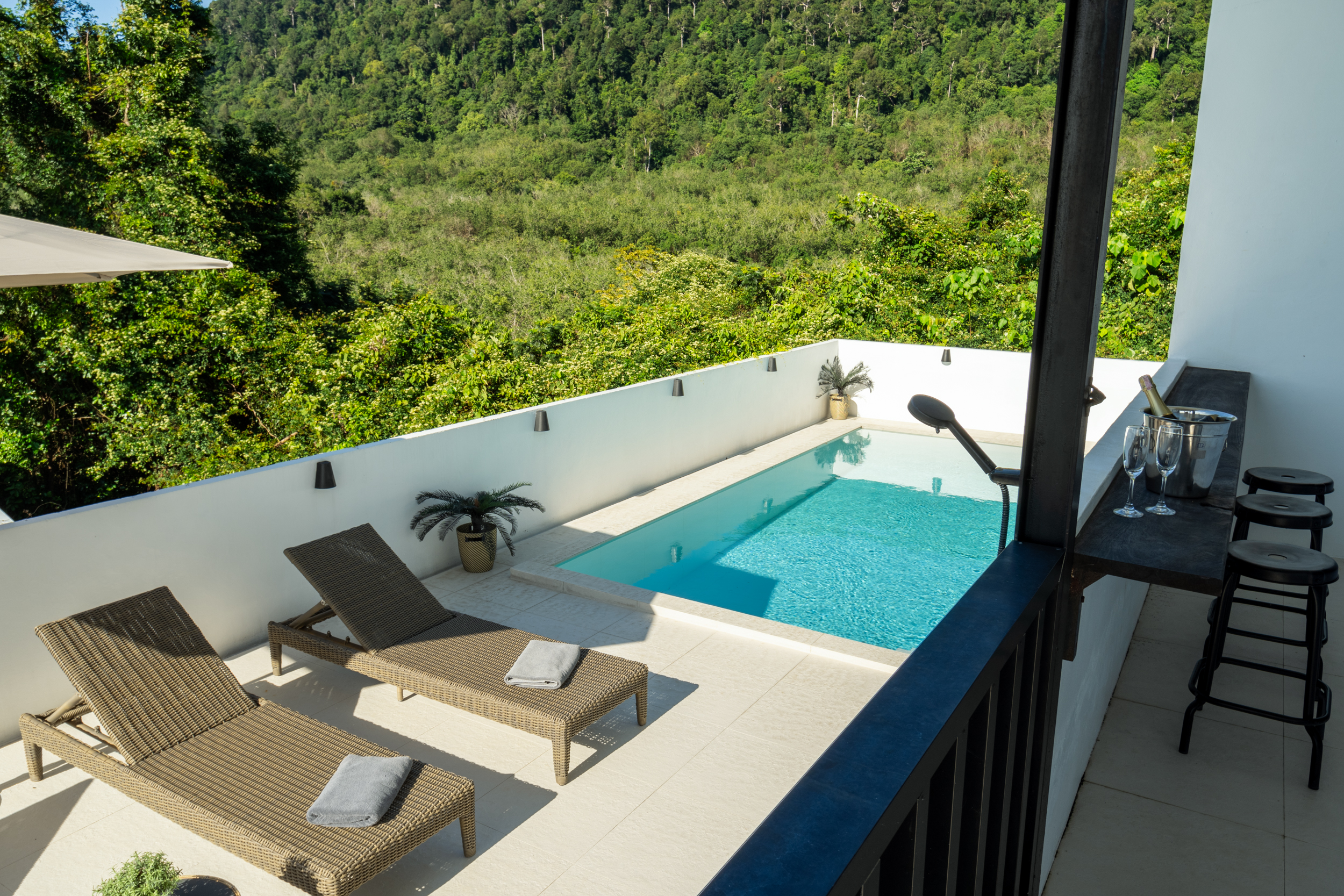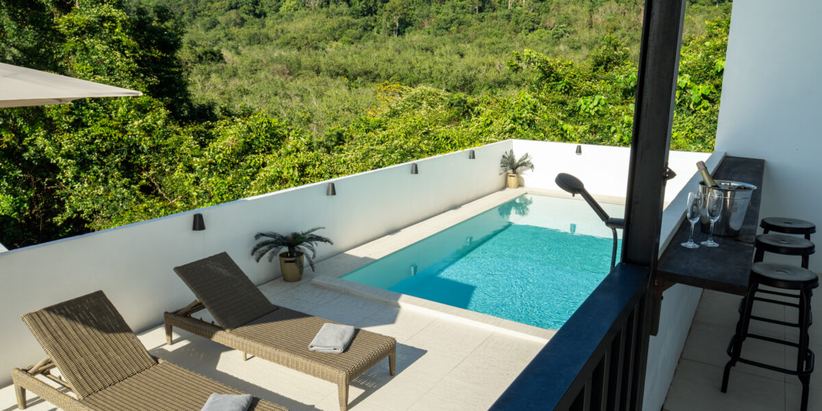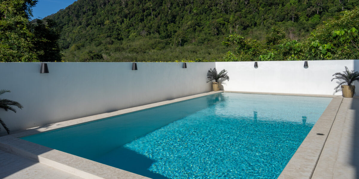 Just a few steps down from the terrace, you’ll find the 6×3 meter swimming pool, equipped with sunbeds, an umbrella, and breathtaking views of the mountains and ocean. Overlooking the pool is a bar table with stools, completing the perfect outdoor space for relaxation and entertainment.
