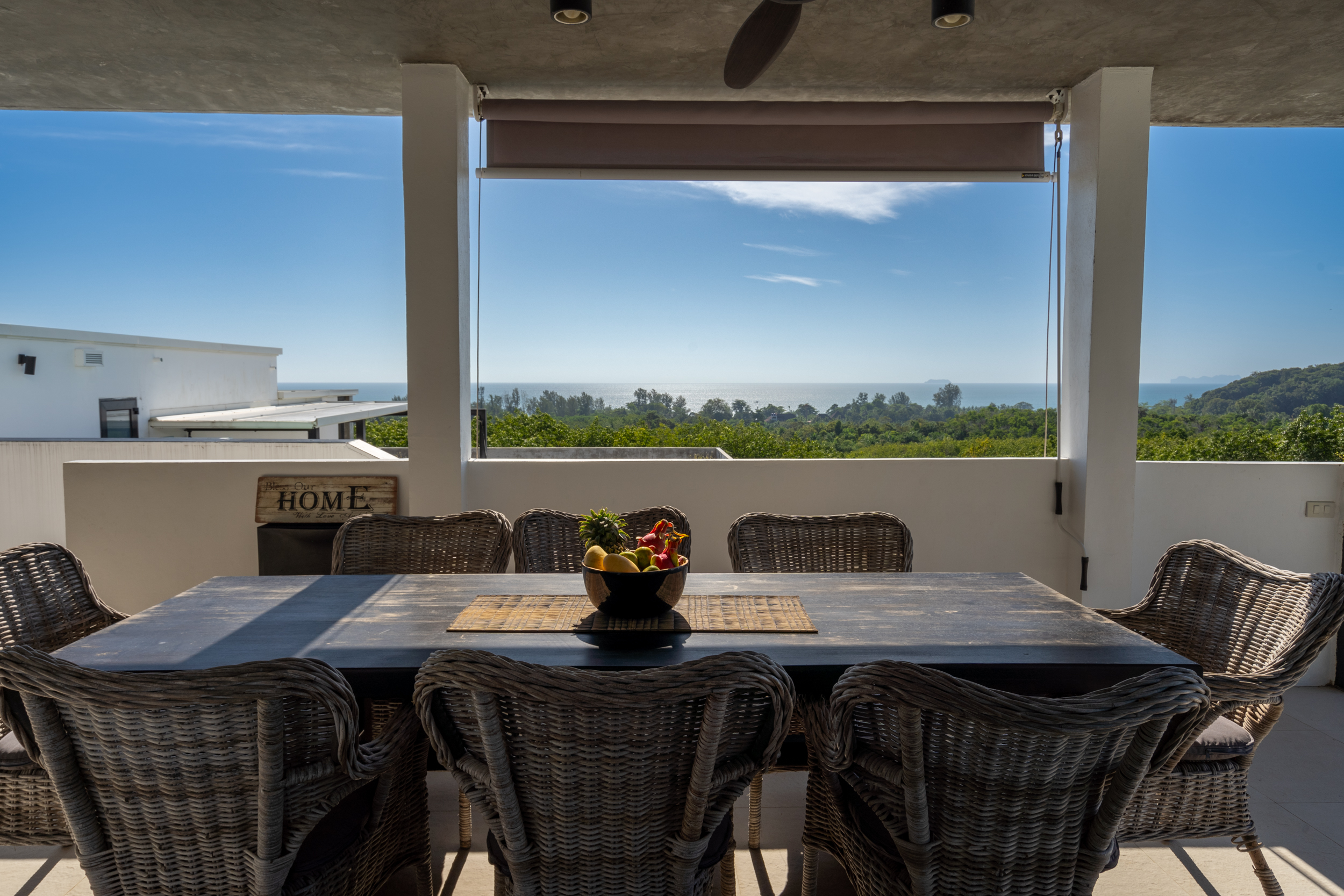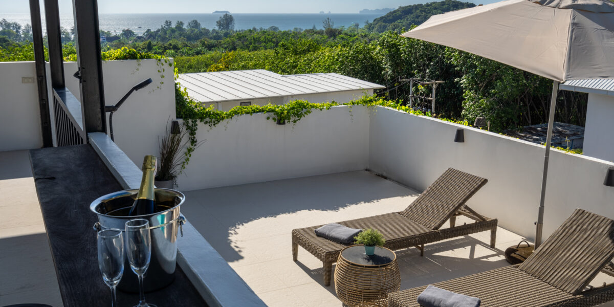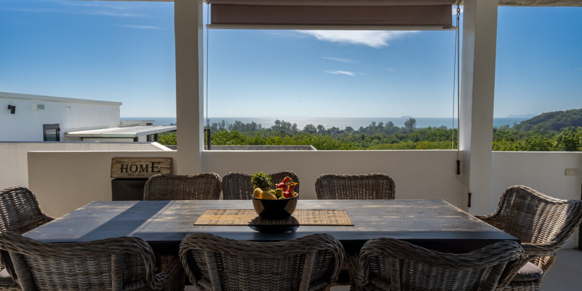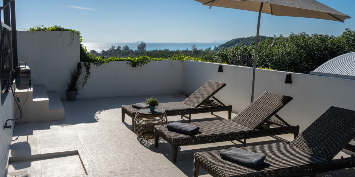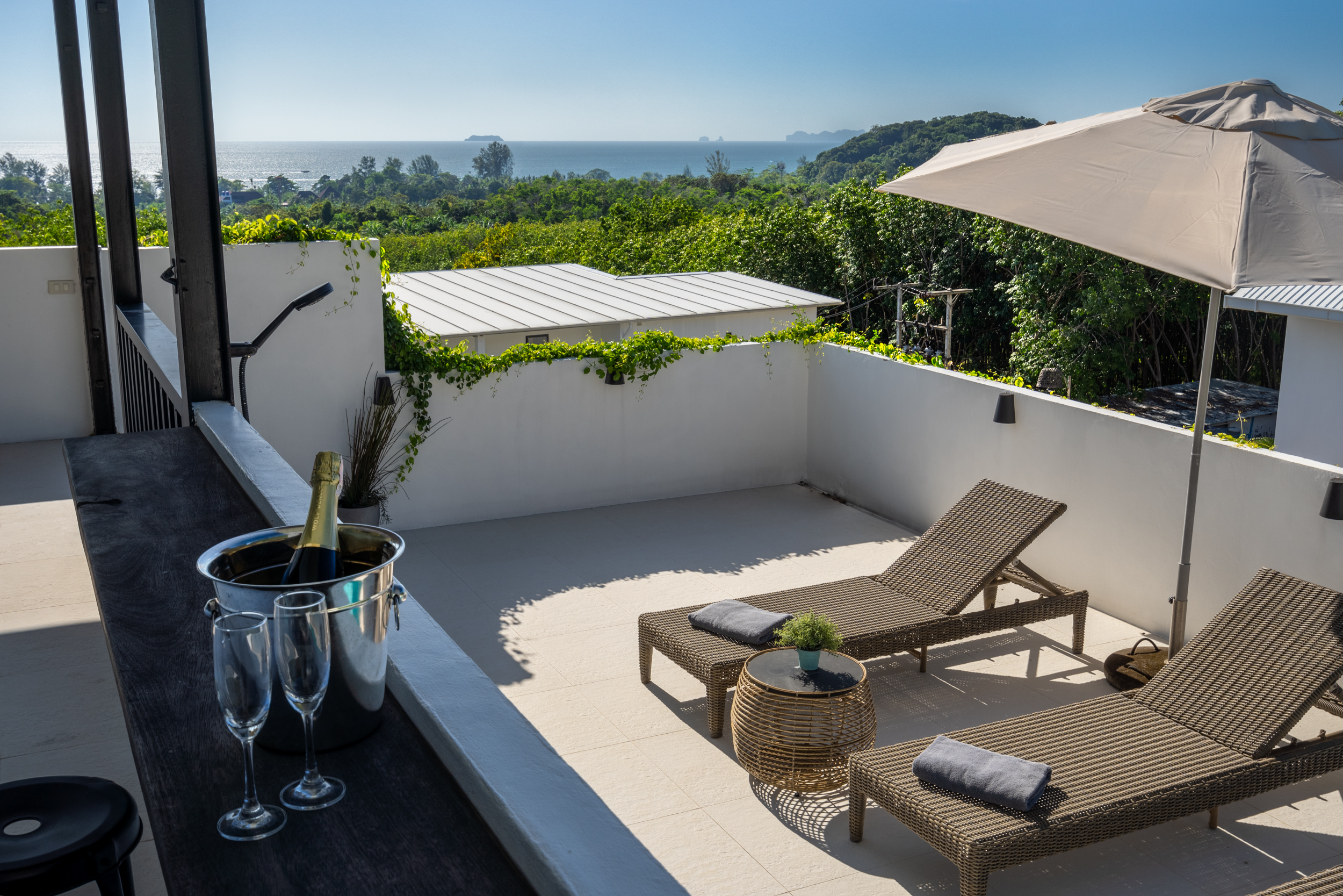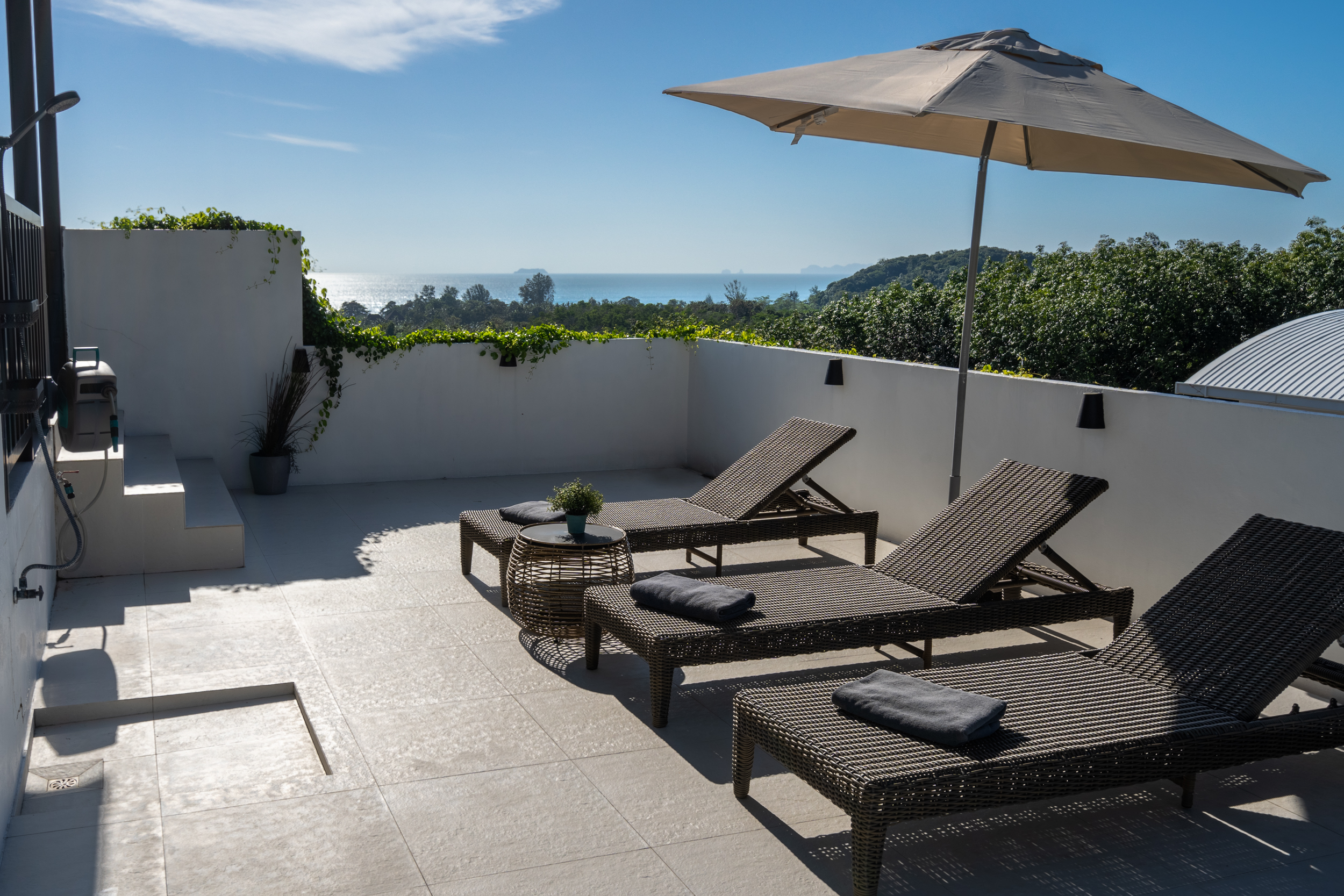 Step outside to your private terrace, where you’ll find a luxurious lounge area with a large U-shaped sofa and a dining table seating eight, perfect for enjoying the sunset.