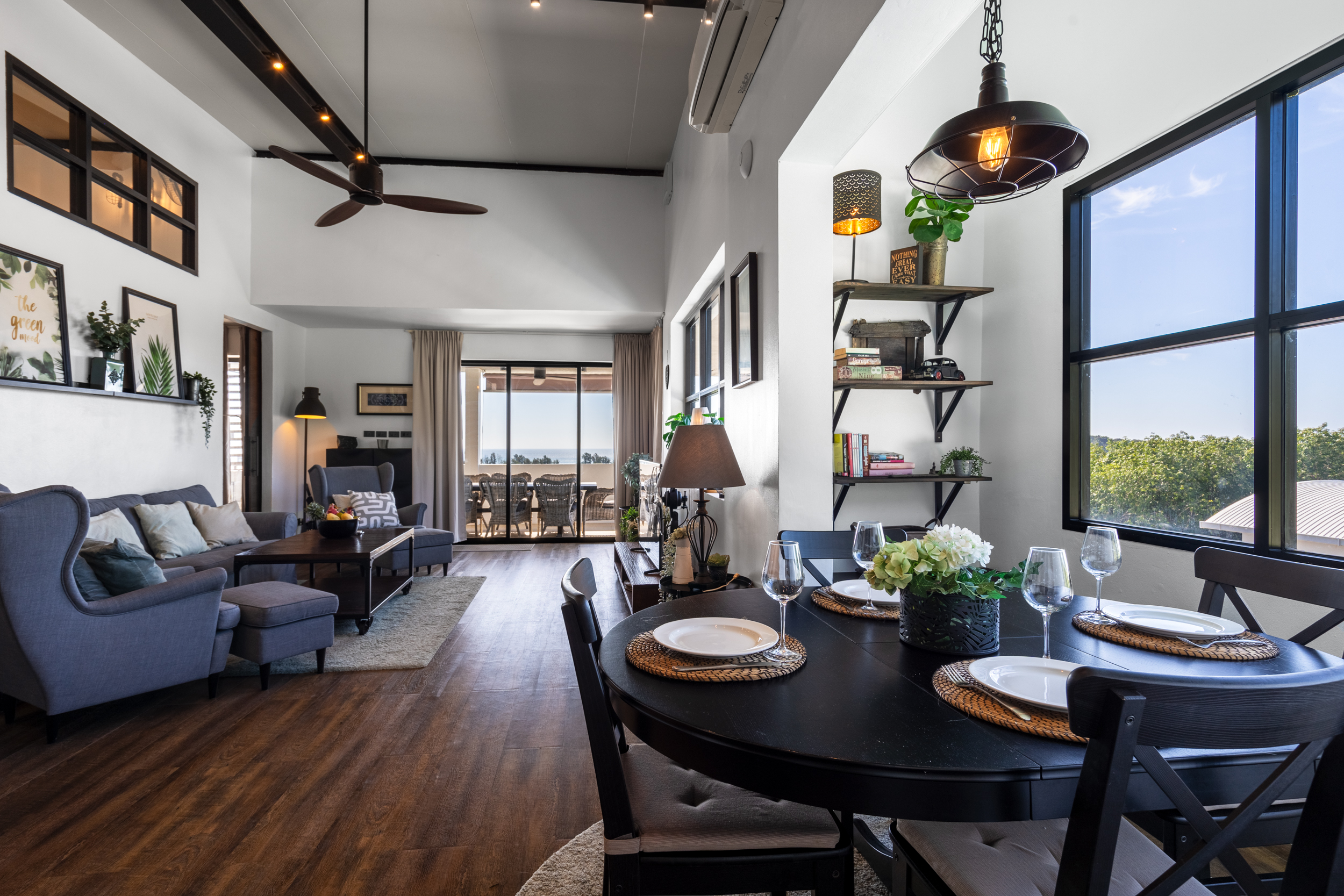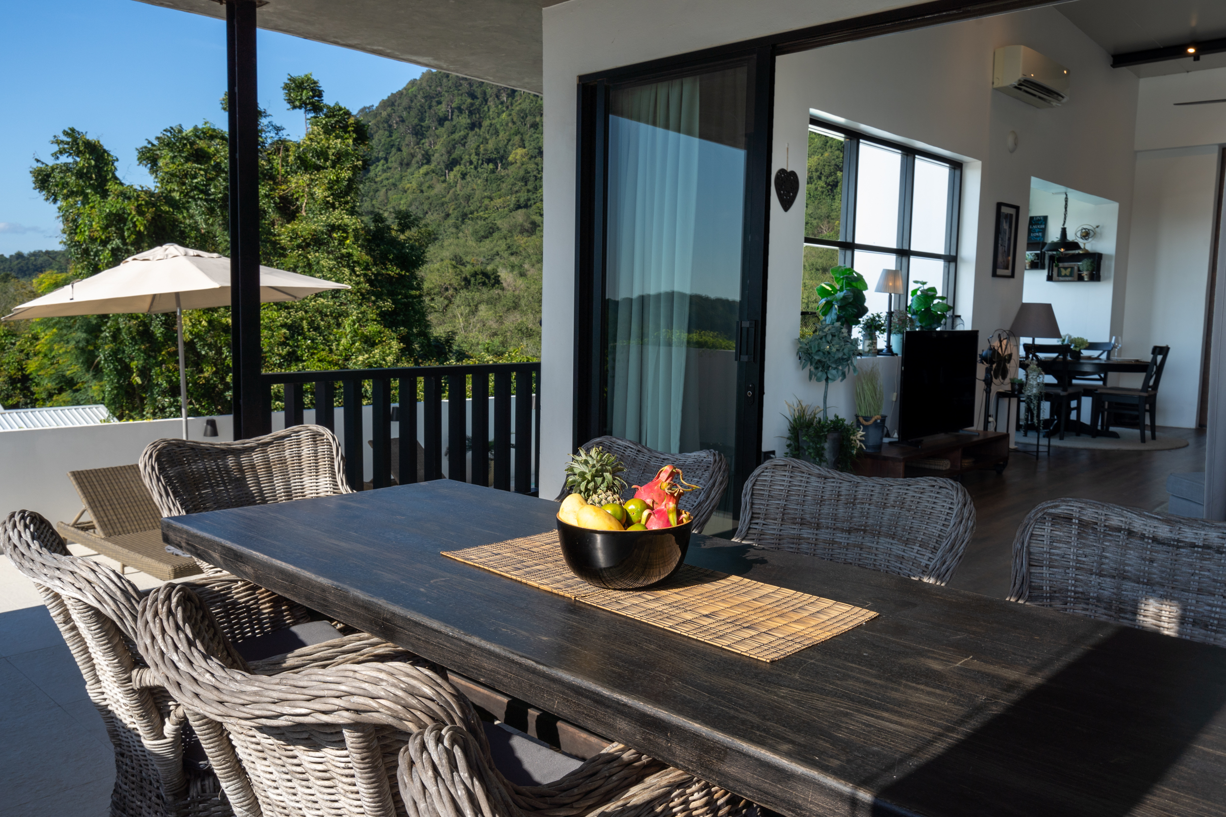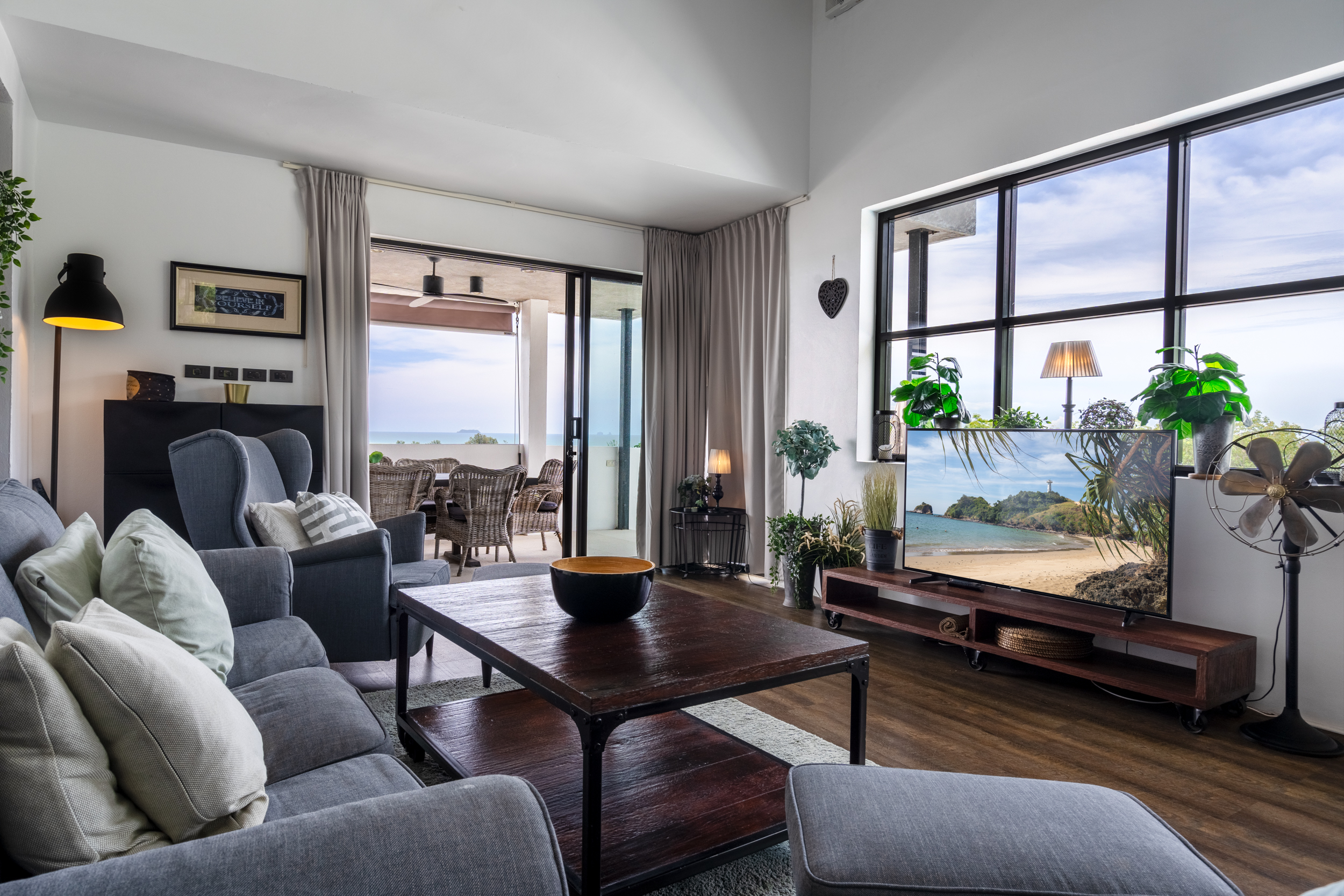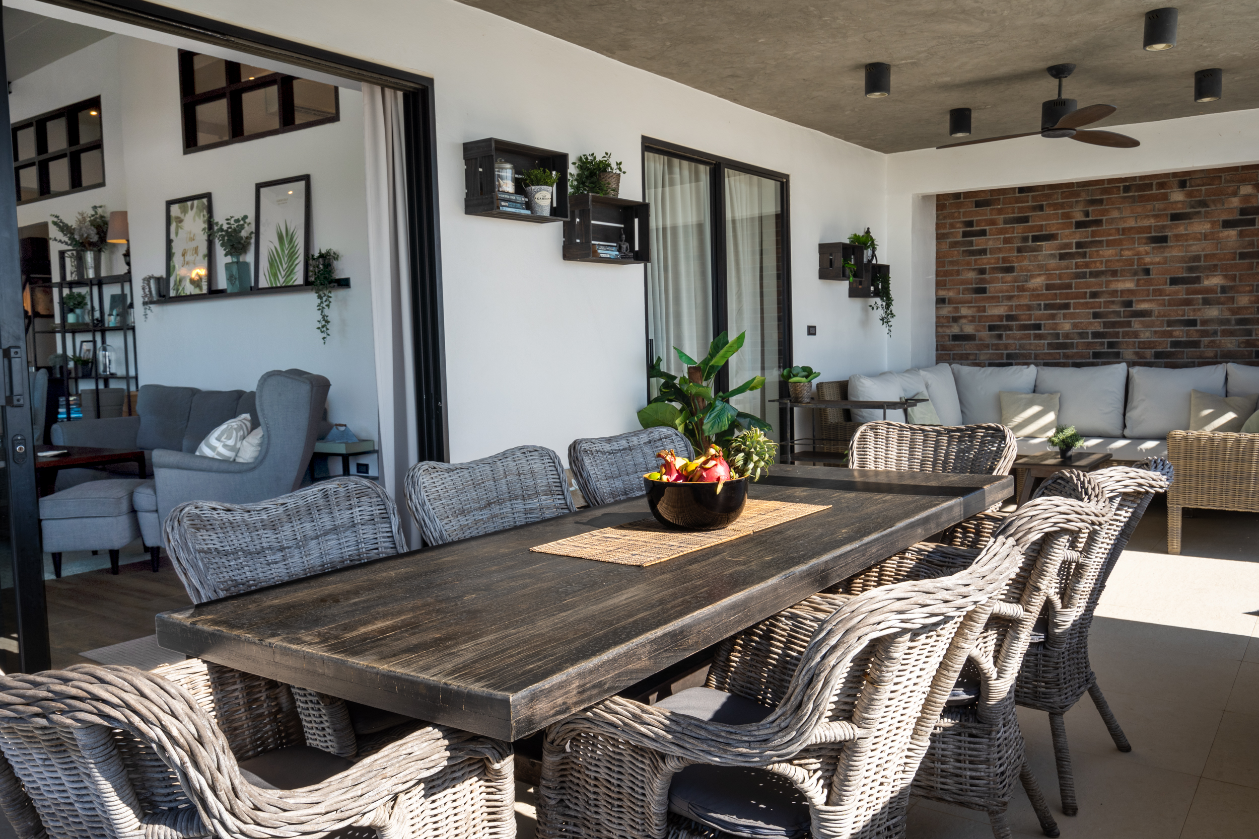 Step outside to your private terrace, where you’ll find a luxurious lounge area with a large U-shaped sofa and a dining table seating eight, perfect for enjoying the sunset.