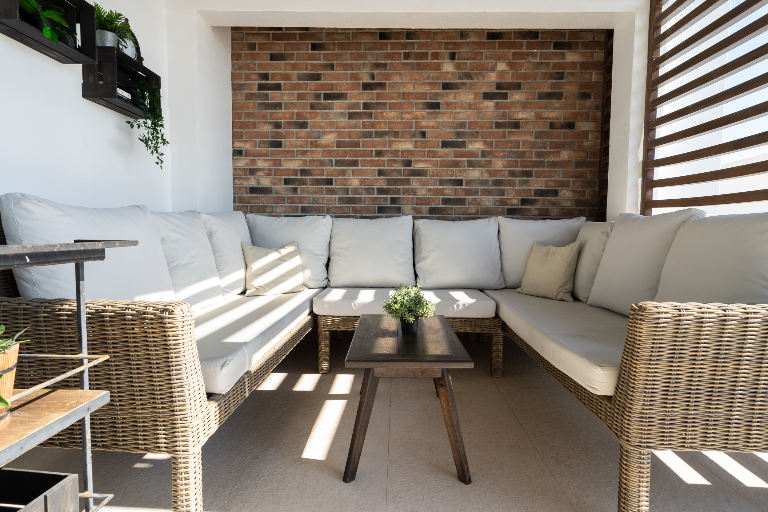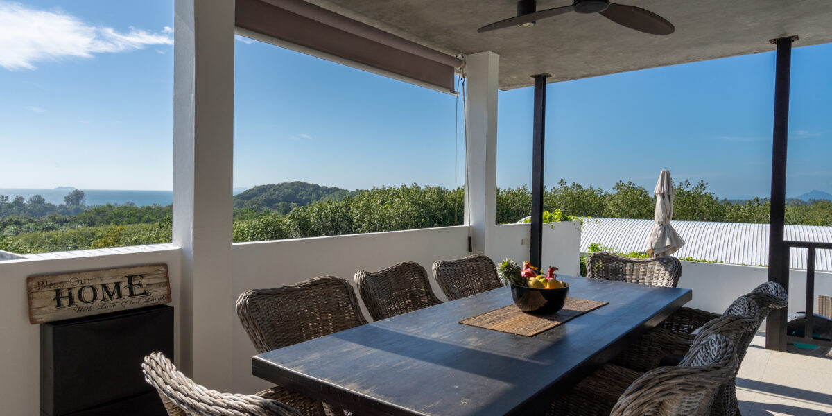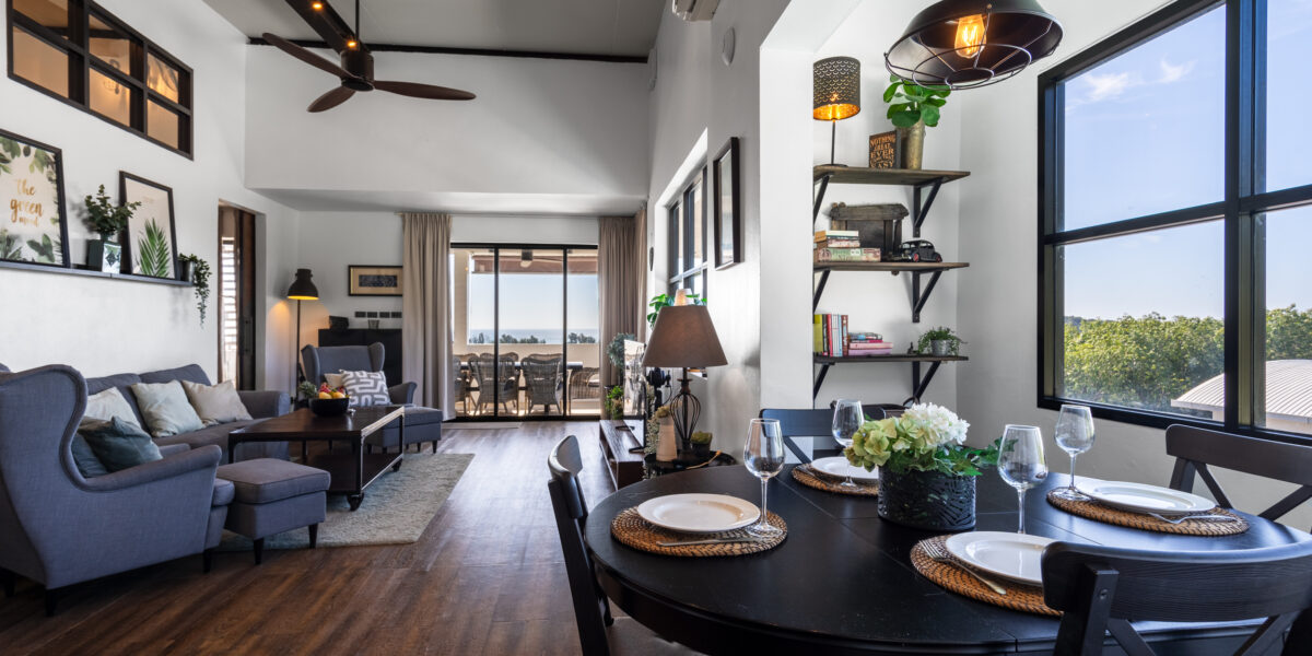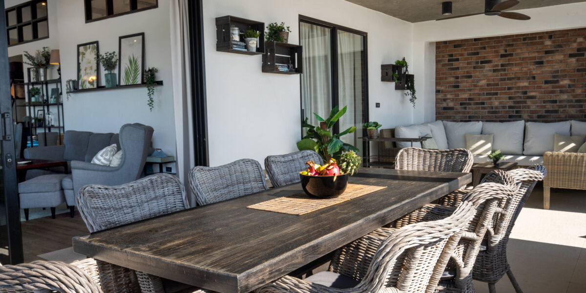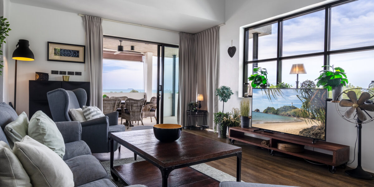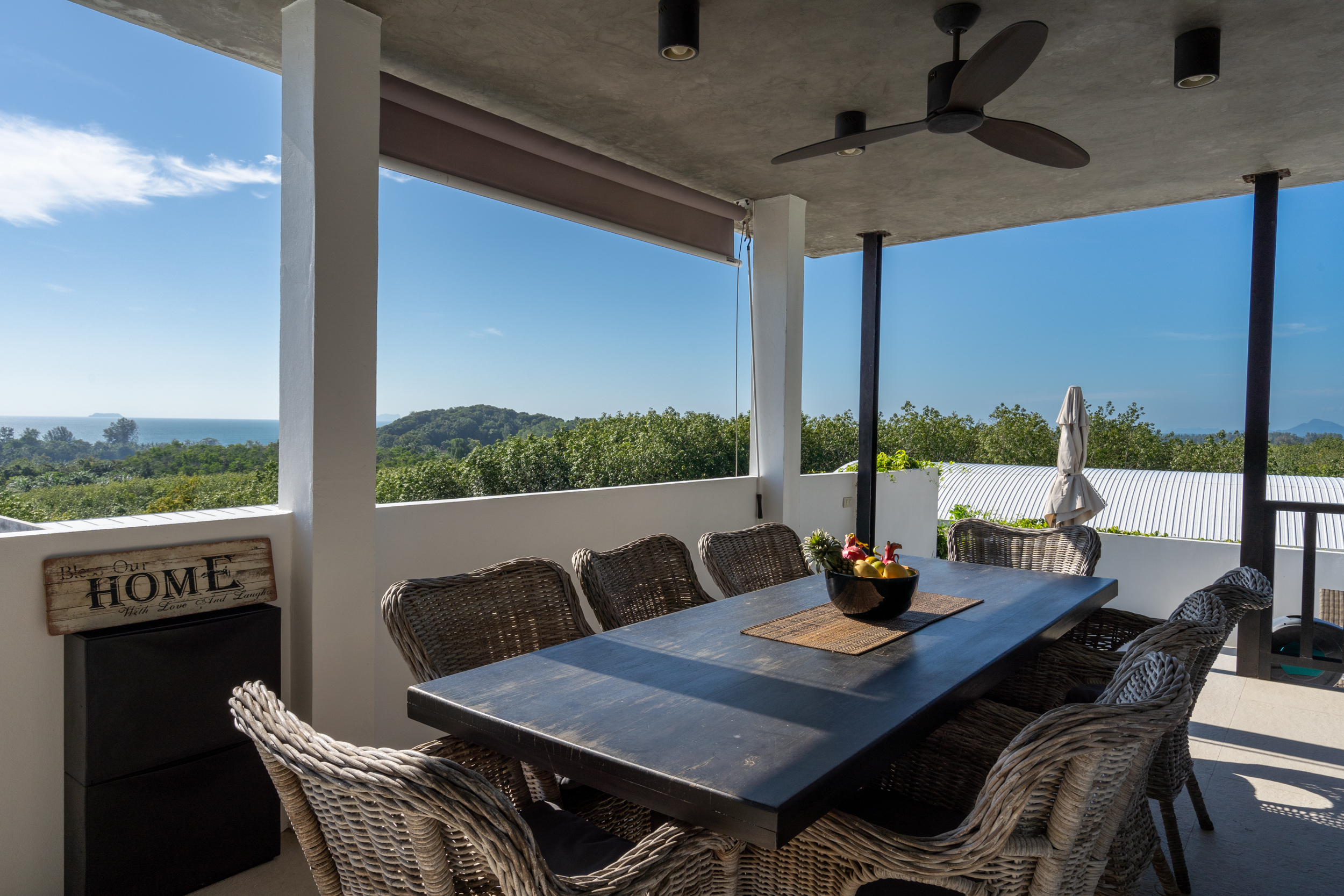 Step outside to your private terrace, where you’ll find a luxurious lounge area with a large U-shaped sofa and a dining table seating eight, perfect for enjoying the sunset.