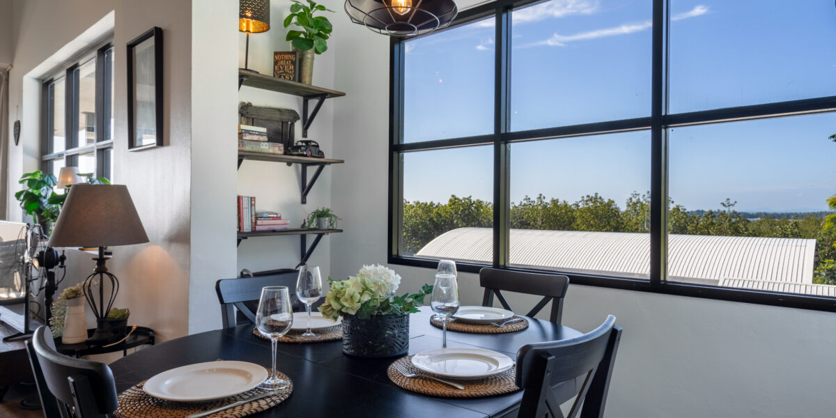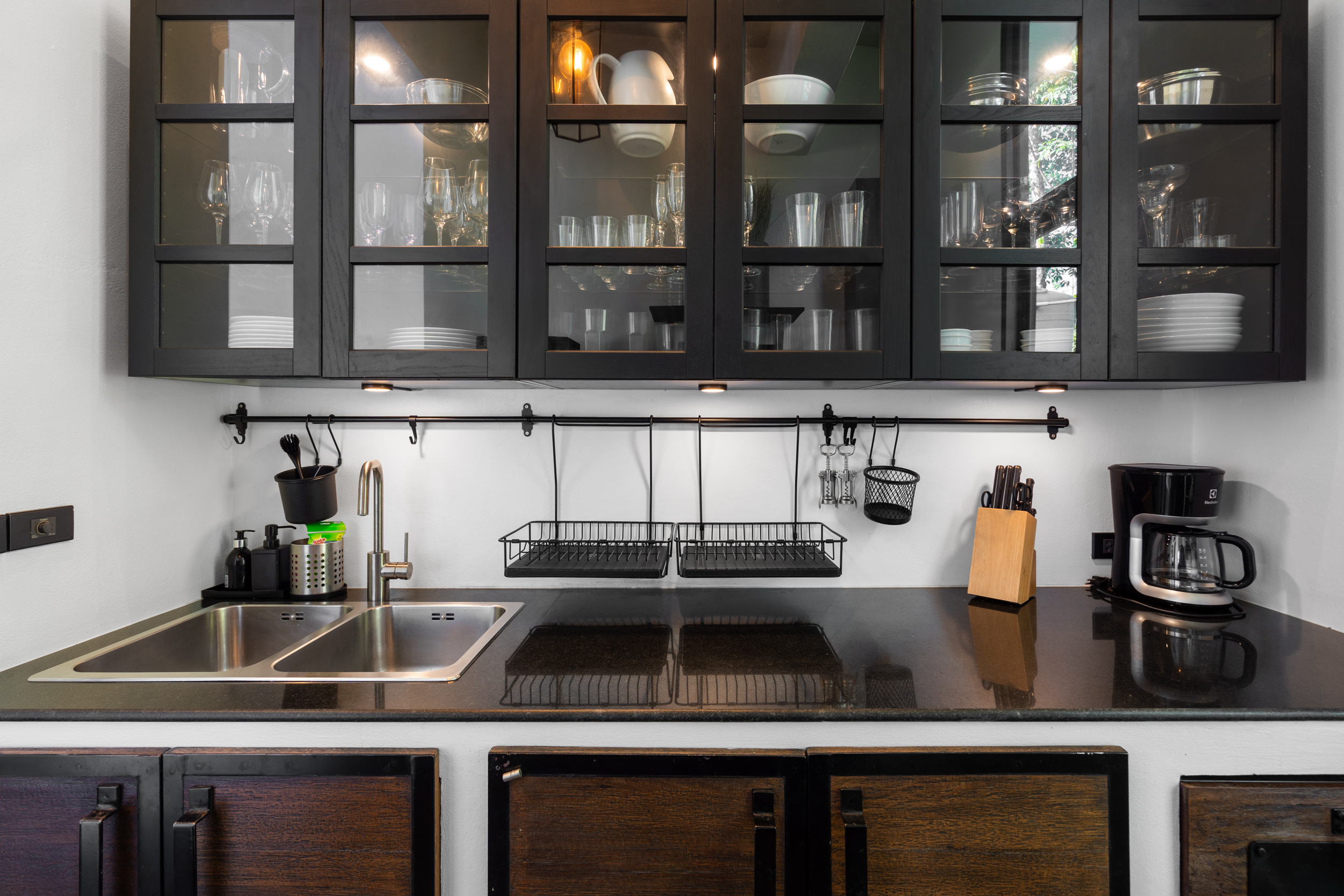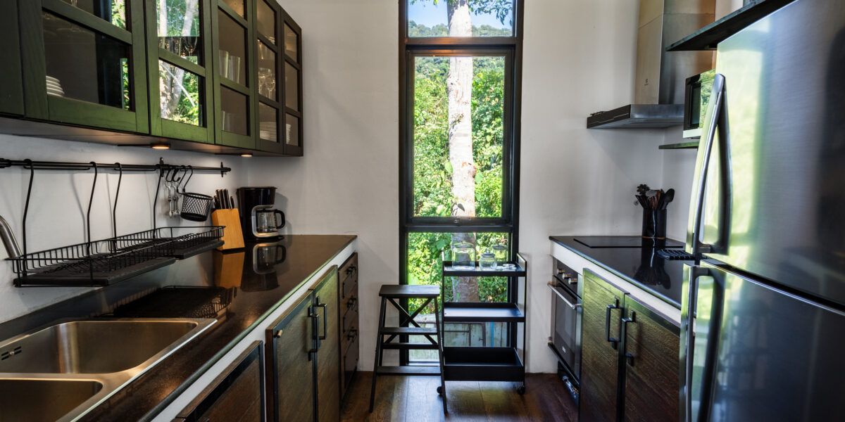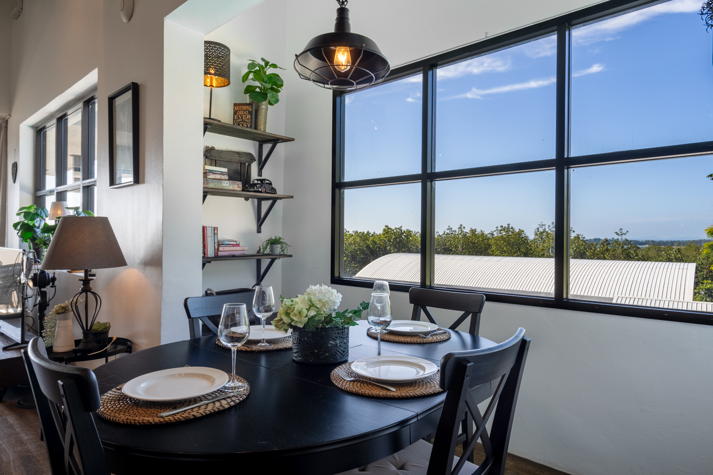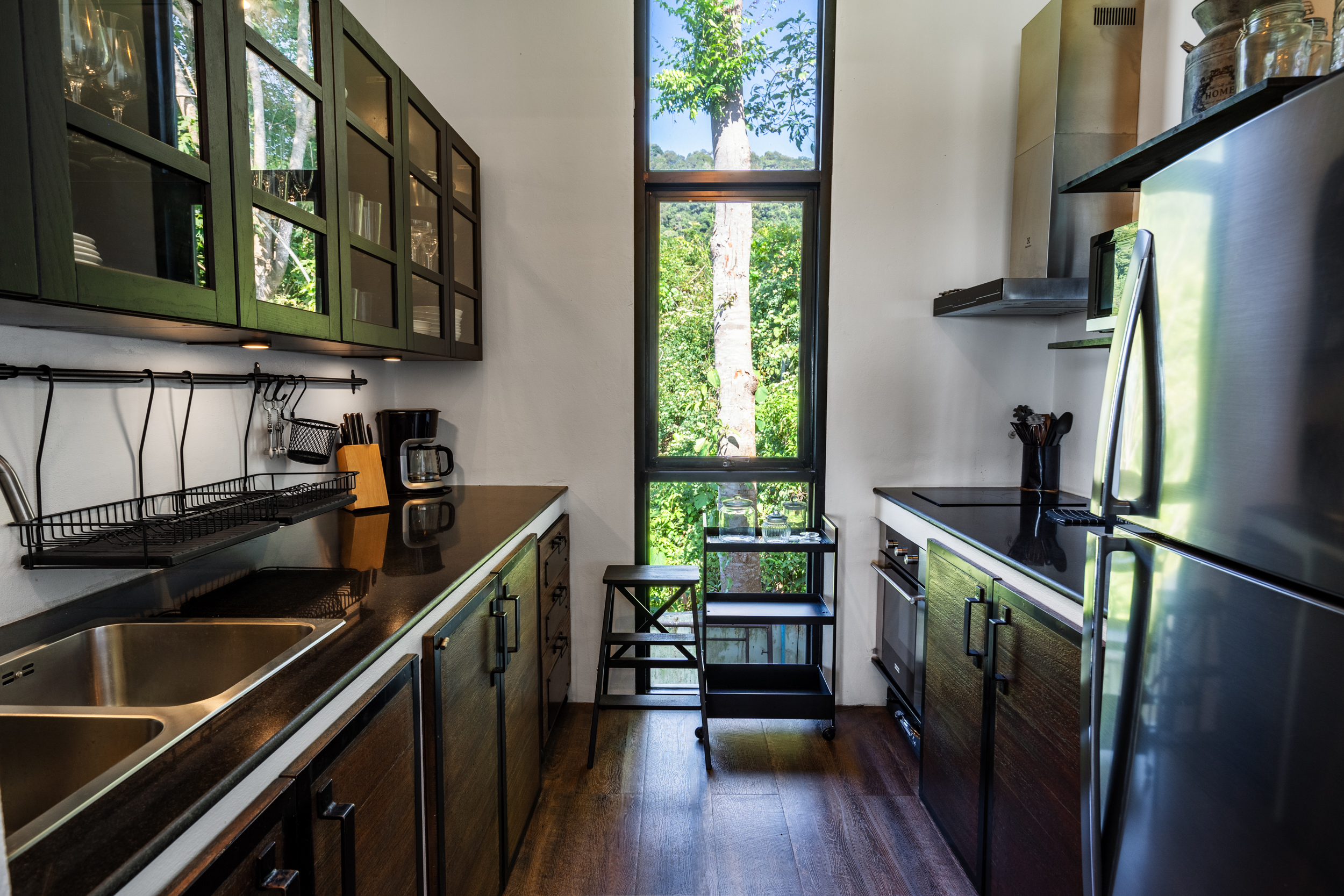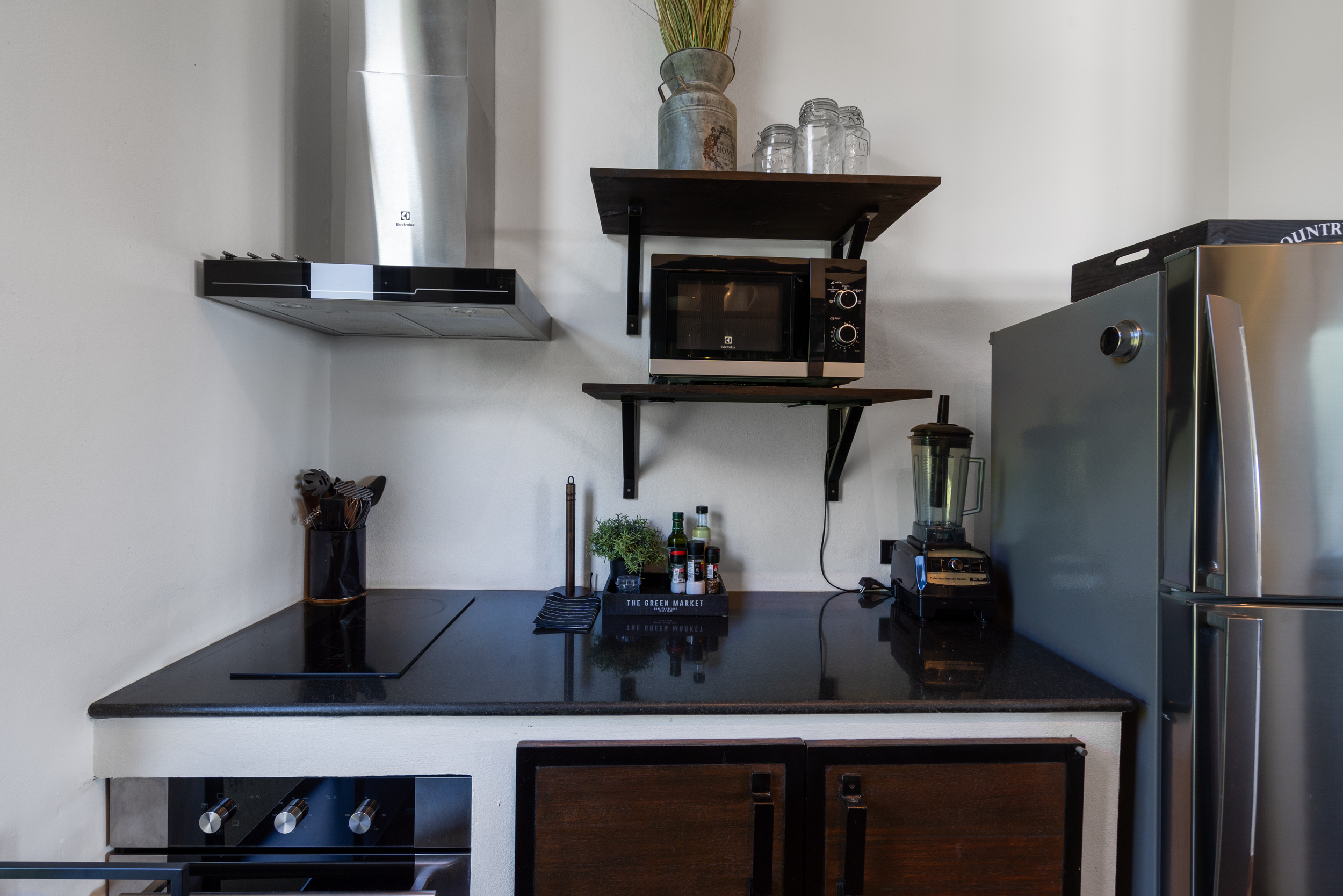 The fully equipped kitchen has everything you need for a seamless stay, including a two-burner cooktop, oven, microwave, full-size refrigerator, toaster, coffee machine, and all essential cookware and utensils. The dining areas features flexible seating with an expandable table indoors, and a large outdoor dining table.