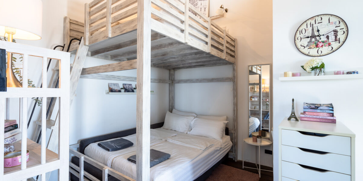 The second bedroom offers a double bunk bed with queen-size beds on both levels. The bottom bed easily converts into a sofa, creating a cozy. TV area with a 43-inch smart TV. This room also includes a work desk and a walk-in closet.