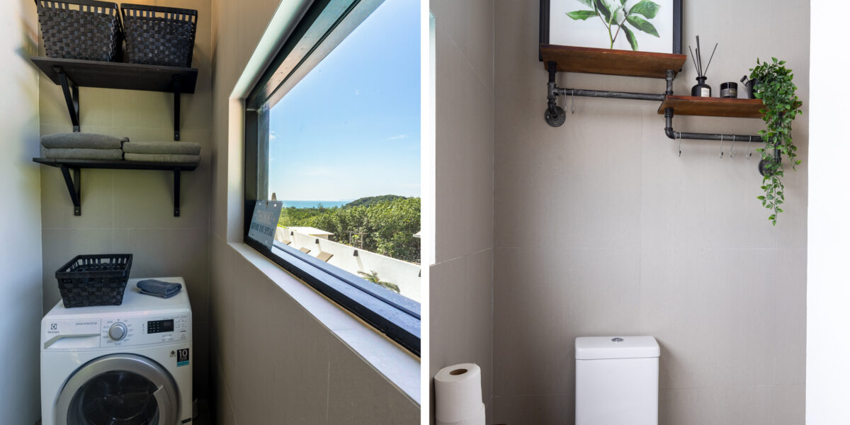 The living area has a large smart TV, a comfortable sofa, and two armchairs, providing a welcoming space to relax. There’s also a huge bathroom with a washer/dryer for added convenience.