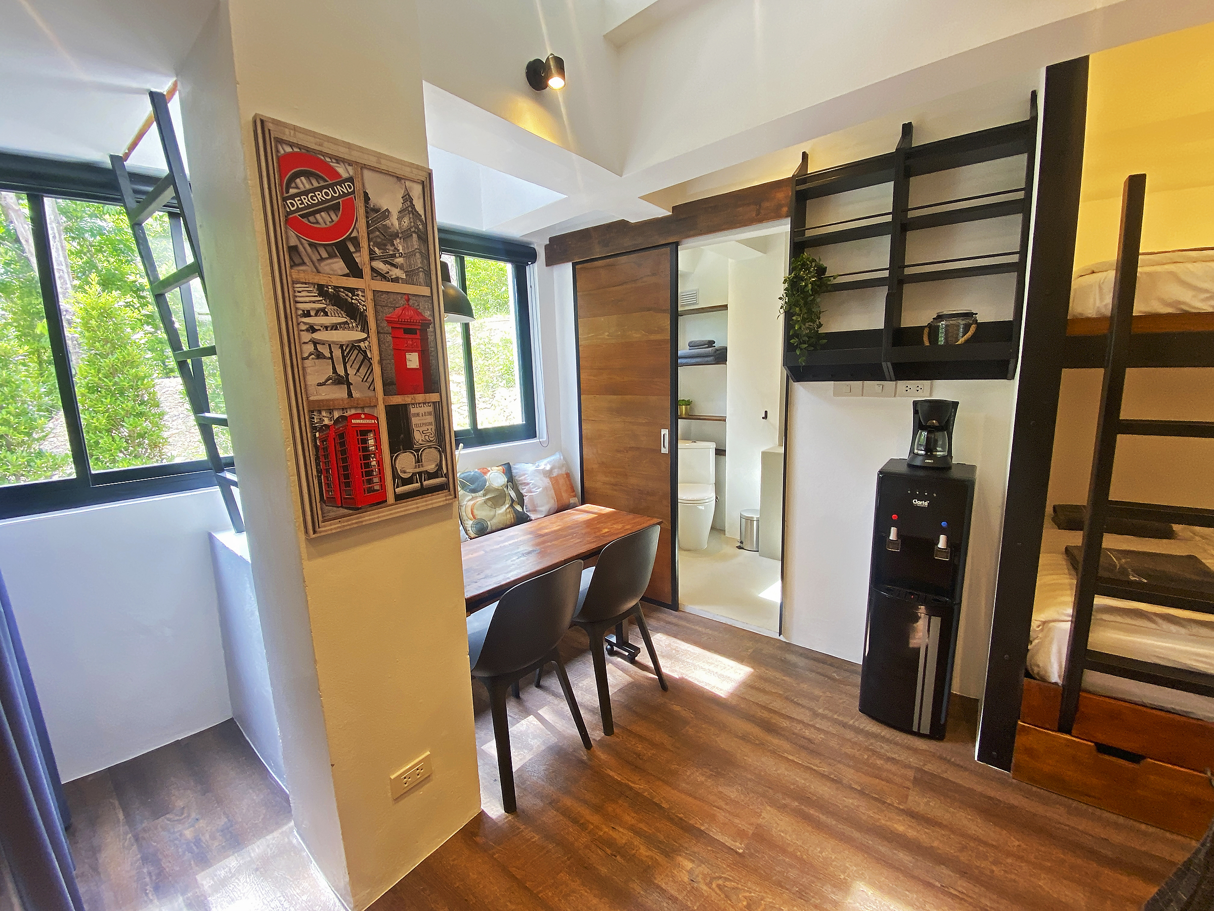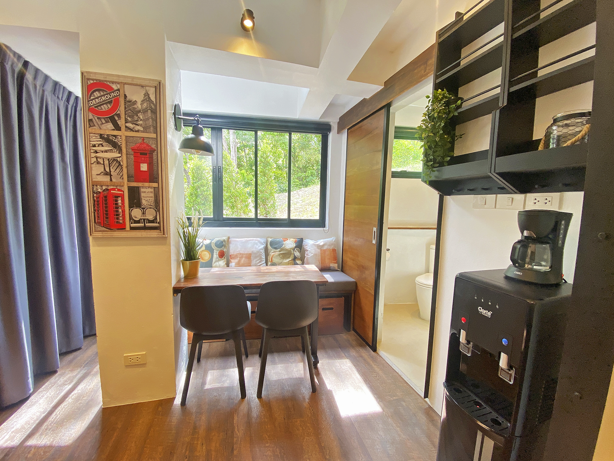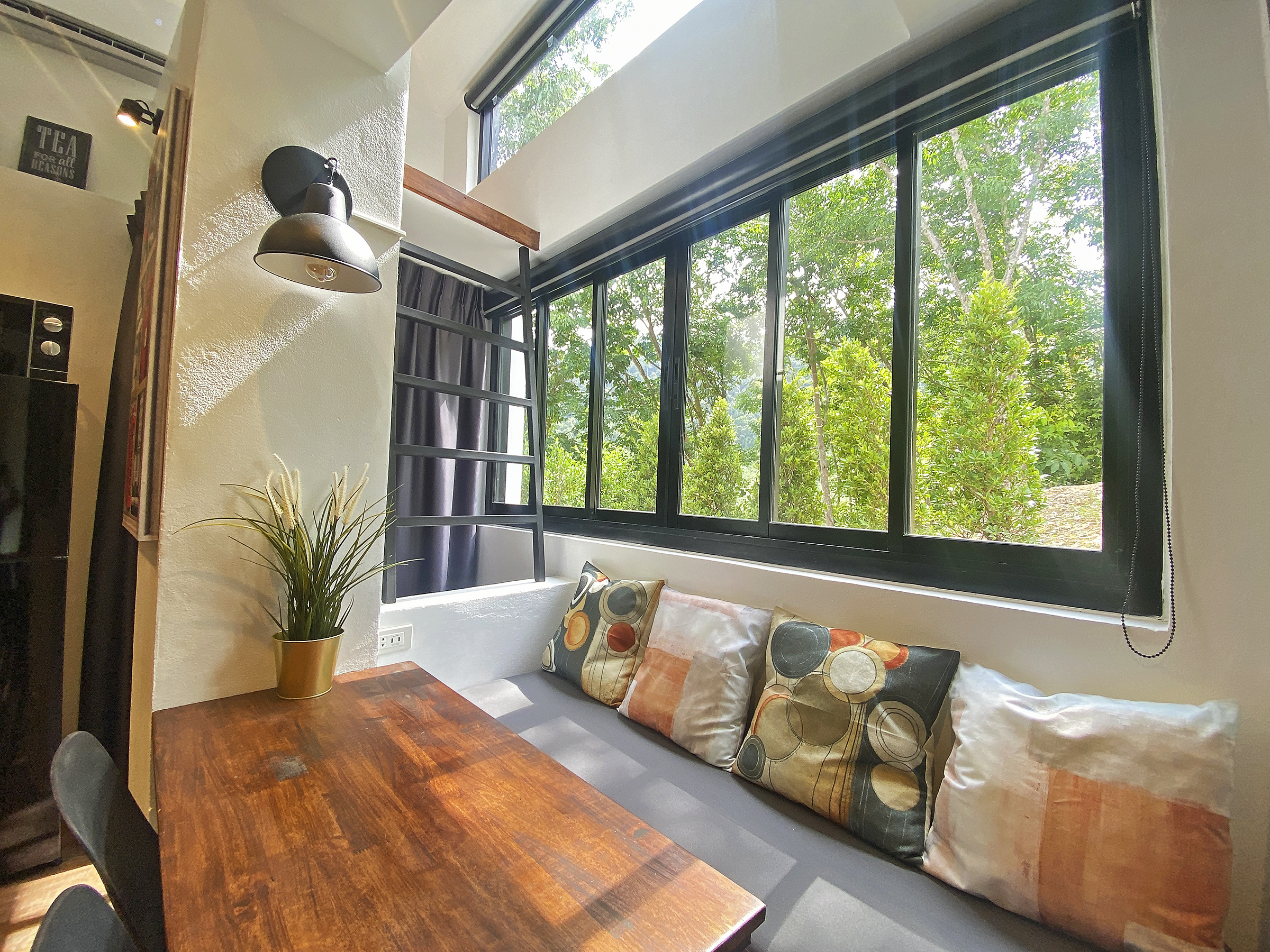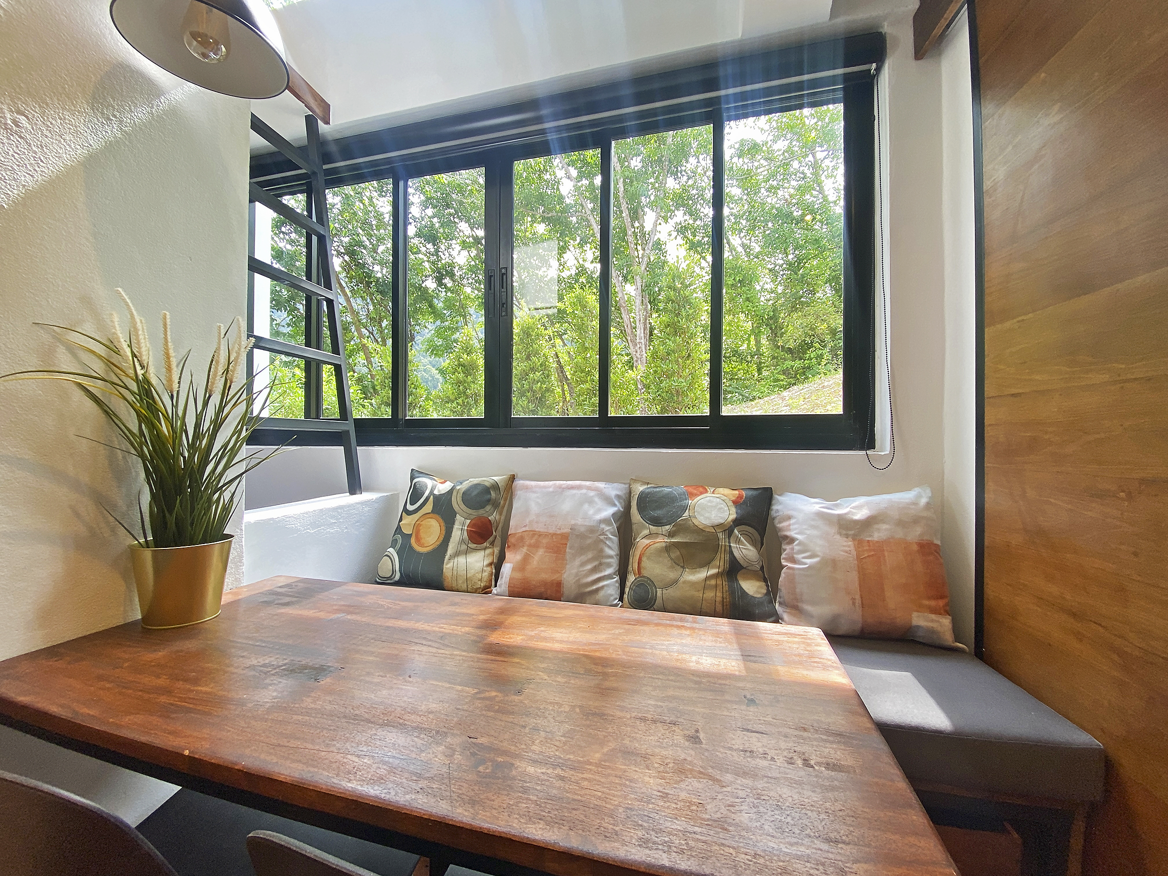 A large window along the back wall allows the morning sun to brighten the room, while offering beautiful and relaxing views of the trees, mountains, and jungle behind the property. The main area is multifunctional, with comfy bench seating and two chairs that provide dining space for four. The space is also perfect for work, thanks to the many outlets and USB chargers available. The TV rotates out from the wall, transforming the area into a cozy living room, ideal for watching a movie or relaxing after a day of exploration. High-speed internet, and air conditioning add to your comfort.