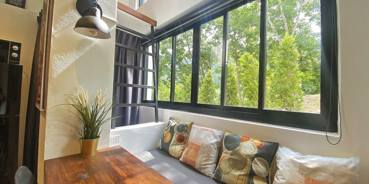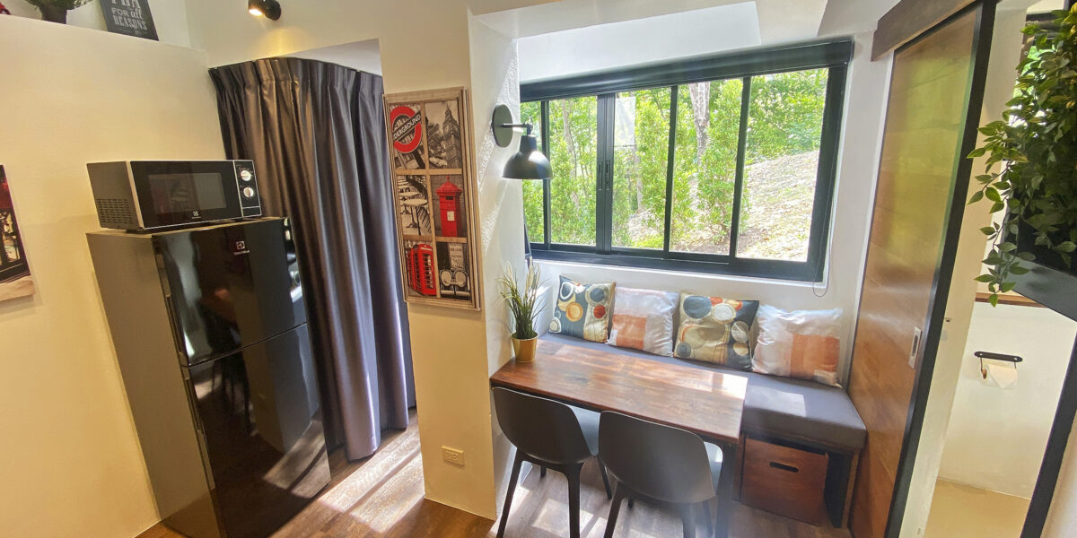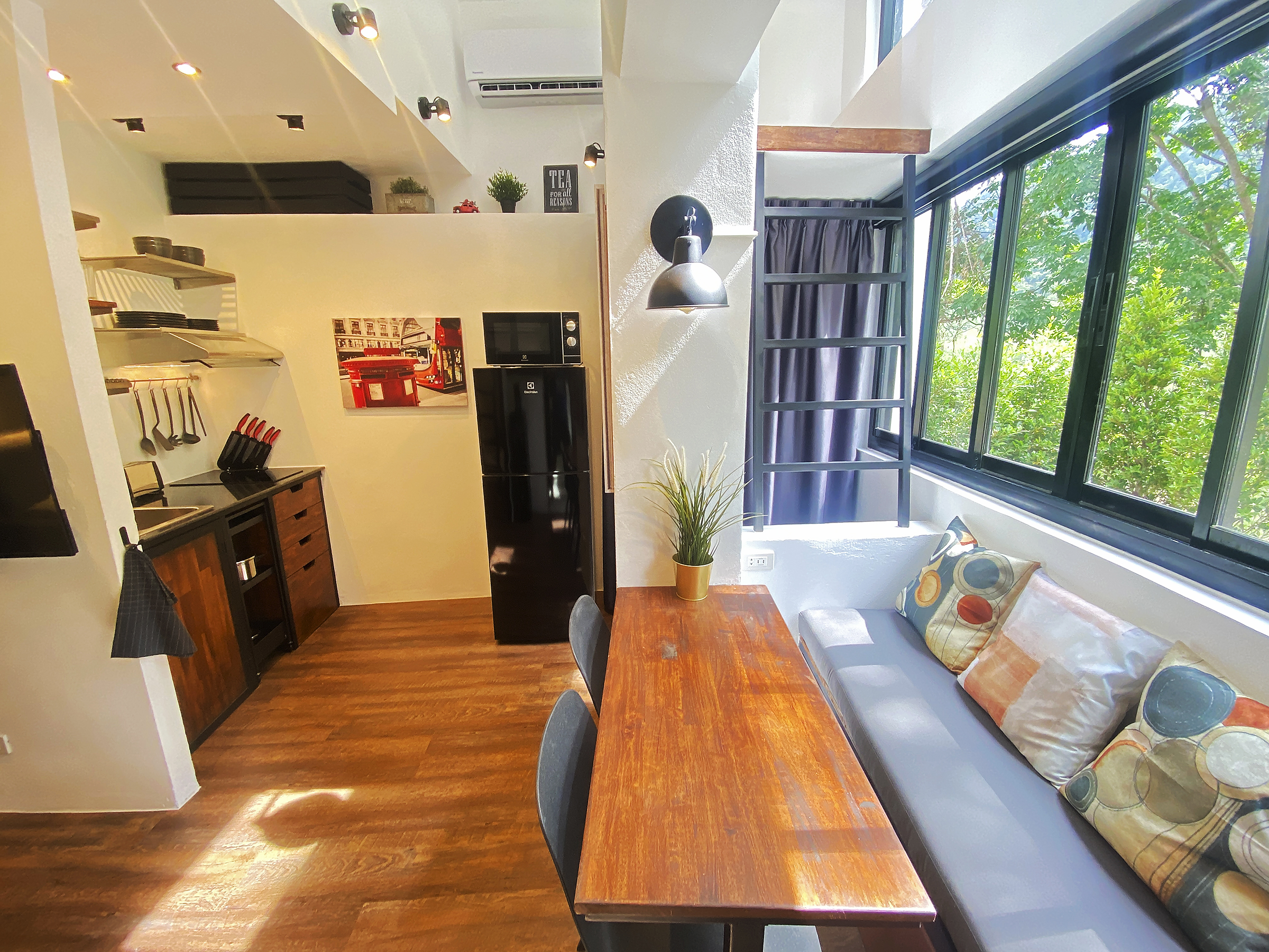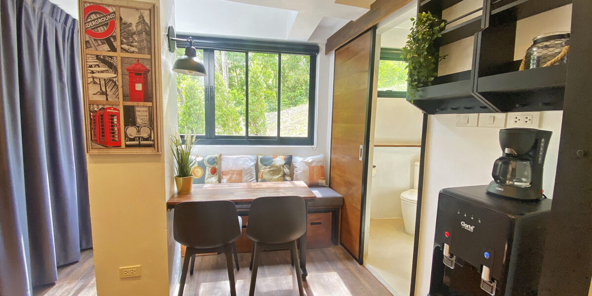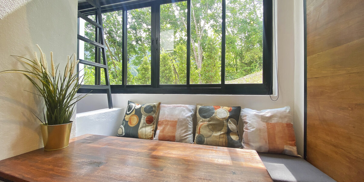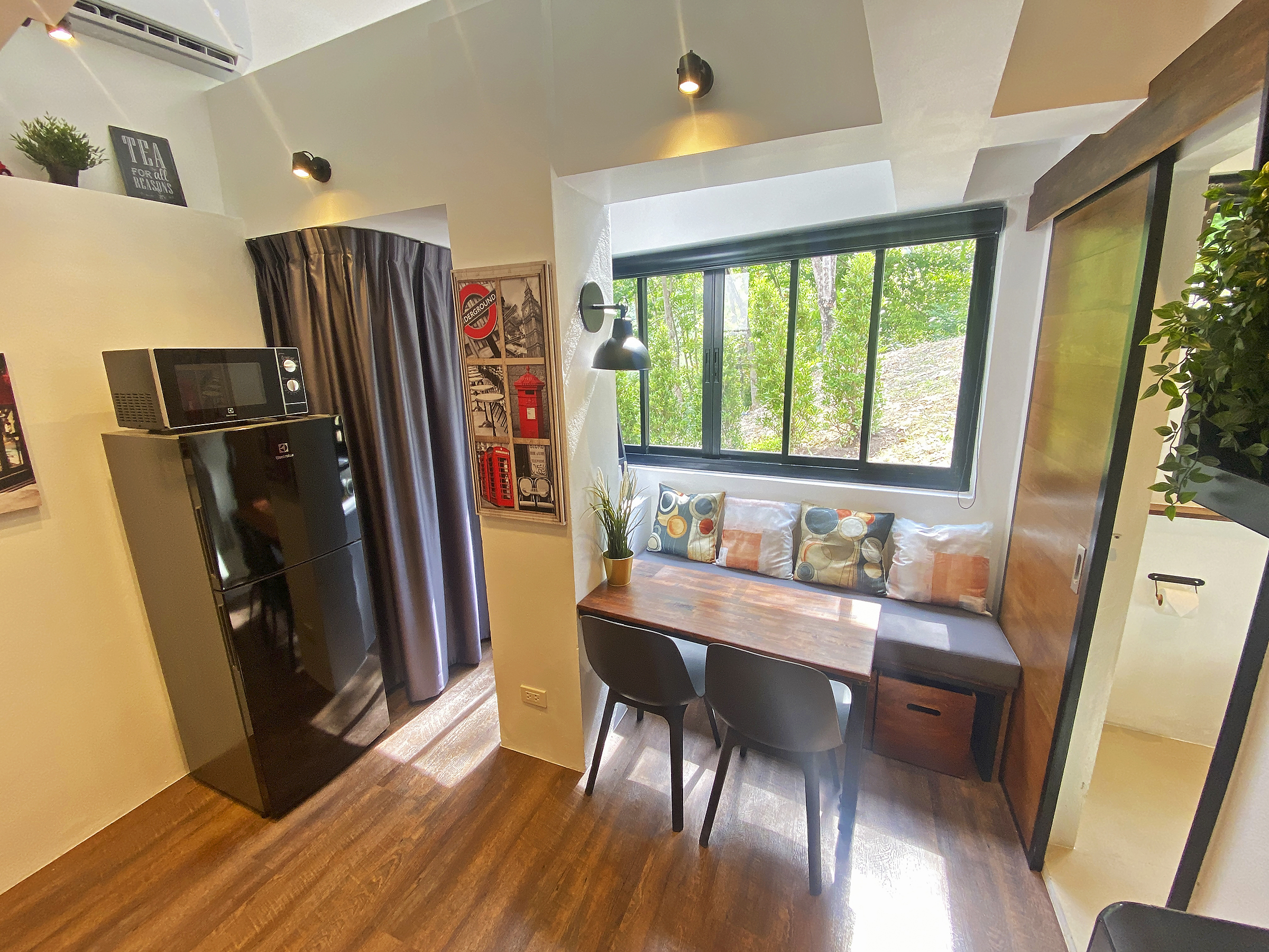 A large window along the back wall allows the morning sun to brighten the room, while offering beautiful and relaxing views of the trees, mountains, and jungle behind the property. The main area is multifunctional, with comfy bench seating and two chairs that provide dining space for four. The space is also perfect for work, thanks to the many outlets and USB chargers available. The TV rotates out from the wall, transforming the area into a cozy living room, ideal for watching a movie or relaxing after a day of exploration. High-speed internet, and air conditioning add to your comfort.