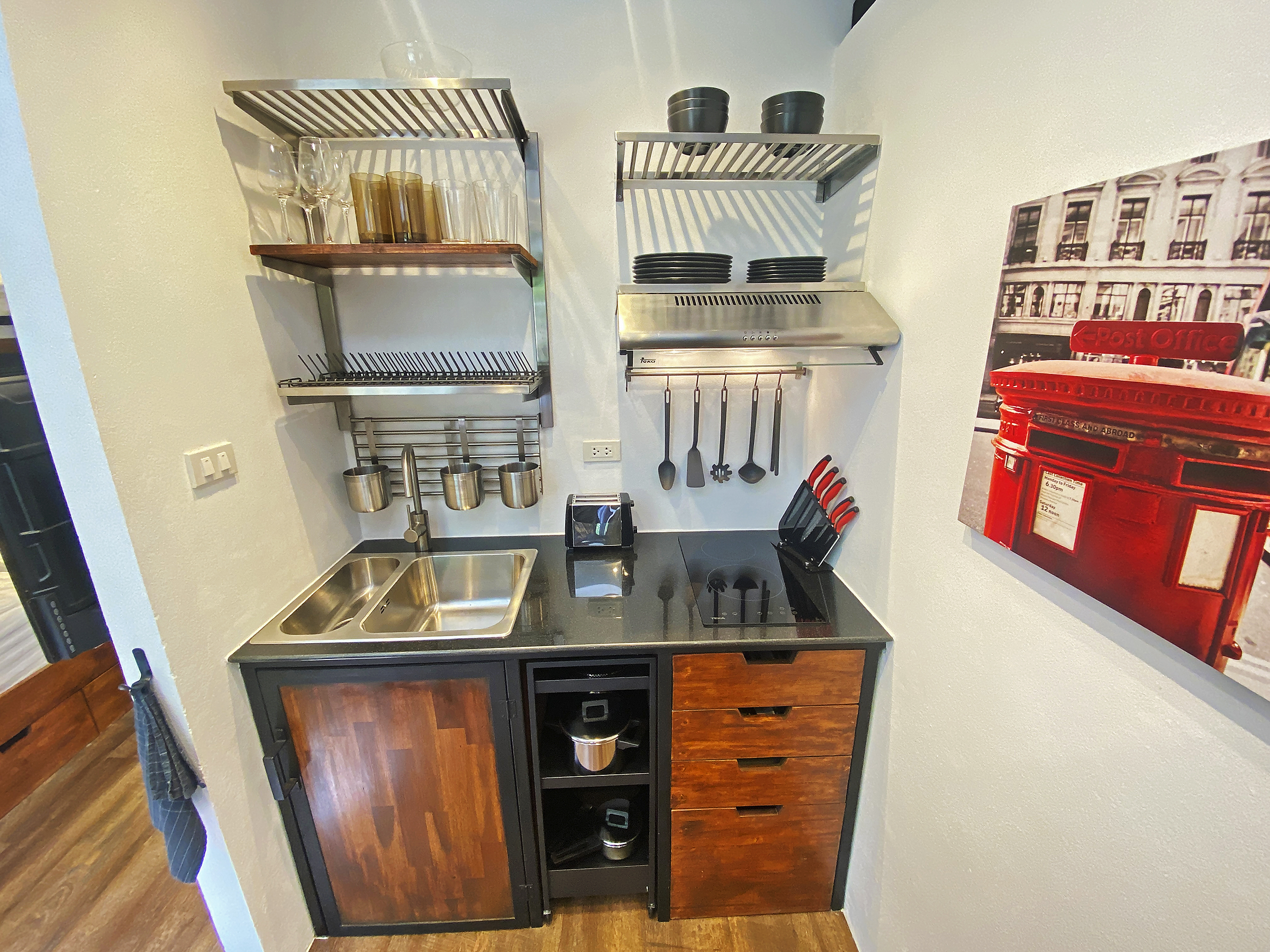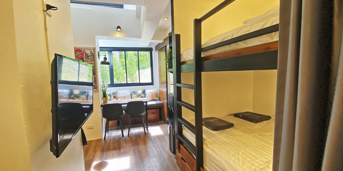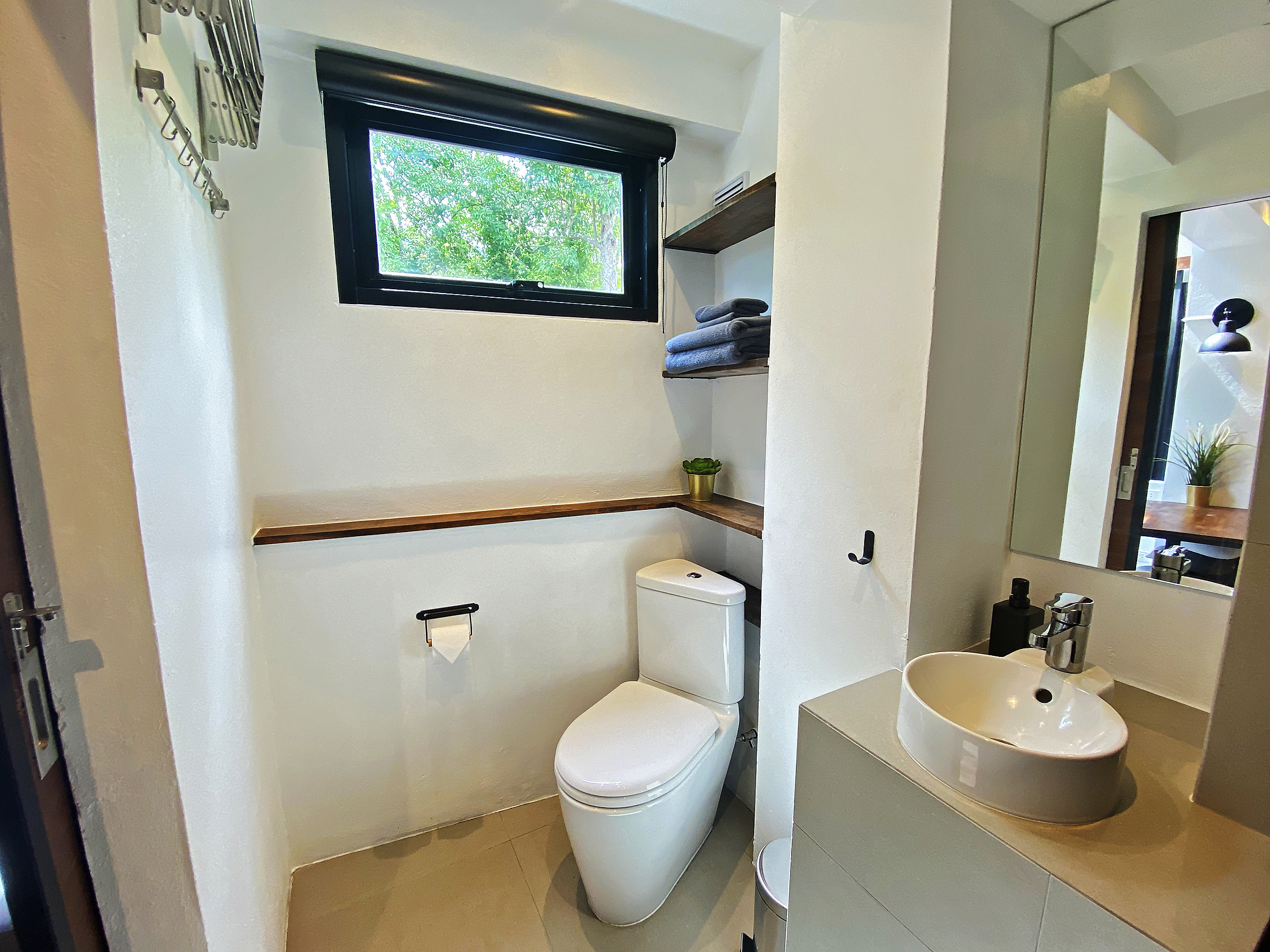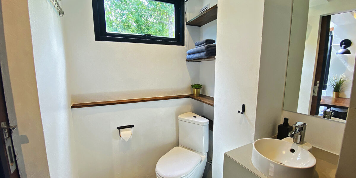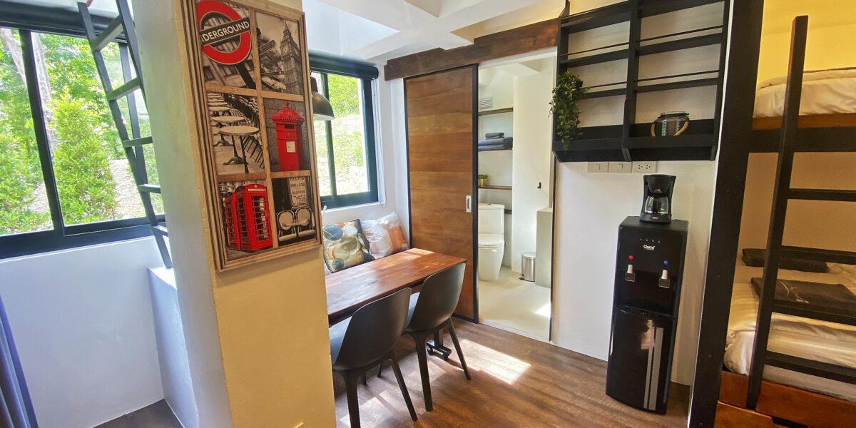 A large window along the back wall allows the morning sun to brighten the room, while offering beautiful and relaxing views of the trees, mountains, and jungle behind the property. The main area is multifunctional, with comfy bench seating and two chairs that provide dining space for four. The space is also perfect for work, thanks to the many outlets and USB chargers available. The TV rotates out from the wall, transforming the area into a cozy living room, ideal for watching a movie or relaxing after a day of exploration. High-speed internet, and air conditioning add to your comfort.