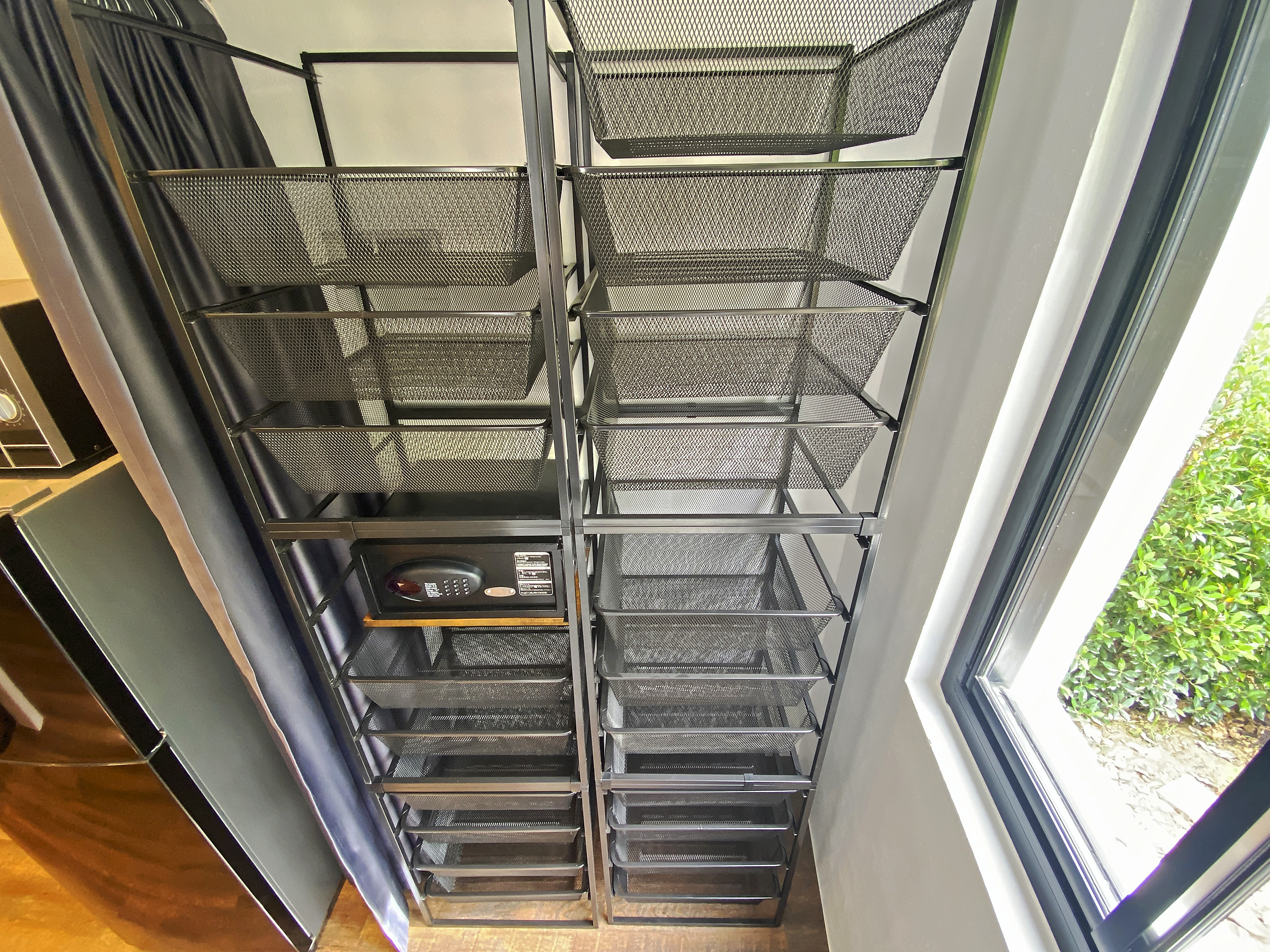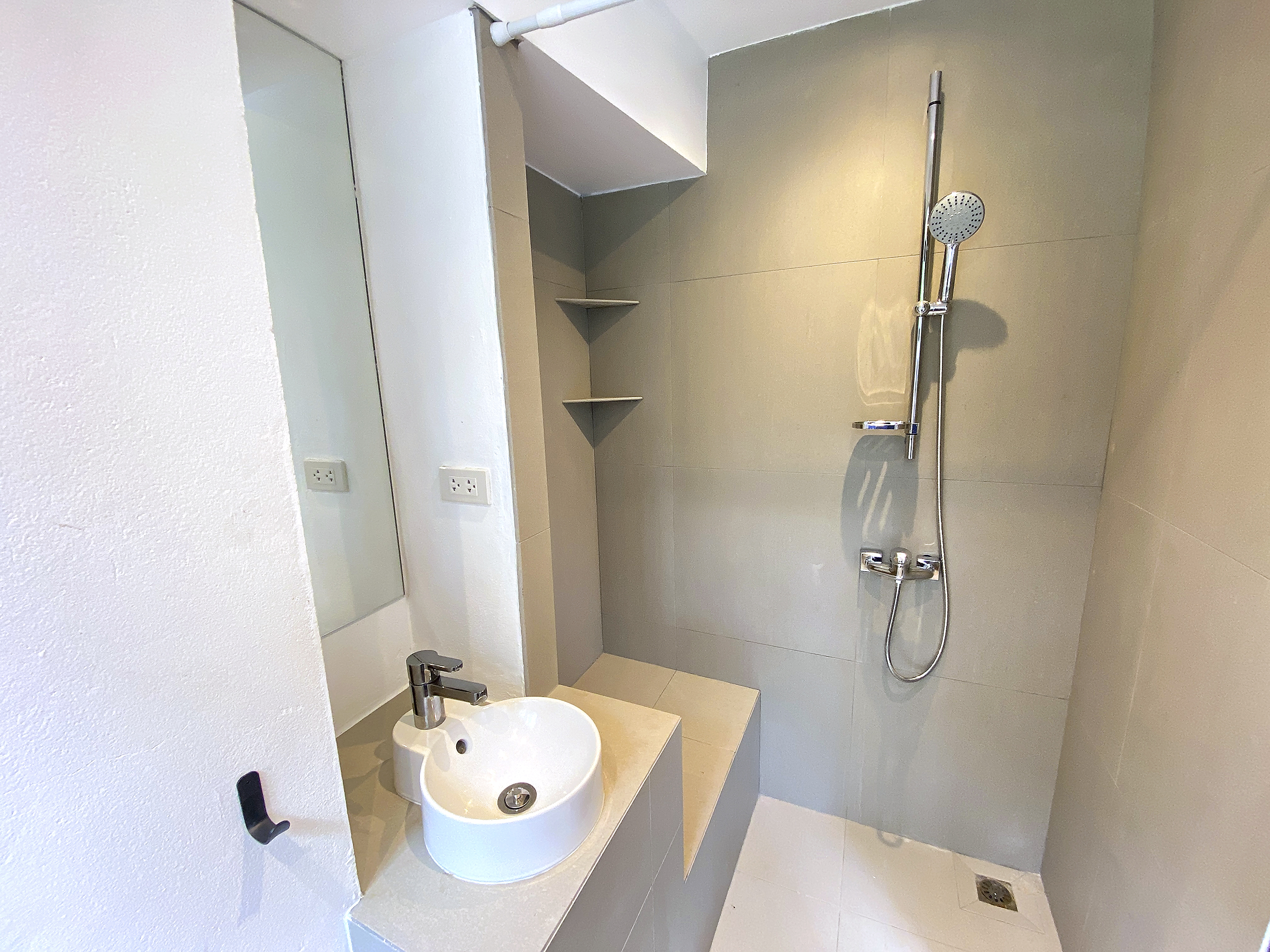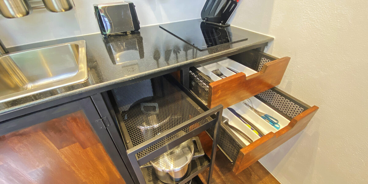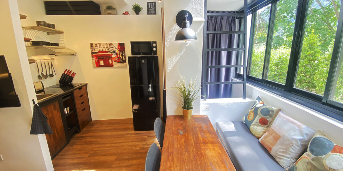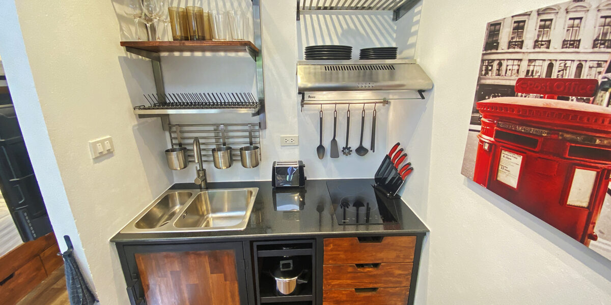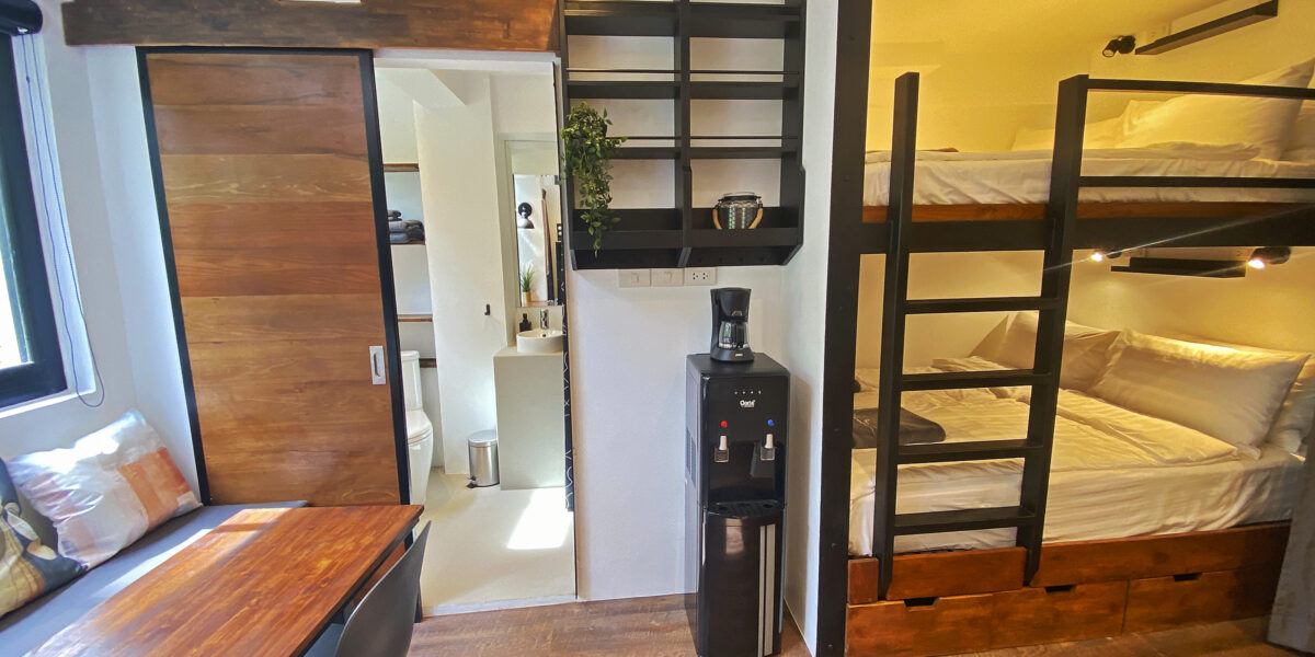 A large window along the back wall allows the morning sun to brighten the room, while offering beautiful and relaxing views of the trees, mountains, and jungle behind the property. The main area is multifunctional, with comfy bench seating and two chairs that provide dining space for four. The space is also perfect for work, thanks to the many outlets and USB chargers available. The TV rotates out from the wall, transforming the area into a cozy living room, ideal for watching a movie or relaxing after a day of exploration. High-speed internet, and air conditioning add to your comfort.
