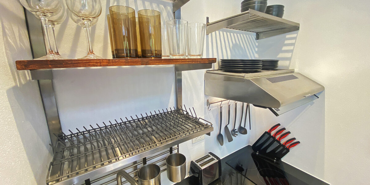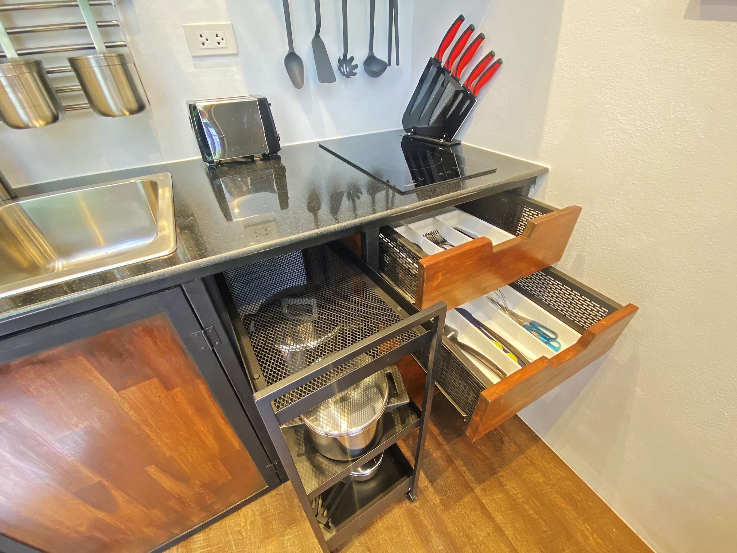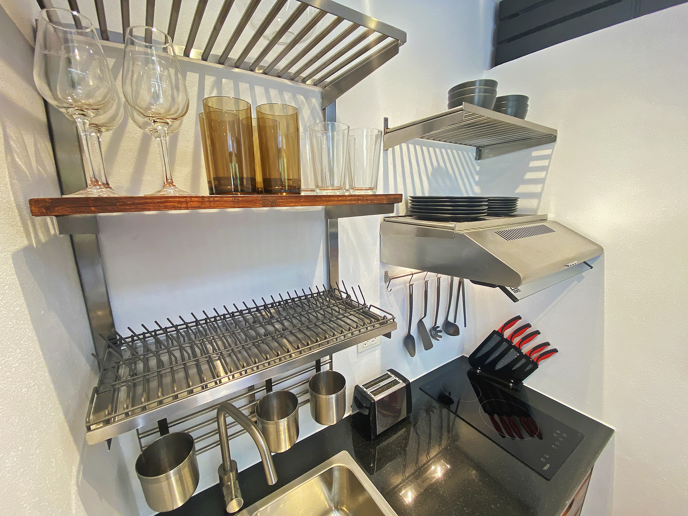 The kitchen is fully equipped with a two-burner cooktop, microwave, full-size refrigerator and all the pots, utensils, dishes, and small appliances you need to prepare your meals.