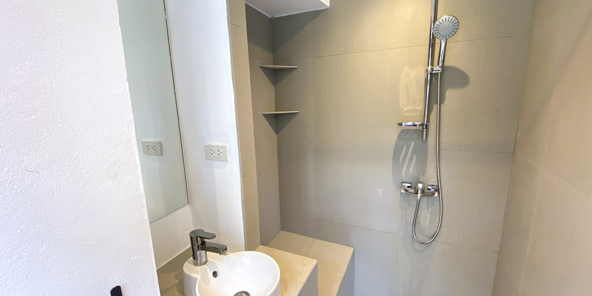 The apartment includes a modern bathroom with all essentials, and guests have access to shared laundry facilities in the adjacent building.