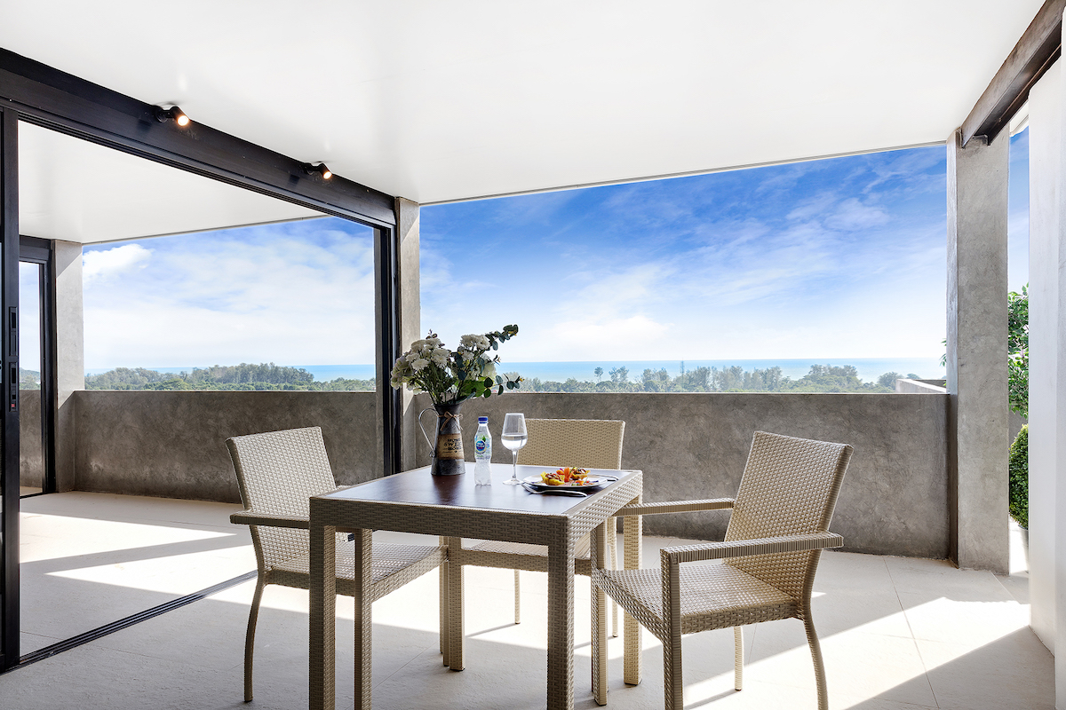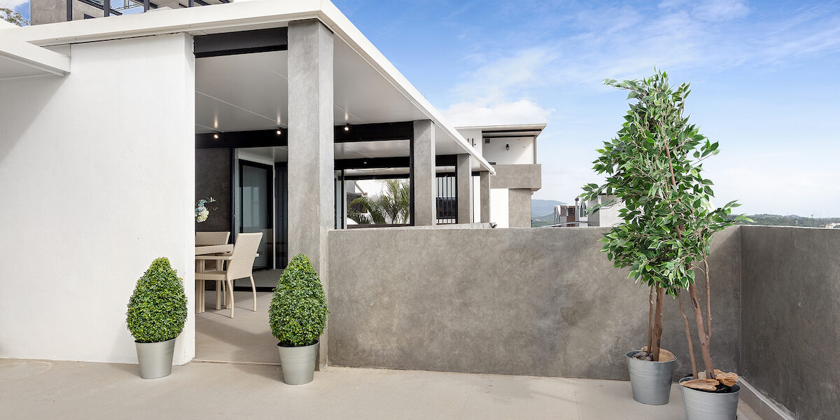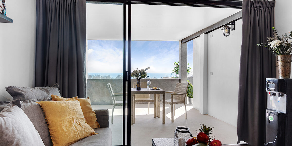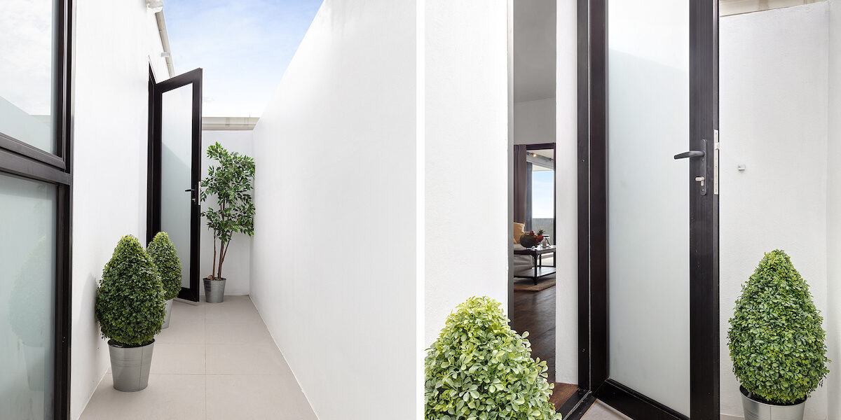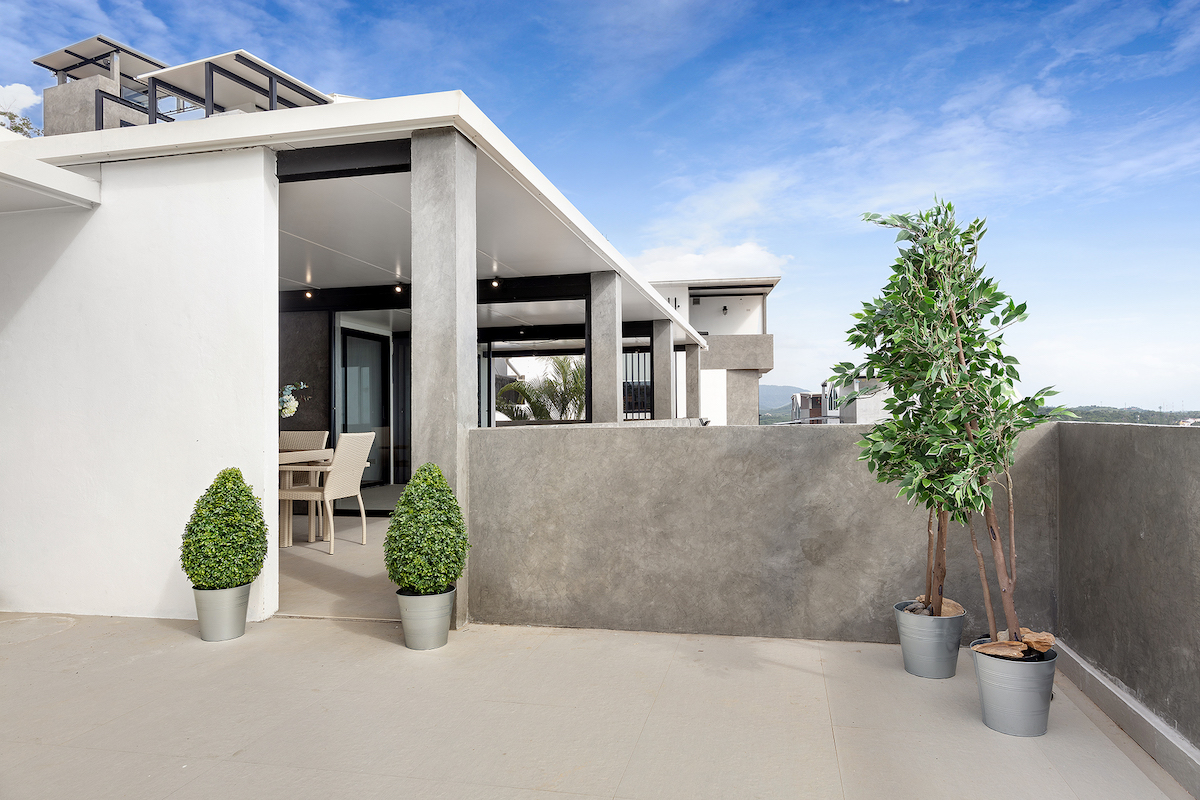 Step out onto the terrace, where you’ll find a dining table for four and direct access to the communal pool. If you are traveling with a larger group, you can rent the adjacent apartments and open the terrace doors for easy access between the units.
