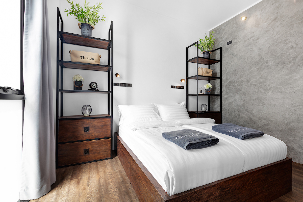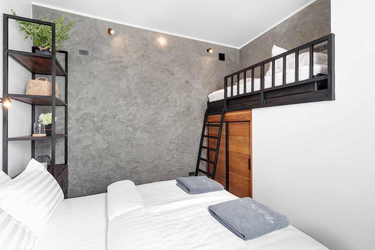 The bedroom, located at the back of the apartment, features a queen-size bed with storage space underneath and a cleverly fitted wall bed of 80 cm, making it ideal for families who want their child to sleep in the same room. The adjacent bathroom adds convenience. All beds come with IKEA mattresses and quality linens, ensuring a restful night’s sleep.