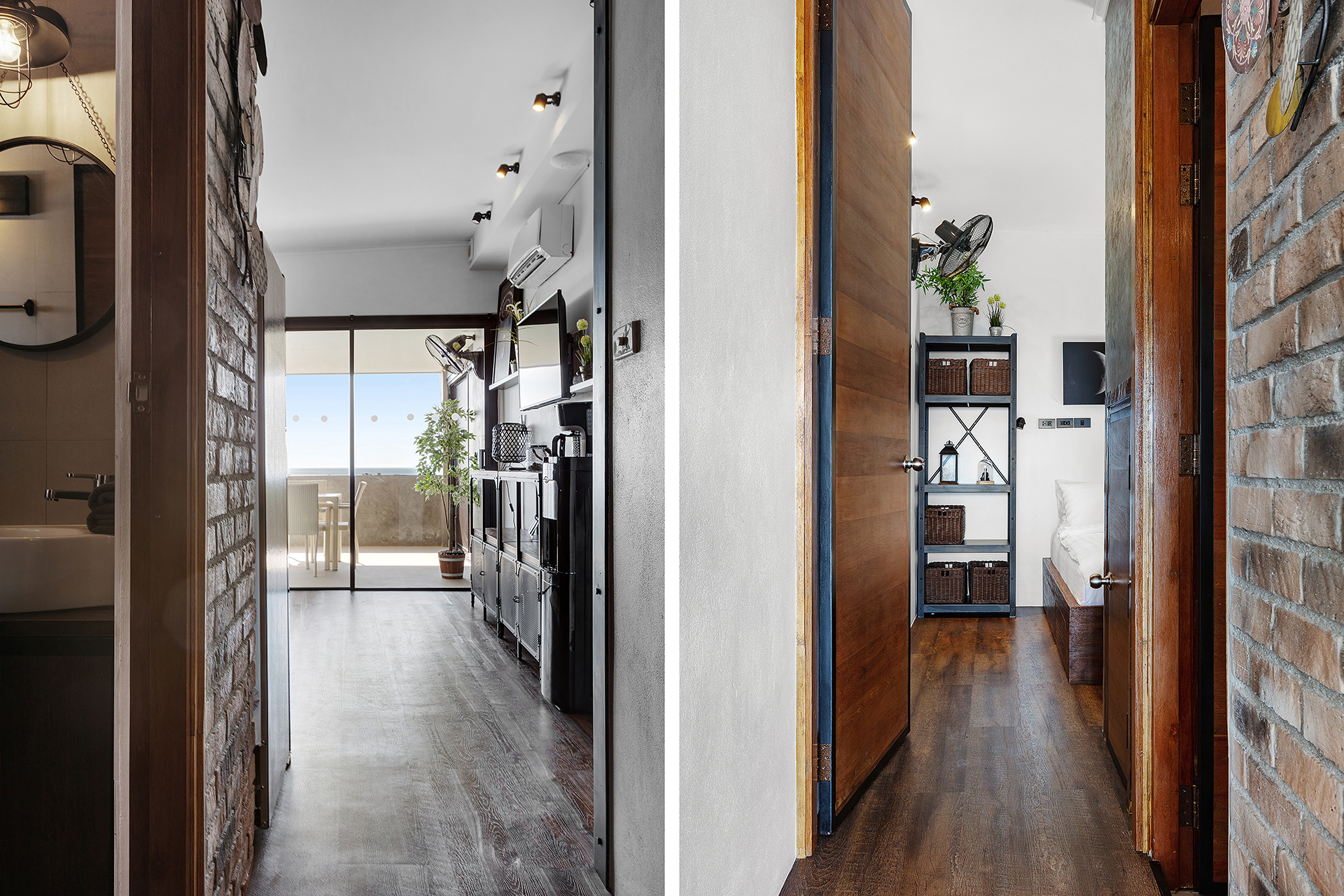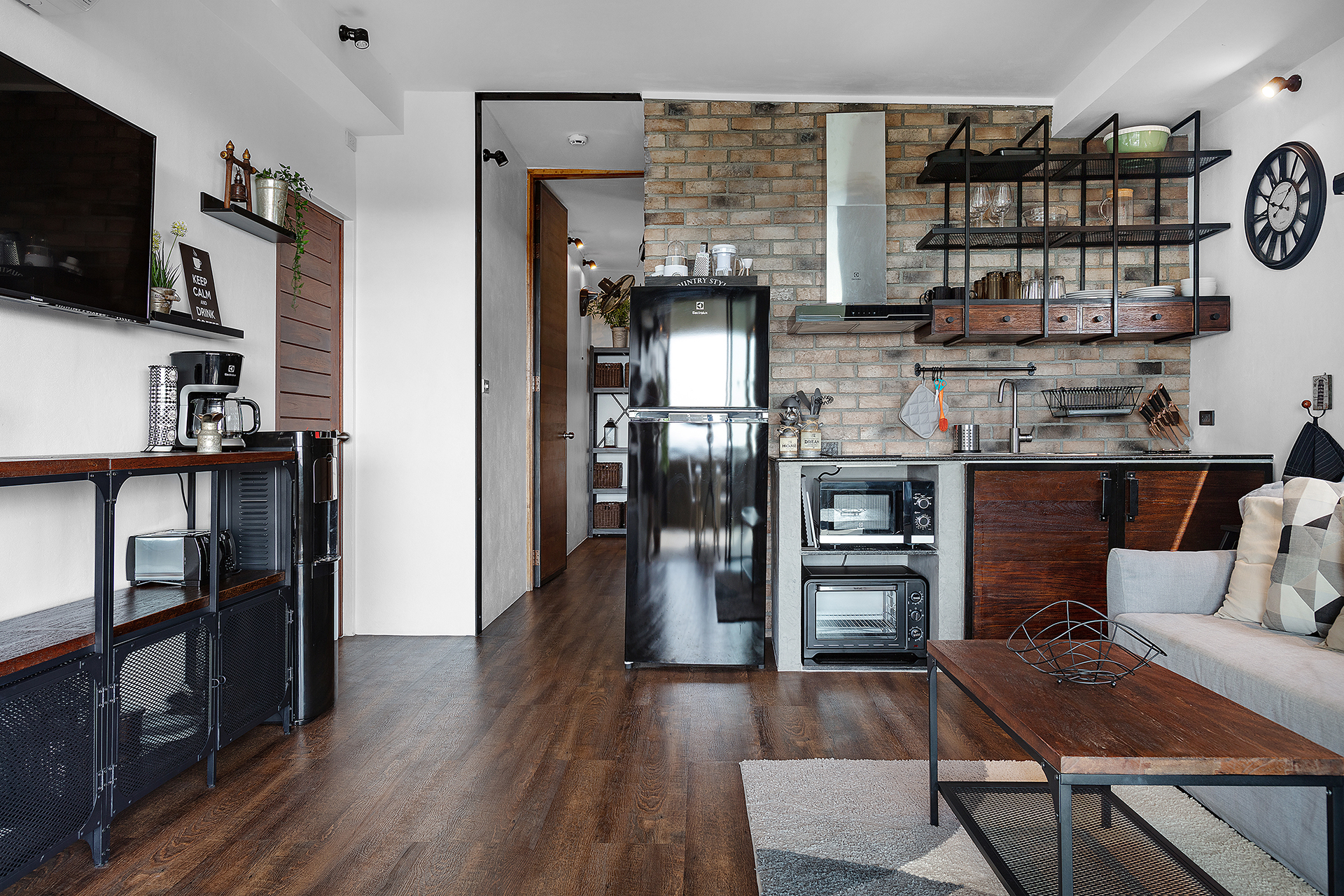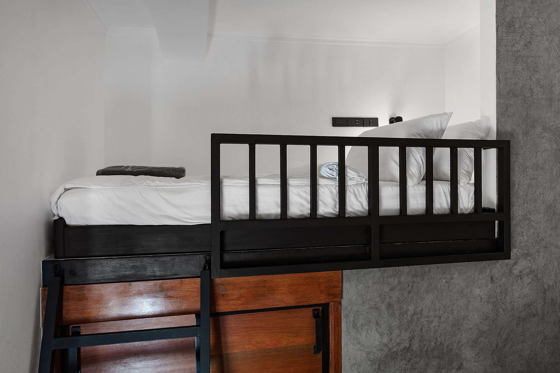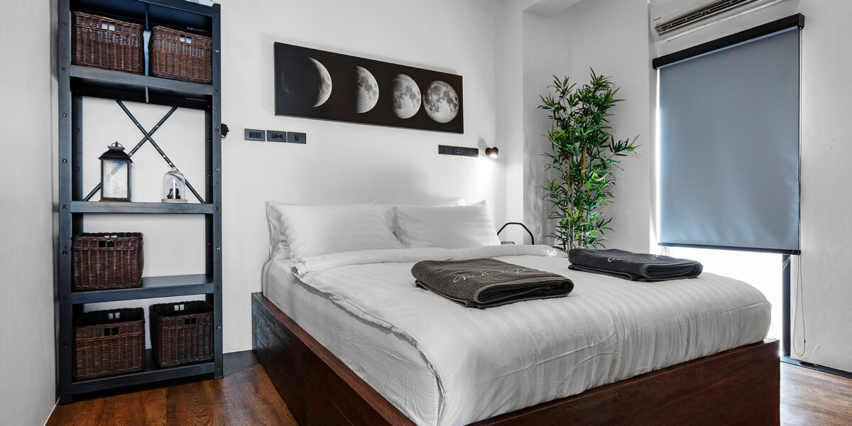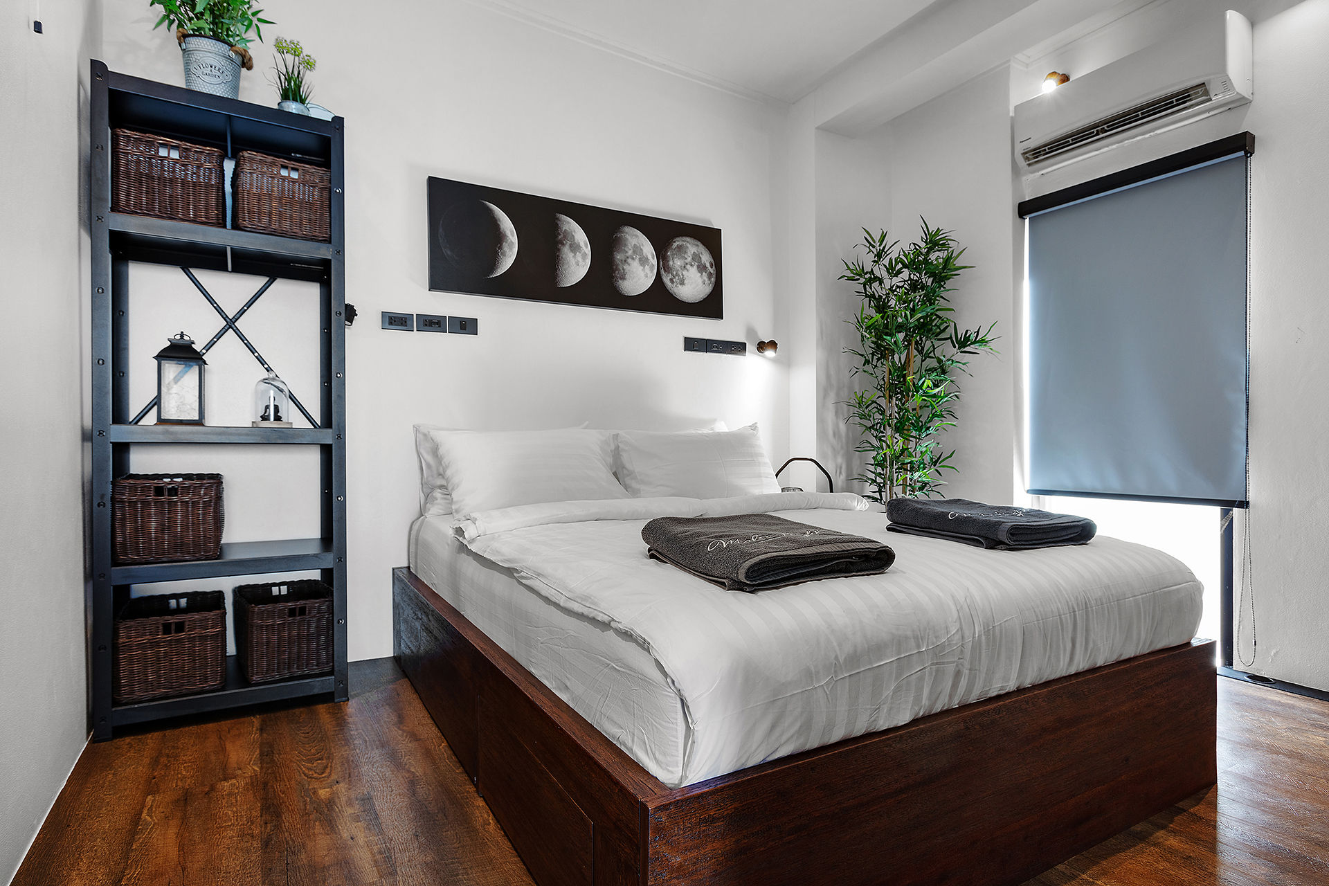 The bedroom, located at the back of the apartment, features a king-size bed and a cleverly fitted single wall-bed, making it ideal for families who want their child to sleep in the same room. The adjacent bathroom adds convenience. All beds come with IKEA mattresses and quality linens, ensuring a restful night’s sleep.