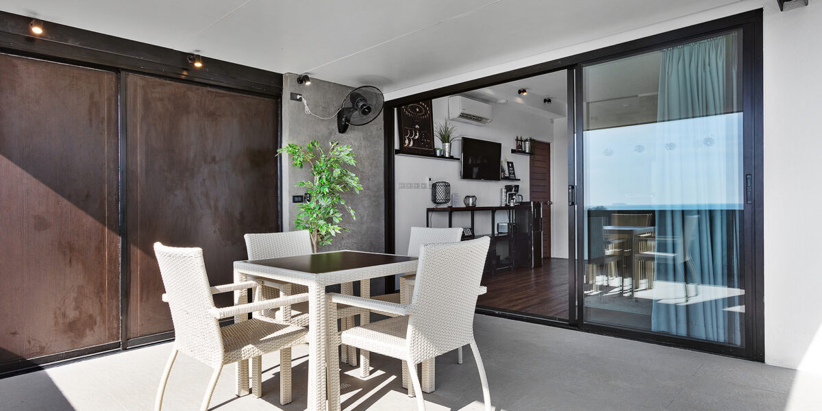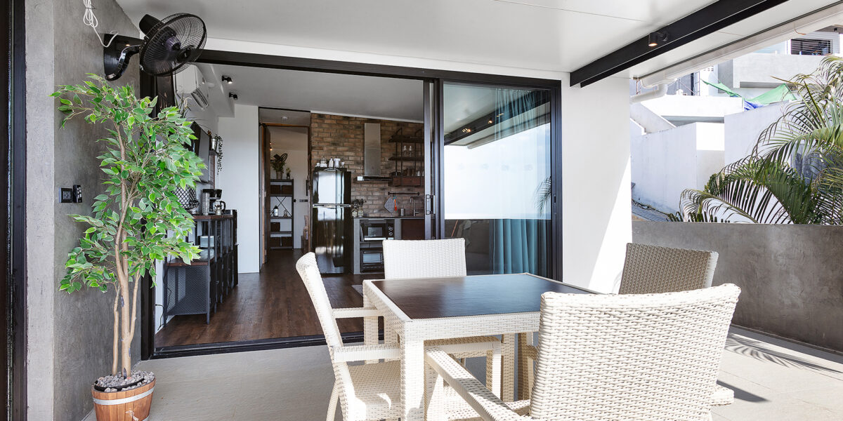 Step out onto the terrace, where you’ll find a dining table for six people and fantastic sea views. If you are traveling with a larger group, you can rent one or both apartments next door and open the terrace doors for easy access.
