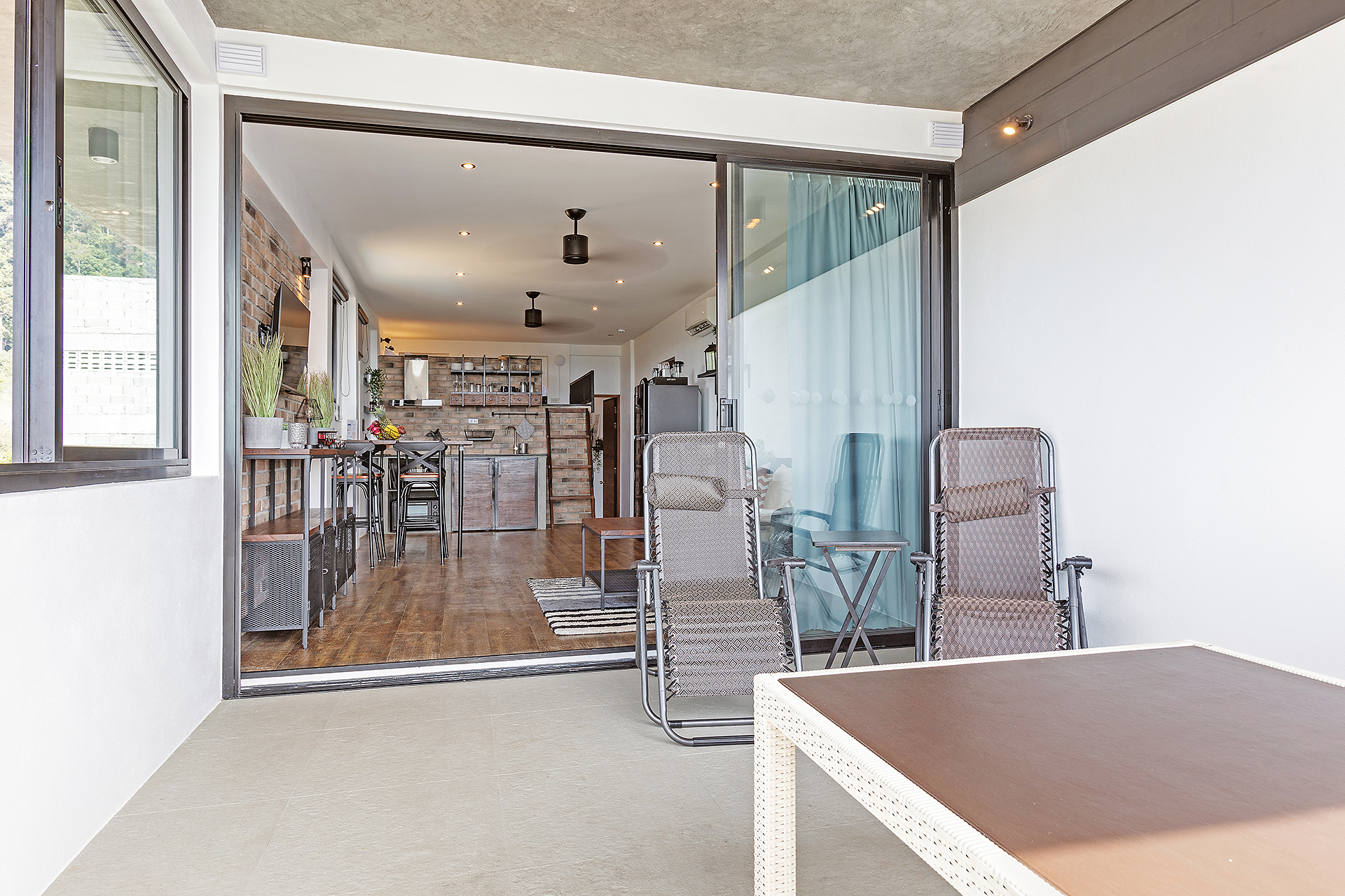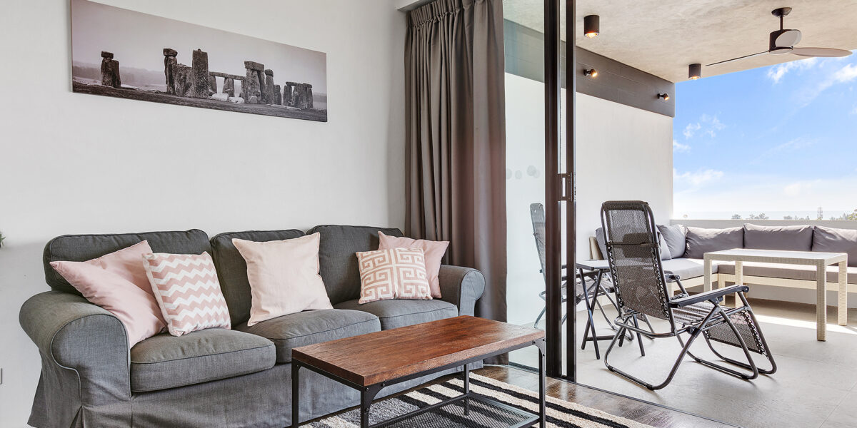Step into a spacious open-plan area where the kitchen, dining, and living room flow together seamlessly. Natural light and stunning sea views greet you immediately through the large glass doors, leading out to a two-sided balcony furnished with a comfortable lounge sofa and table.