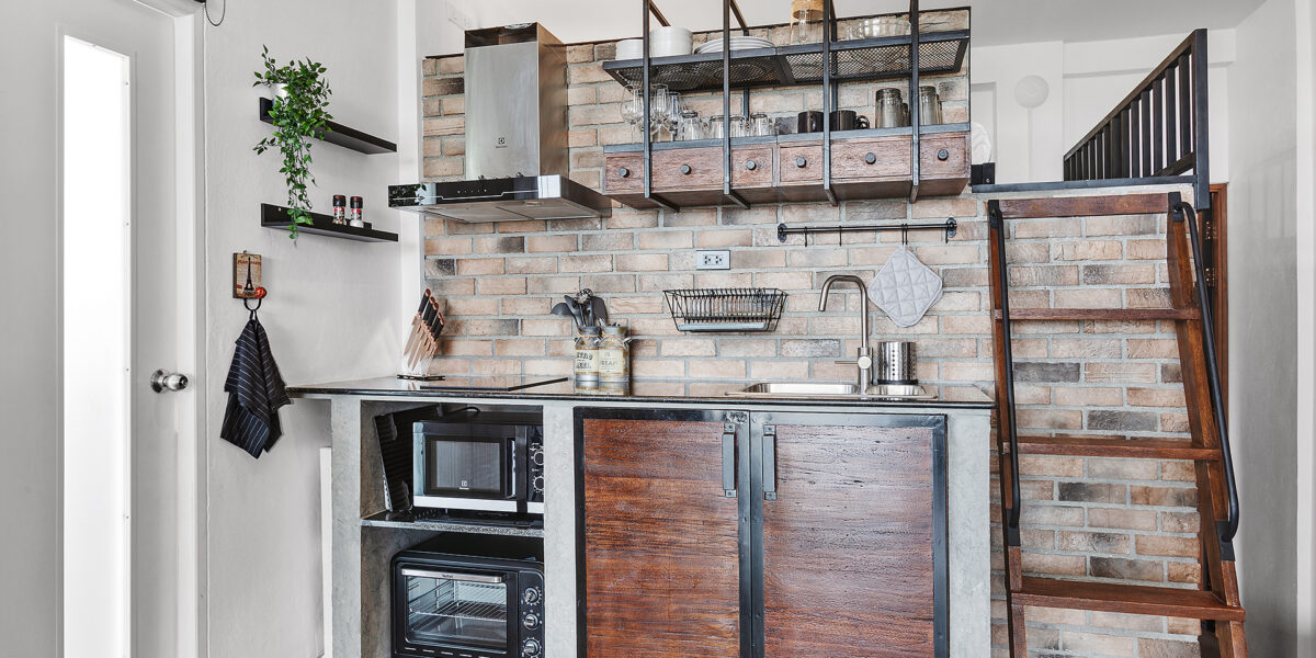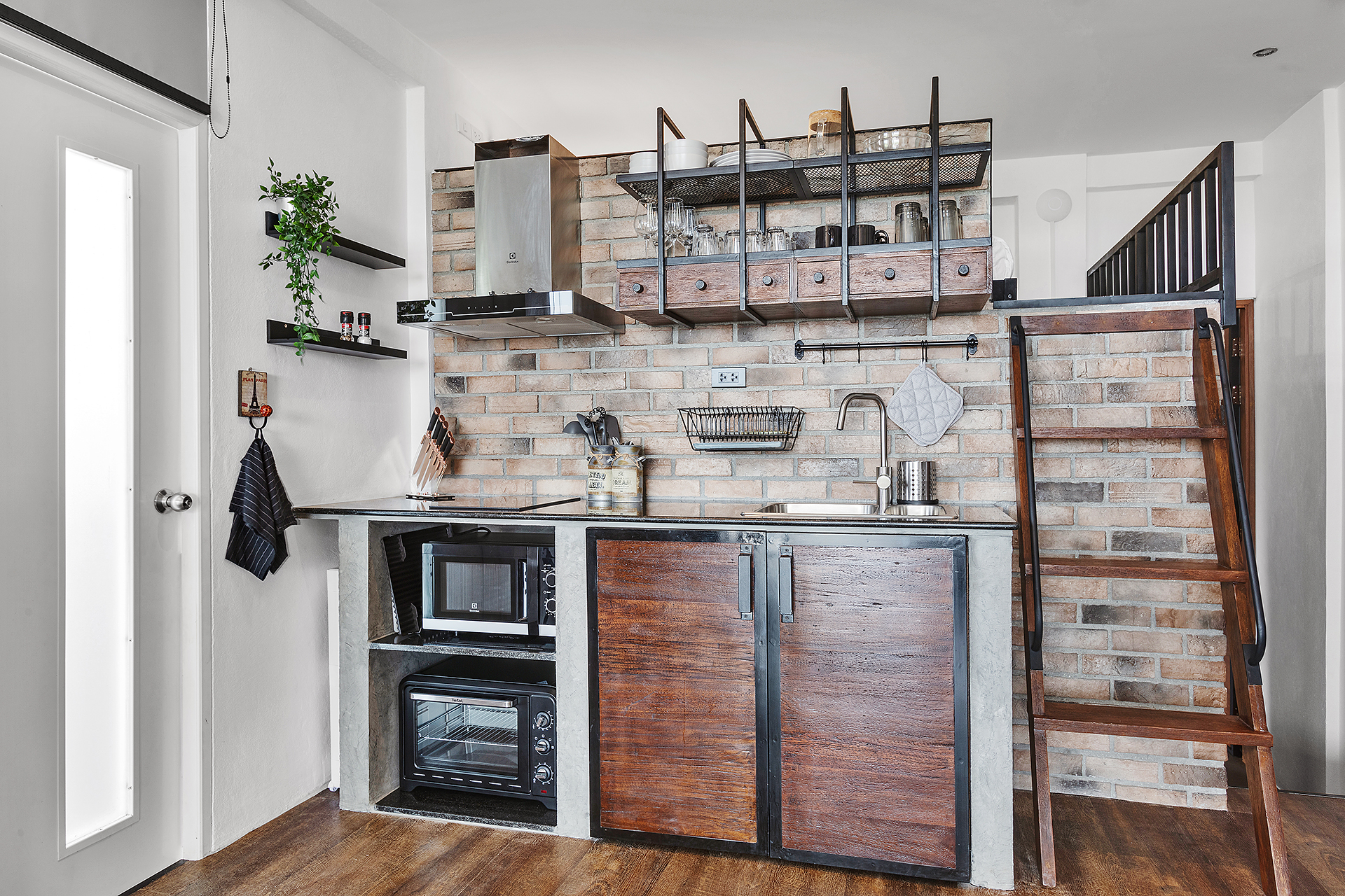 The fully equipped kitchen includes a two-burner cooktop, microwave, full-size refrigerator, oven, toaster, coffee machine and all essential cookware and utensils. The dining area seats four, perfect for meals or work, while the living room offers a comfy couch and TV for relaxing moments.
