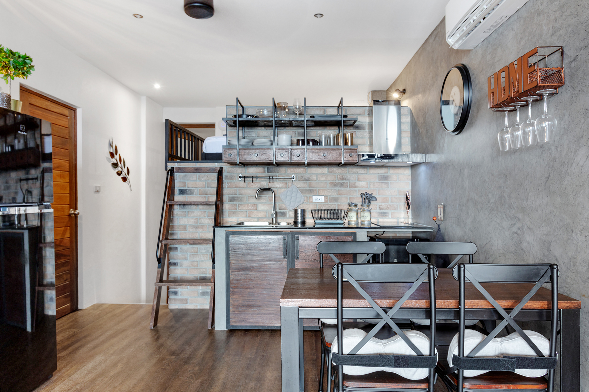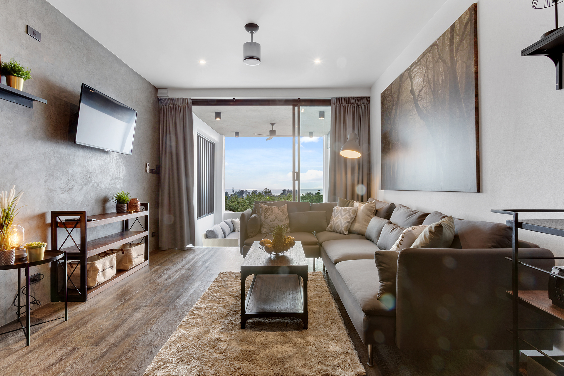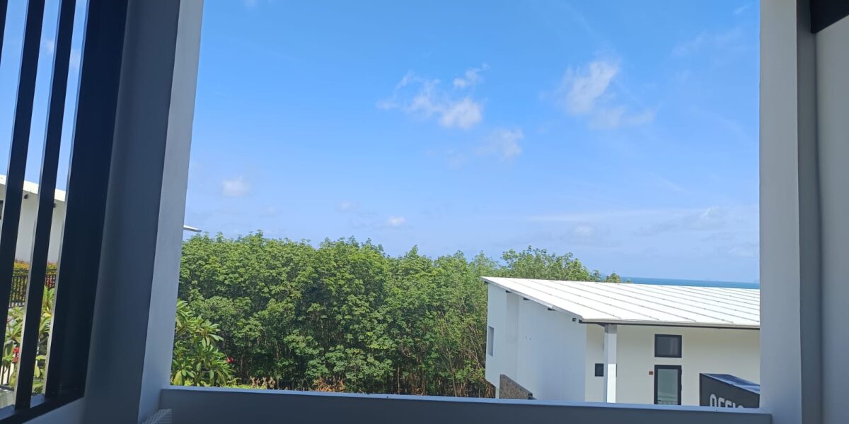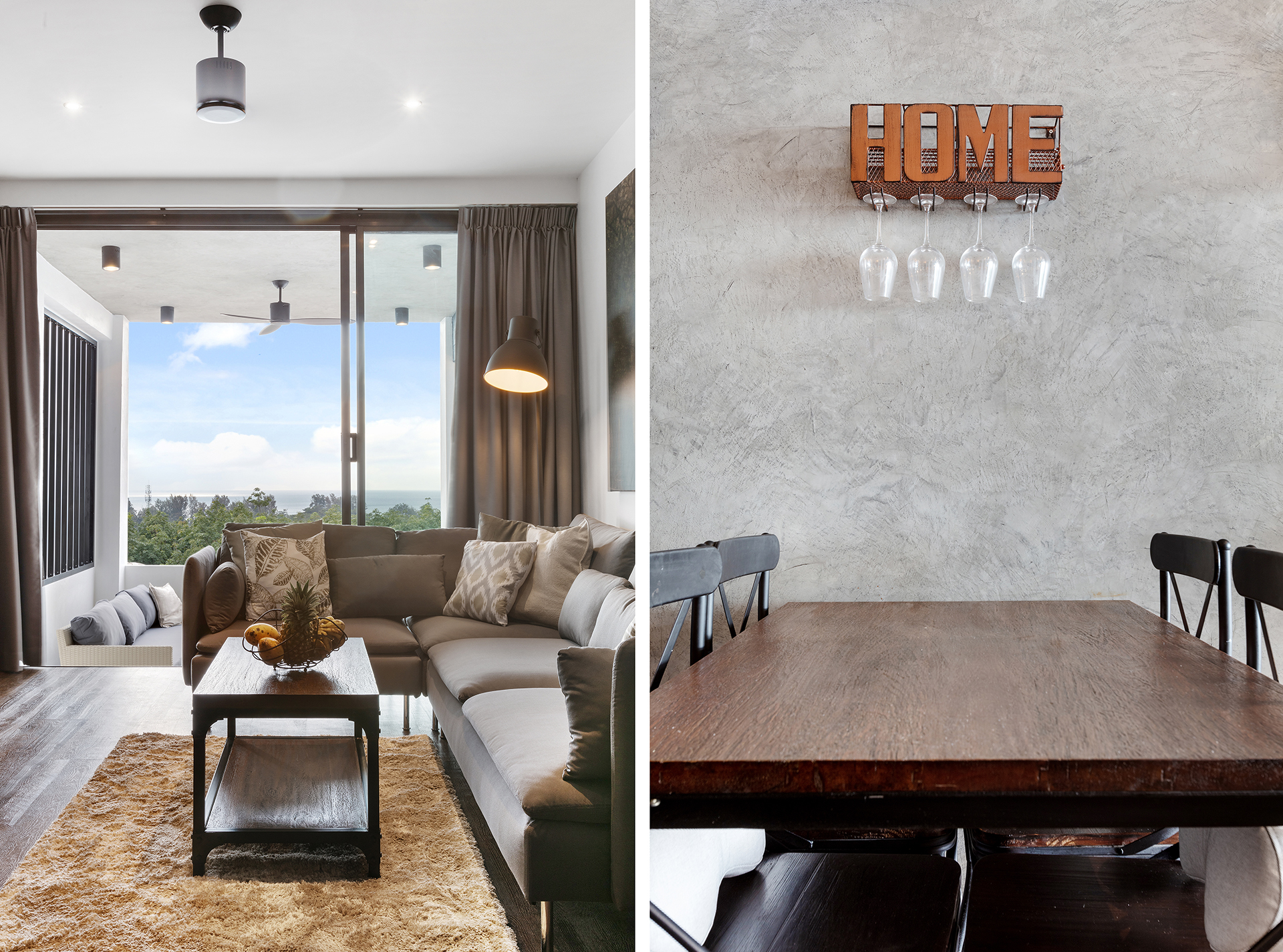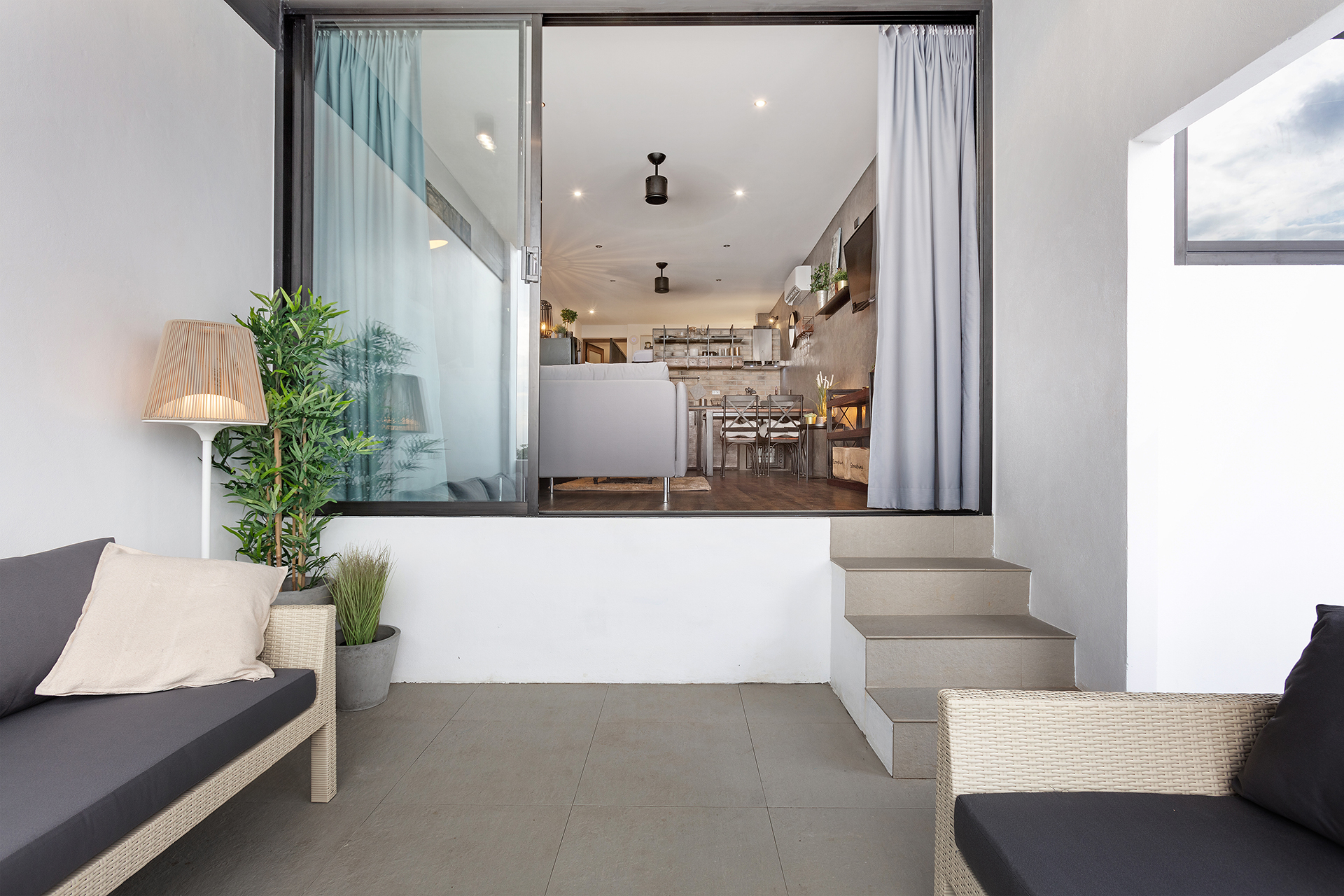 Before stepping inside, you’ll pass through the apartment’s expansive balcony, a true highlight of A7. With an extra-high ceiling, stunning panoramic views, and ample seating, it’s the perfect spot to relax and take in Koh Lanta’s breathtaking sunsets.