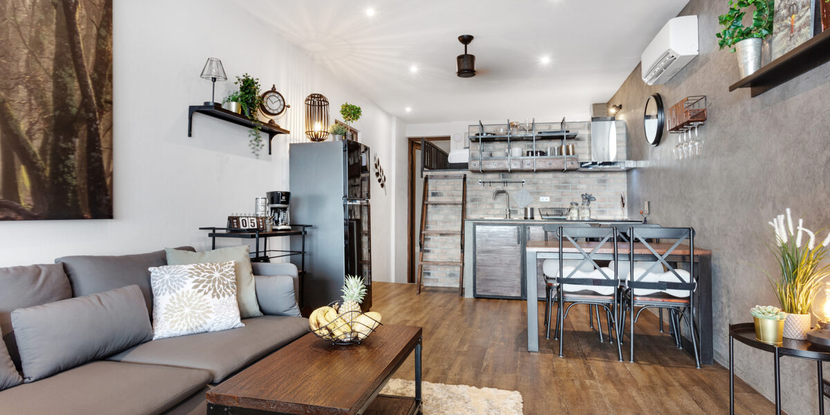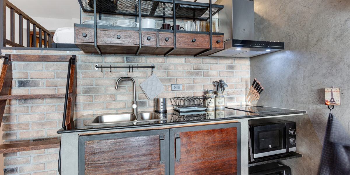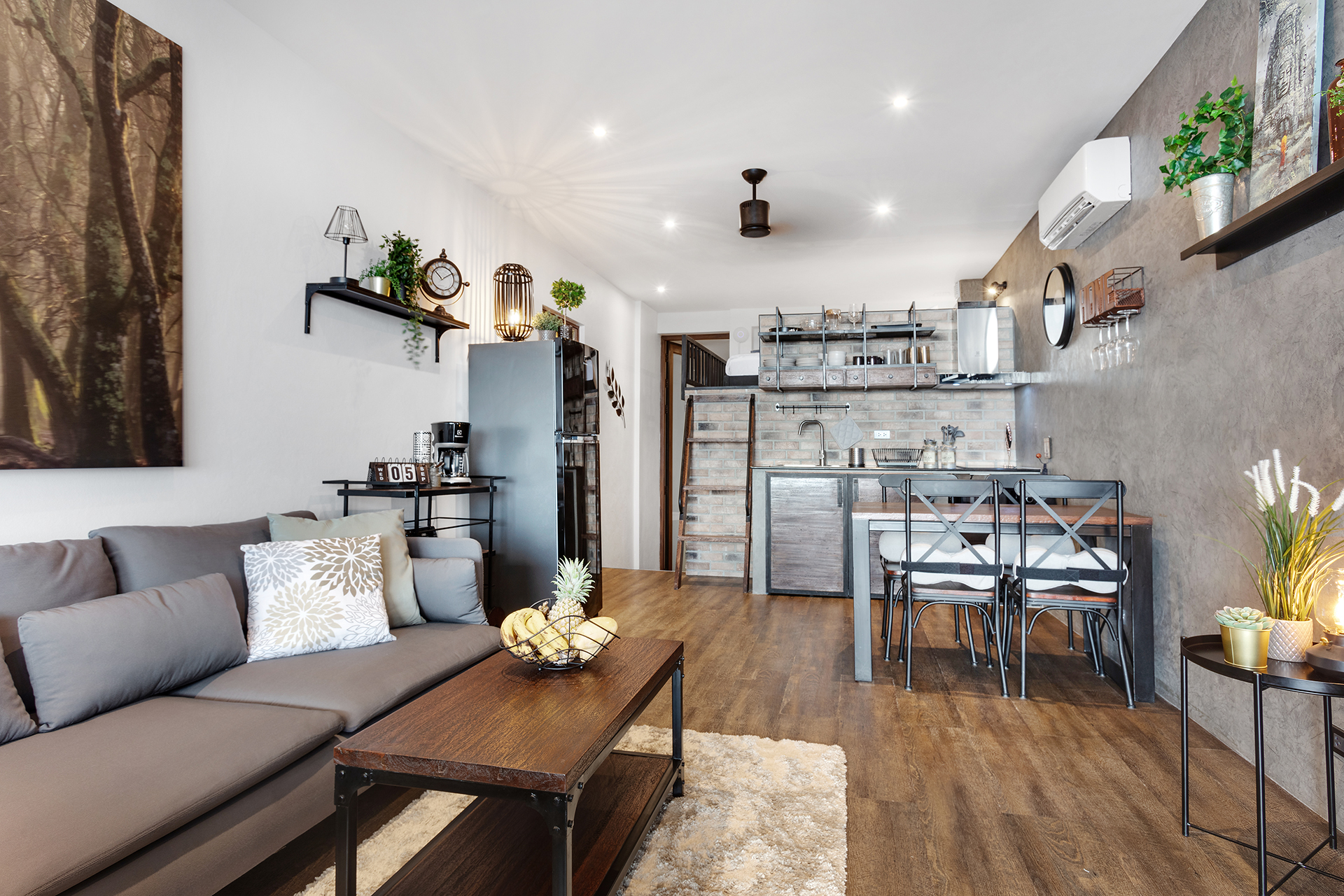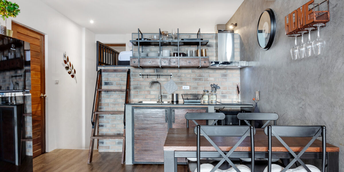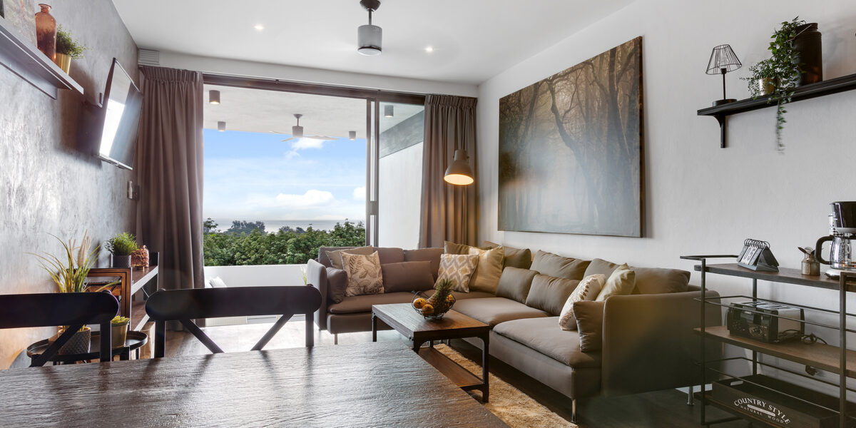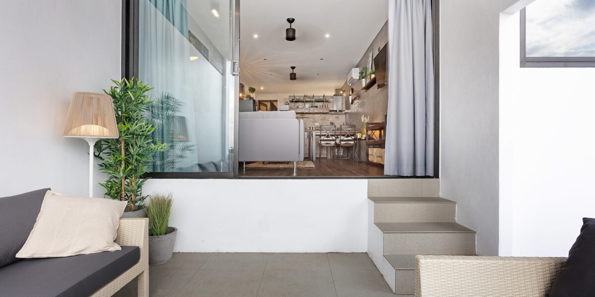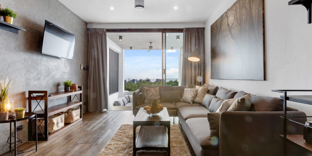 Before stepping inside, you’ll pass through the apartment’s expansive balcony, a true highlight of A7. With an extra-high ceiling, stunning panoramic views, and ample seating, it’s the perfect spot to relax and take in Koh Lanta’s breathtaking sunsets.