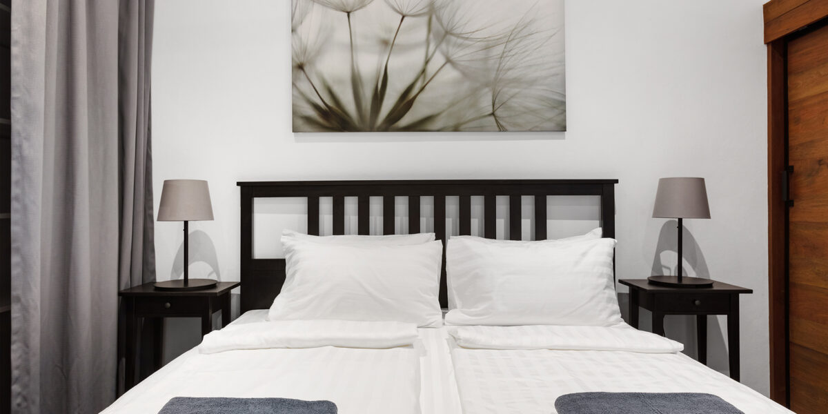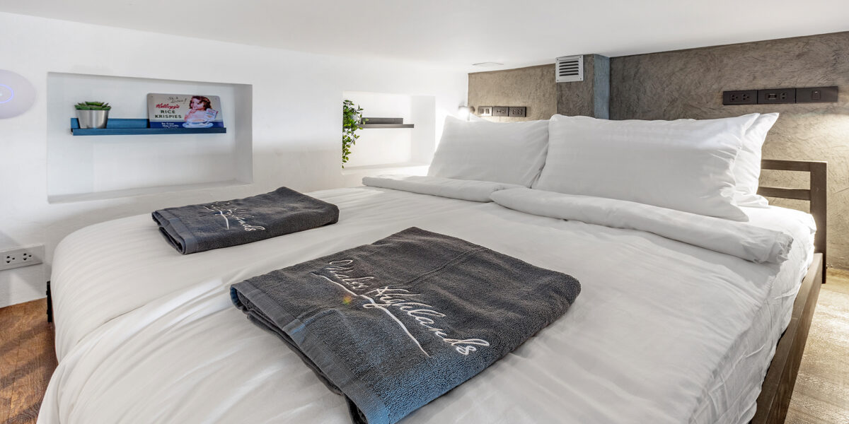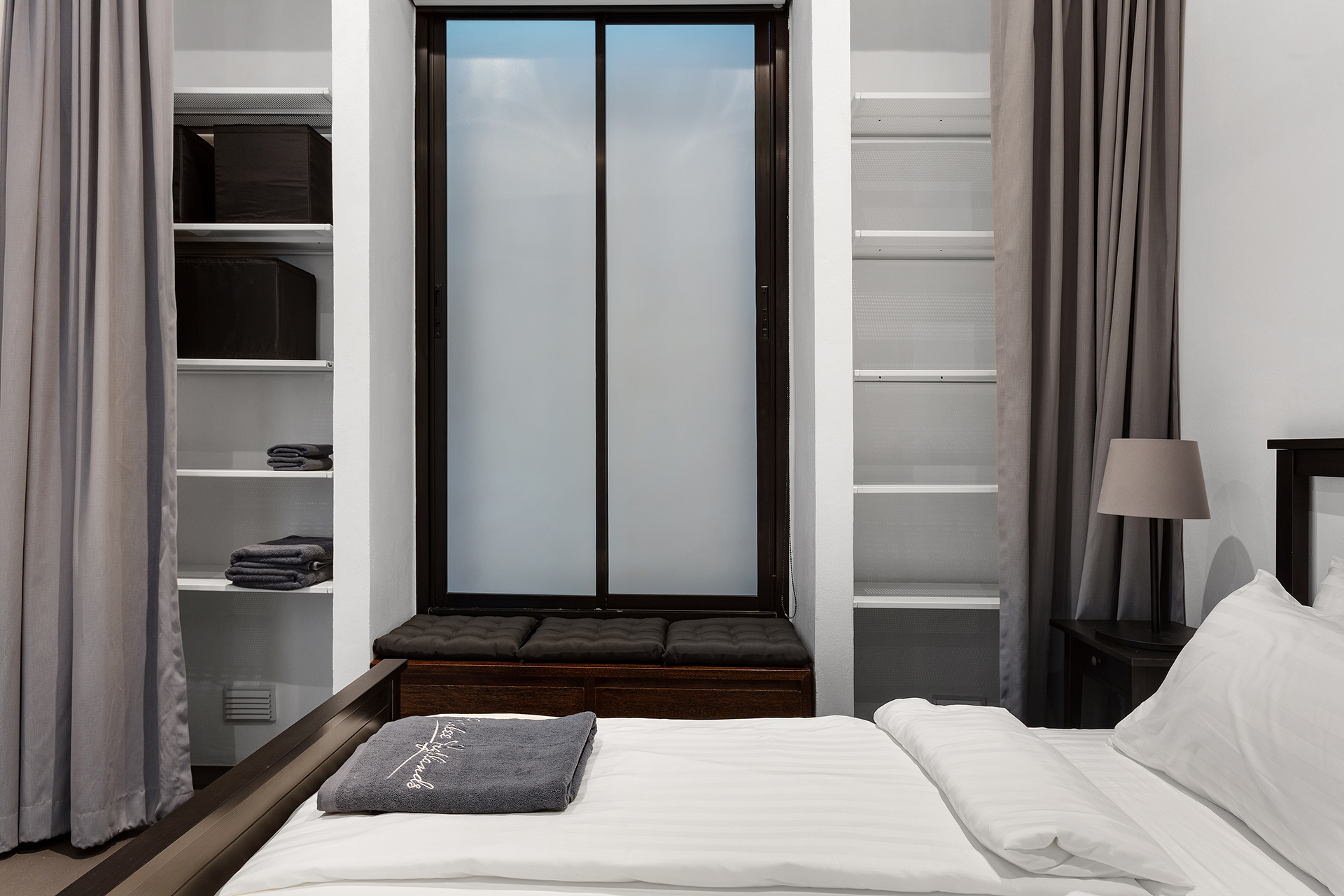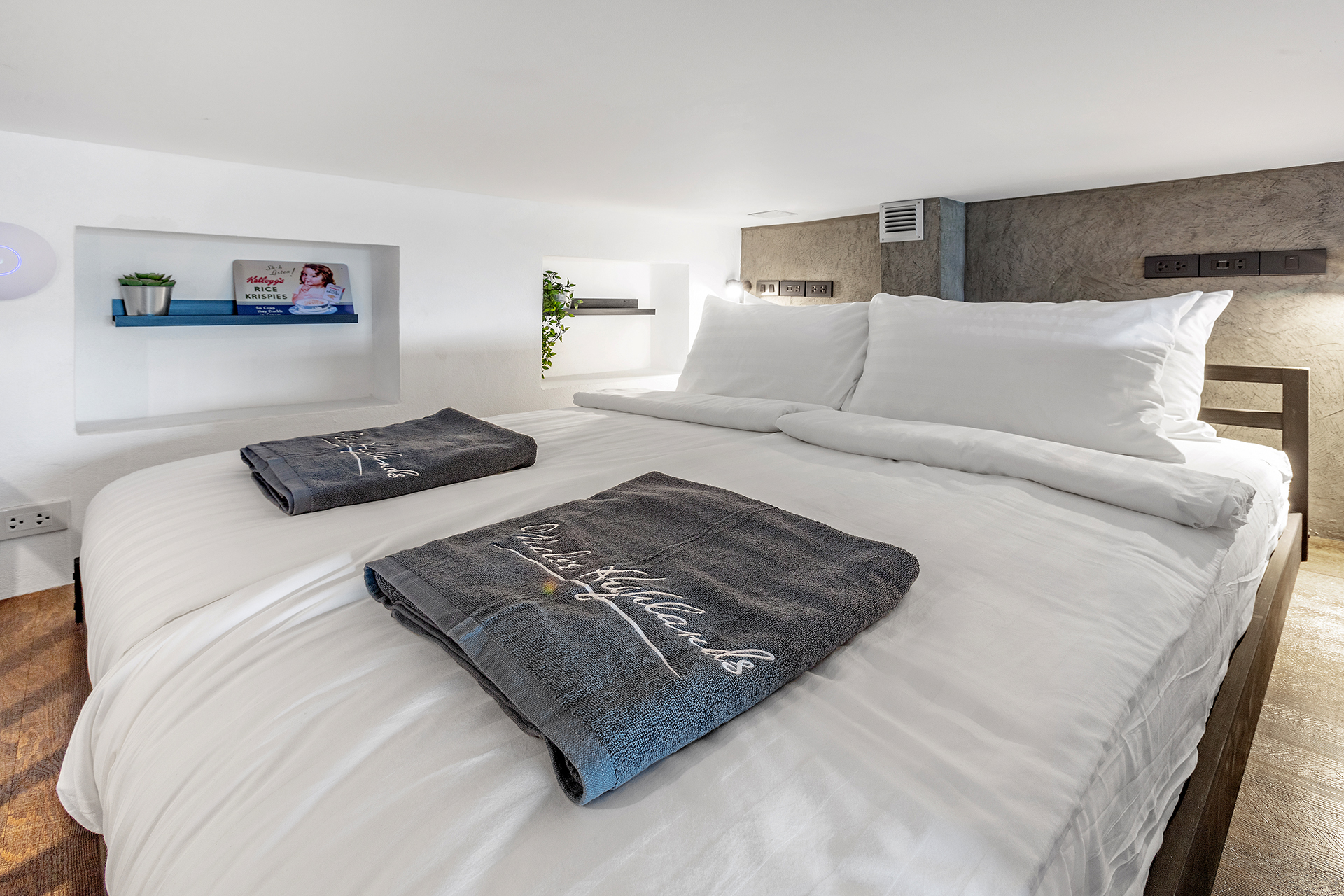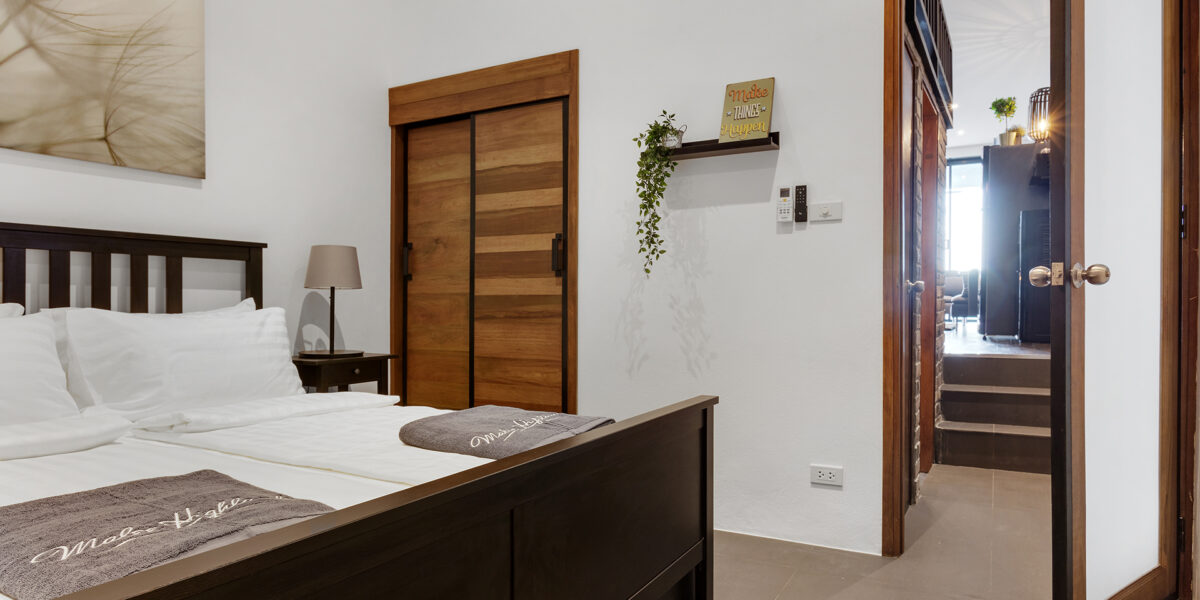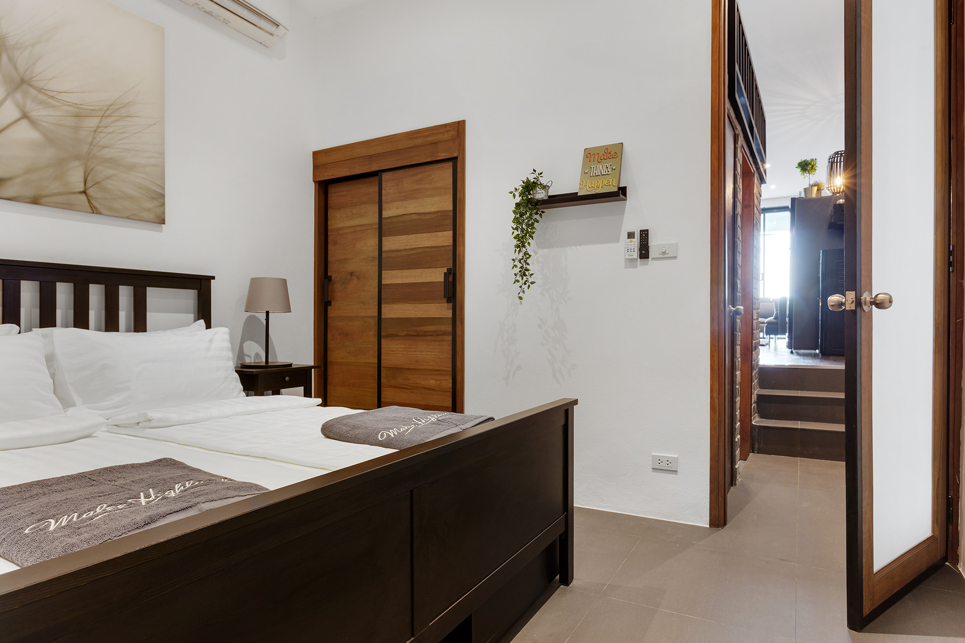 The master bedroom boasts a high ceiling, a comfortable king-size bed, ample storage, a ceiling fan, and air conditioning. All beds have IKEA mattresses and quality linens for a restful night’s sleep.