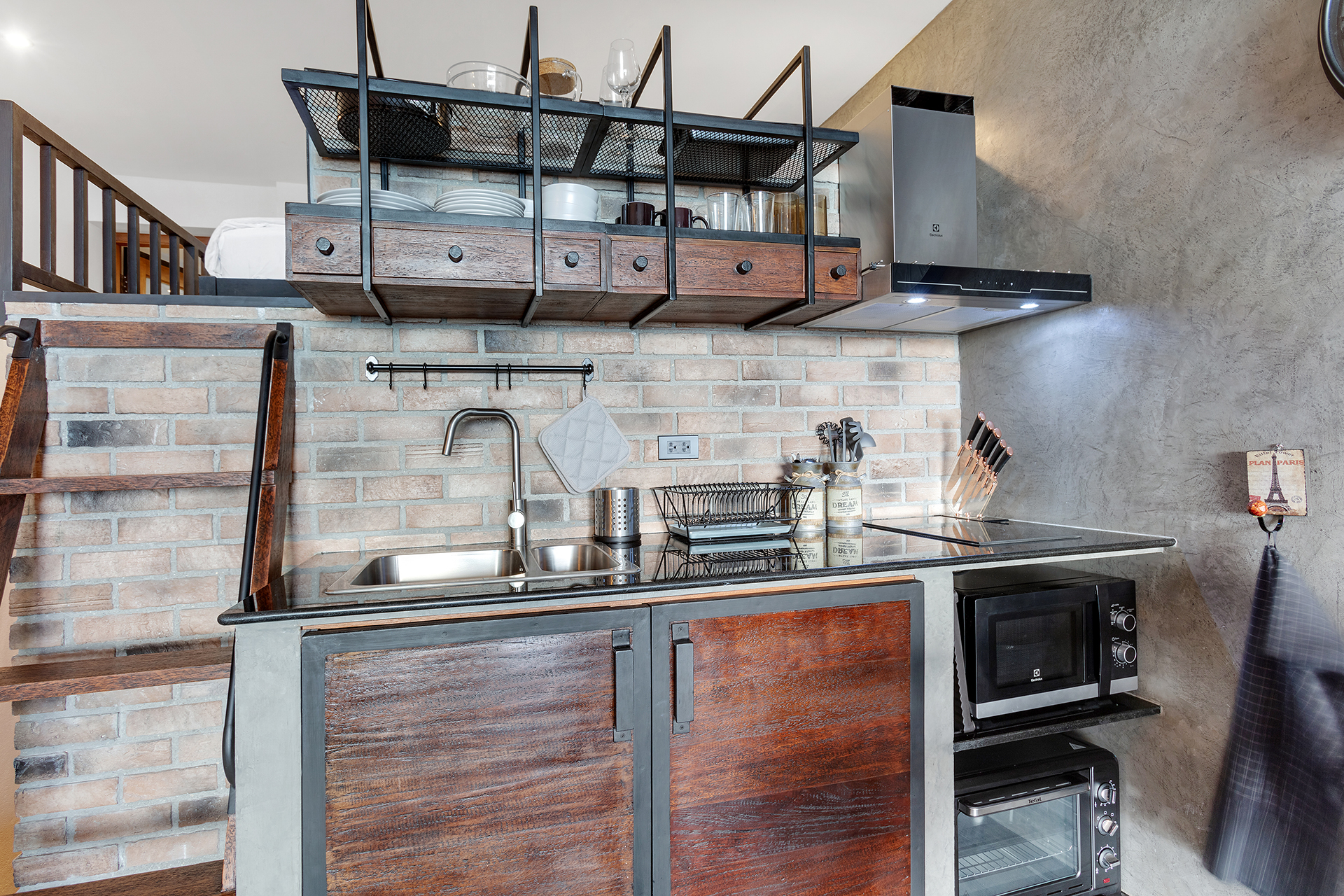 Above the kitchen, a loft with a queen-size bed provides additional sleeping space. Down the hallway, there’s a storage closet and a modern bathroom with a convenient washer/dryer.
