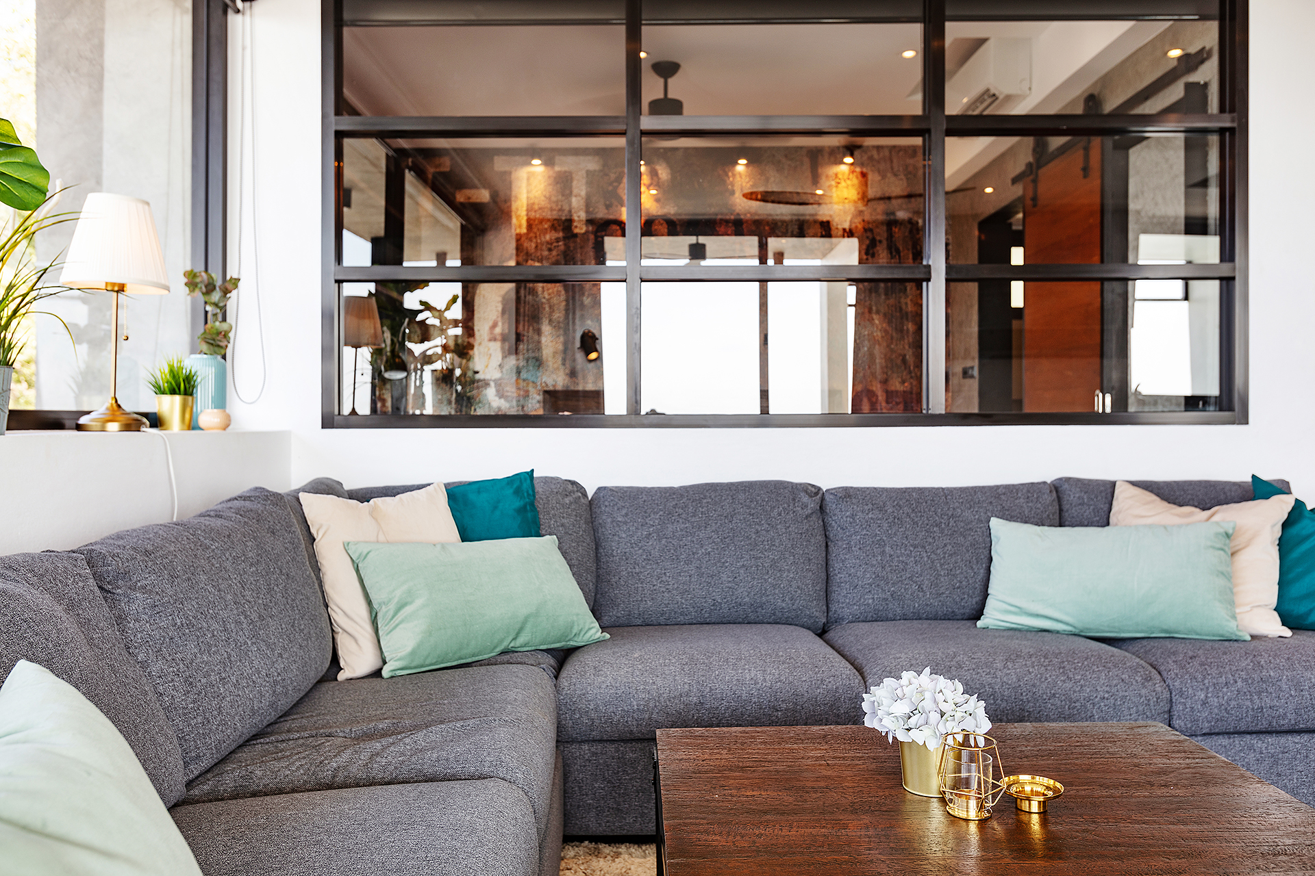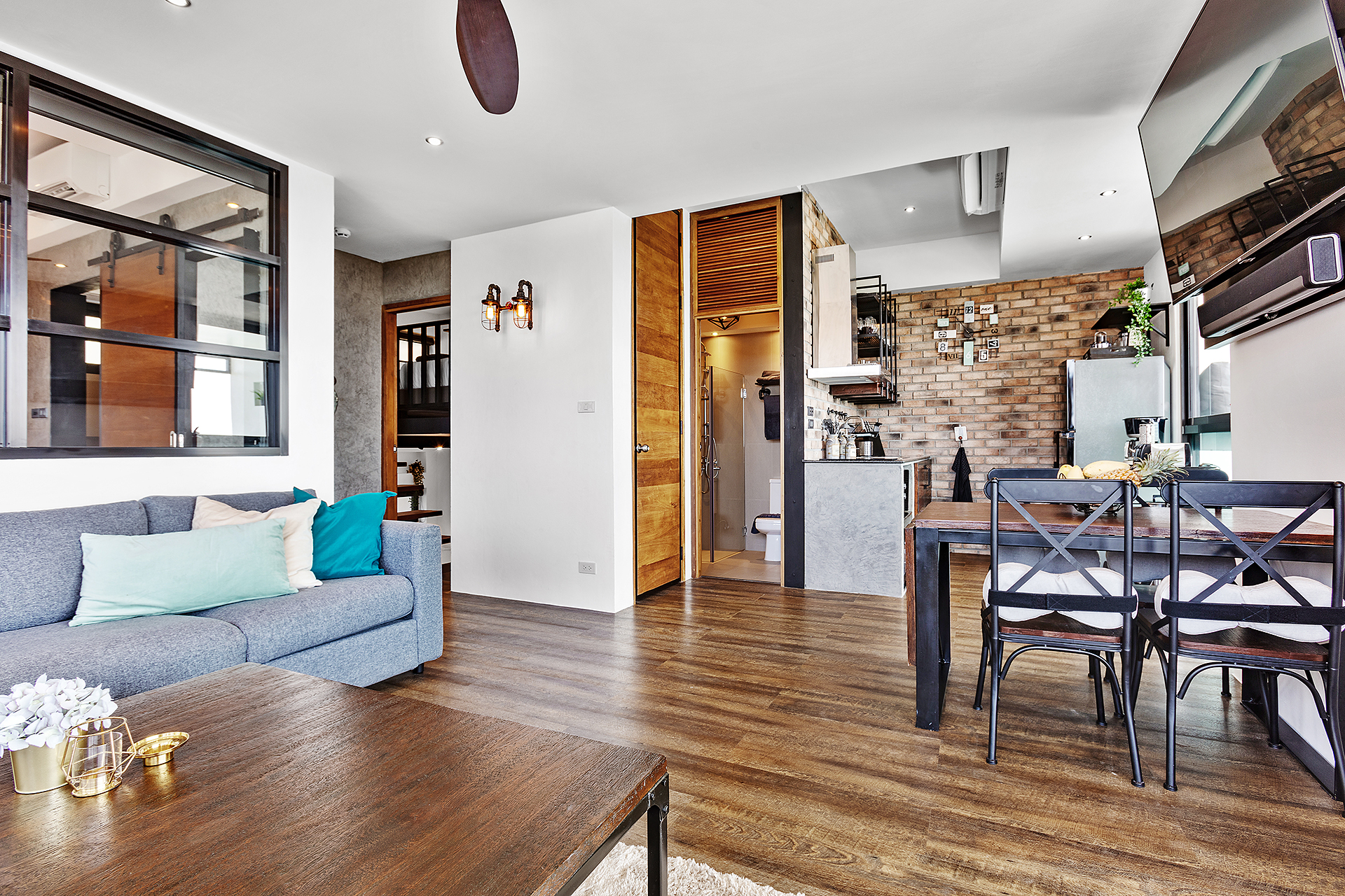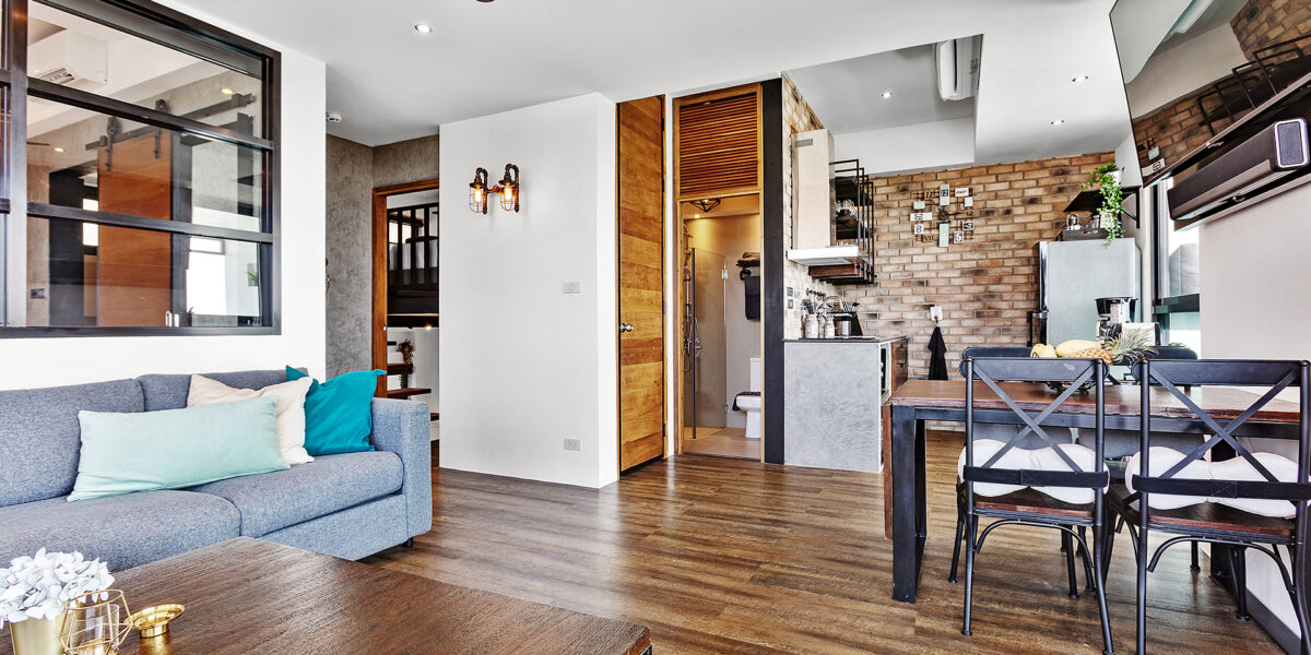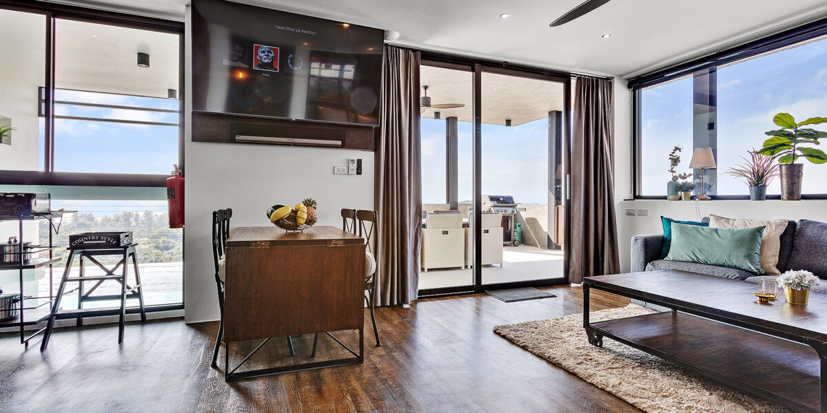 The living area is designed for comfort and entertainment, with a massive 65-inch smart TV that can be positioned for optimal viewing from anywhere in the room. A large, cozy sofa invites you to relax, while the sliding glass doors open fully, allowing for uninterrupted ocean views and refreshing sea breezes. The dining area offers flexible seating with expandable tables, so you can choose to dine inside or outside on the sea-view terrace.