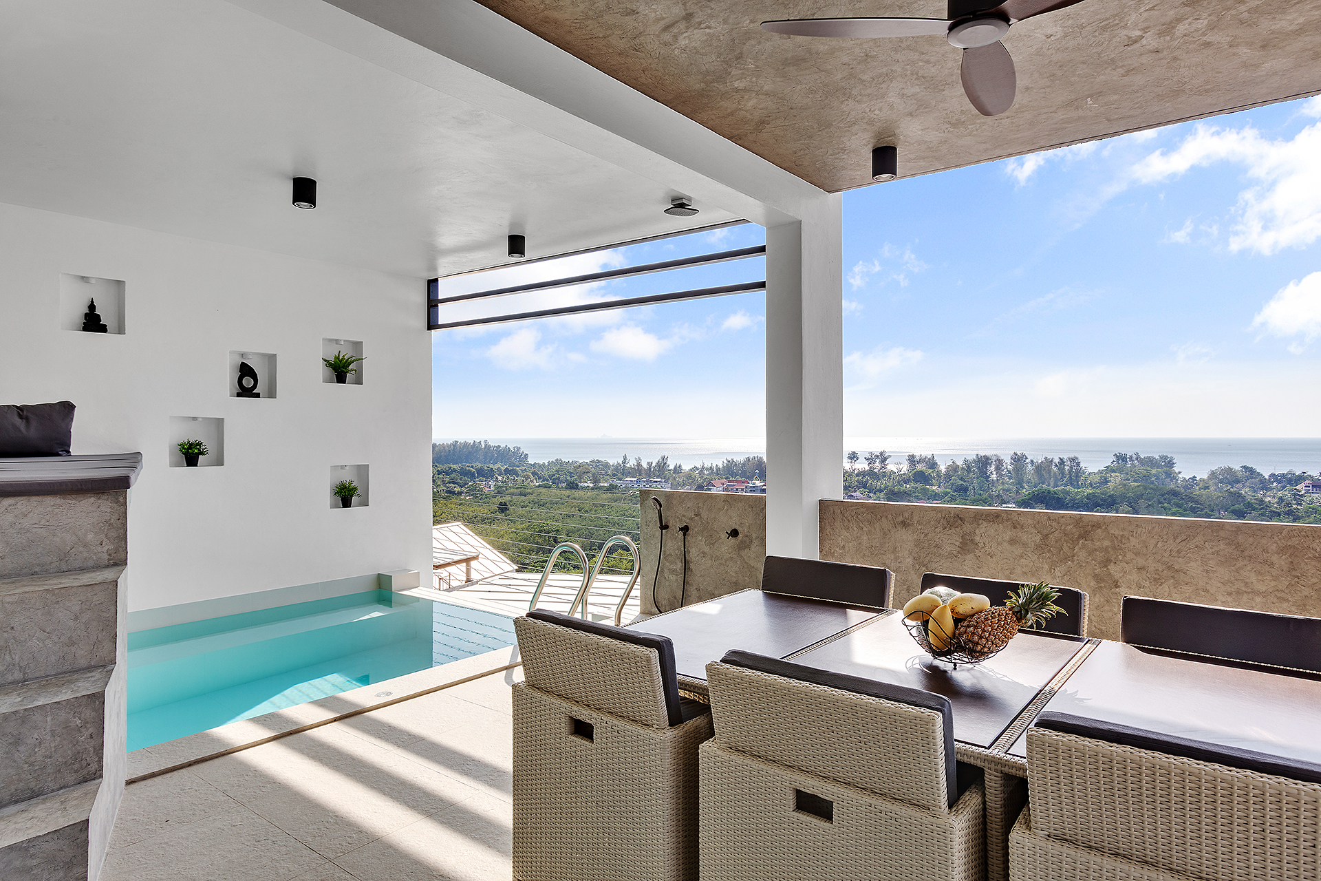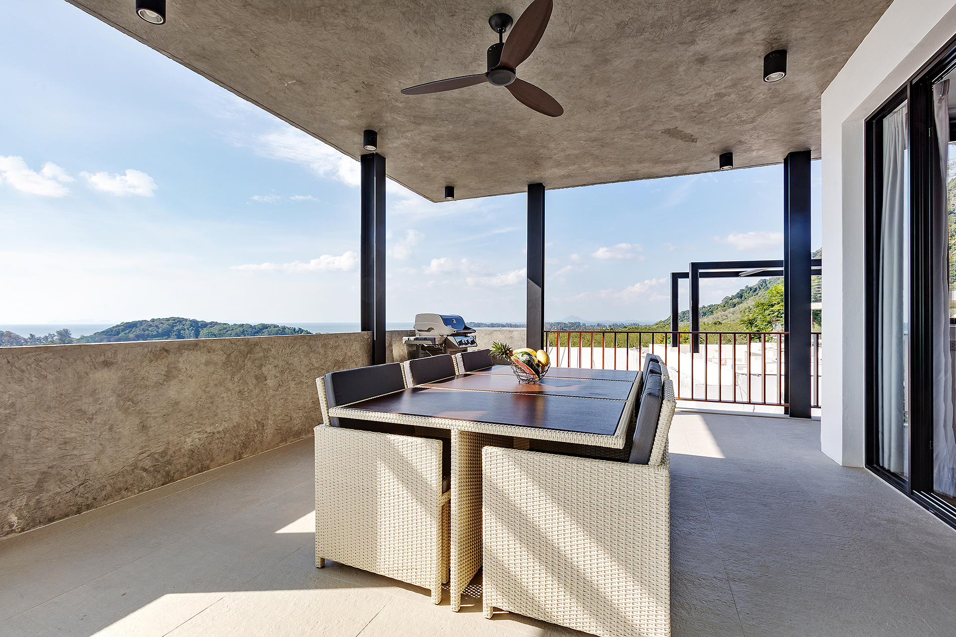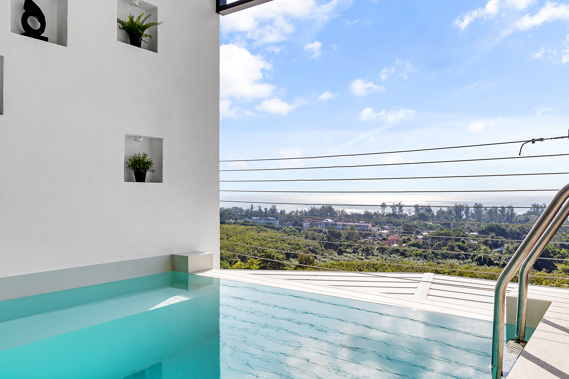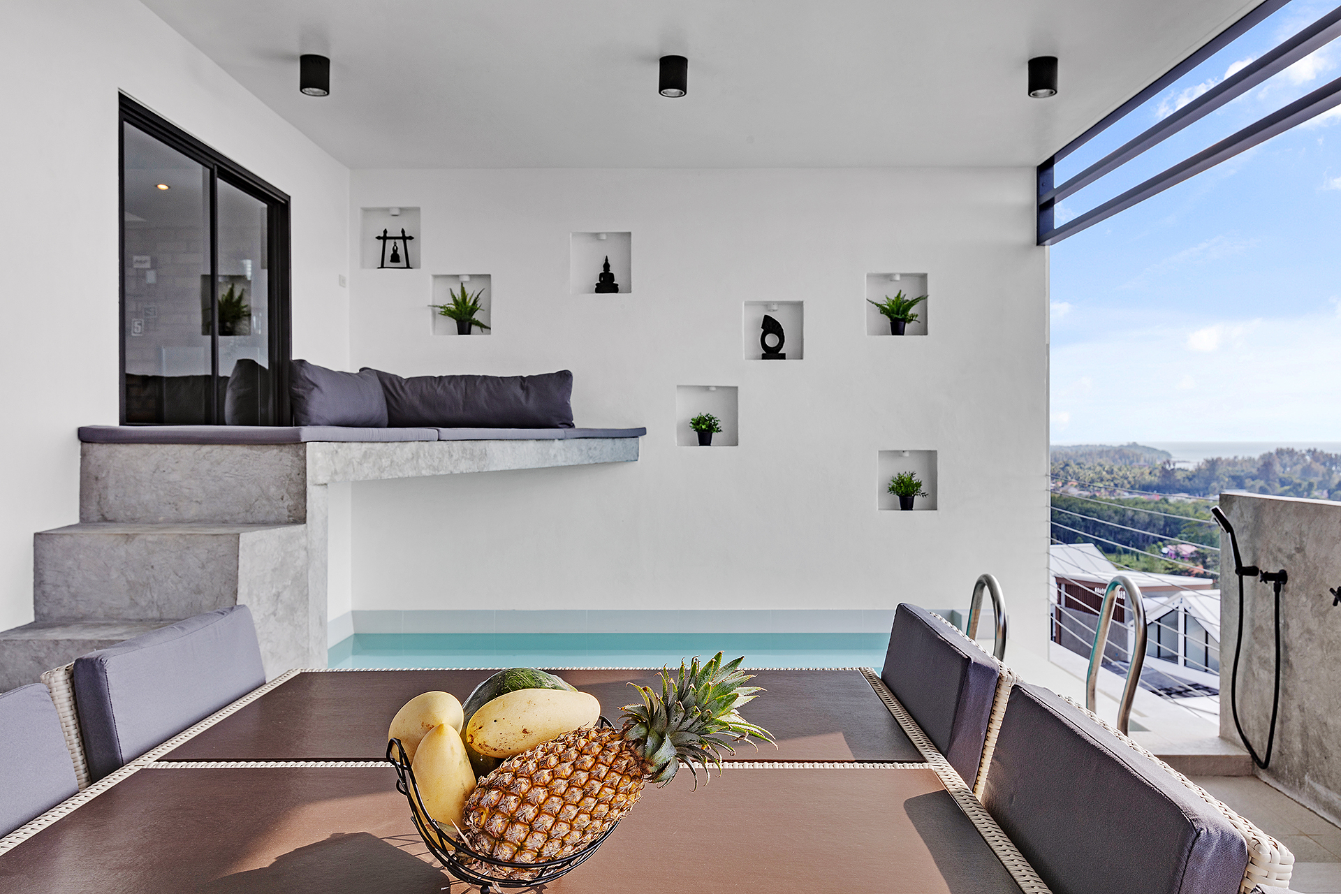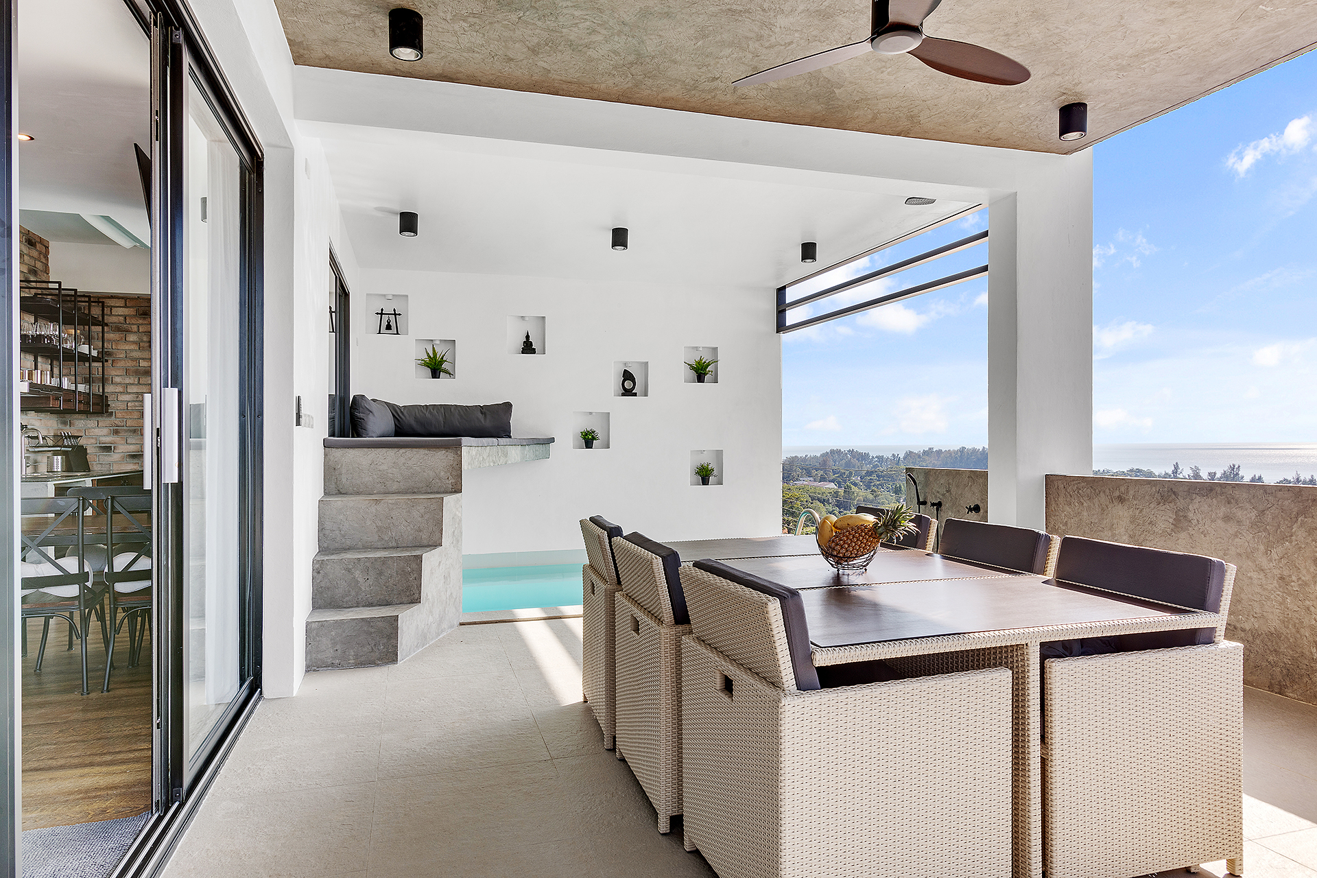 The highlight of B4 is its incredible sea-view terrace, featuring an infinity pool, a luxurious daybed above the pool with a wall fan, a large dining table with a ceiling fan, and a barbecue—creating the ultimate outdoor space for relaxation and dining while taking in the breath-taking surroundings.