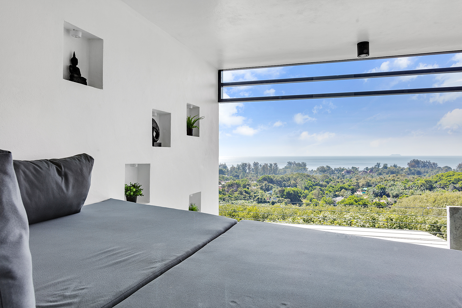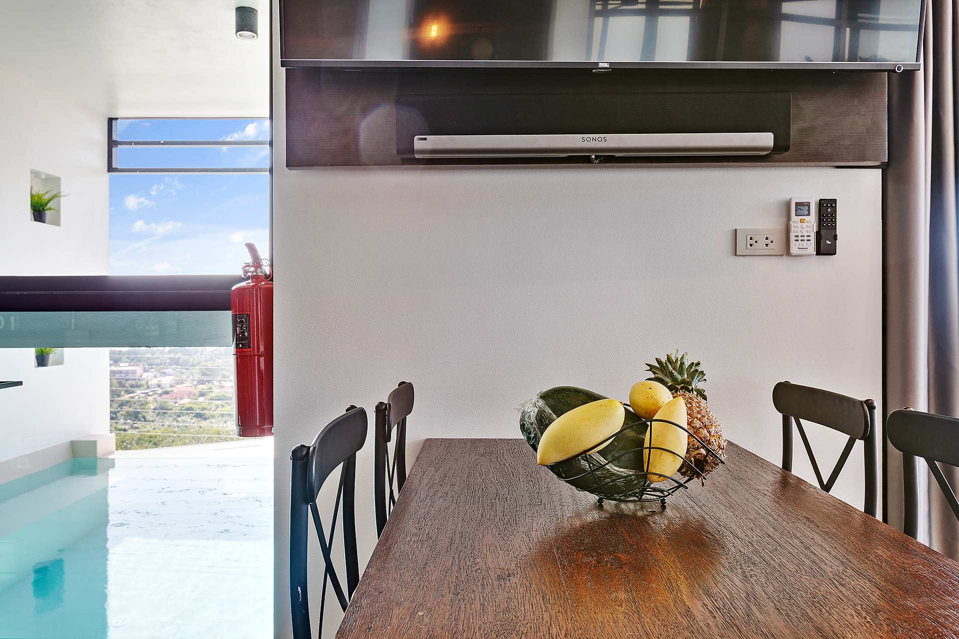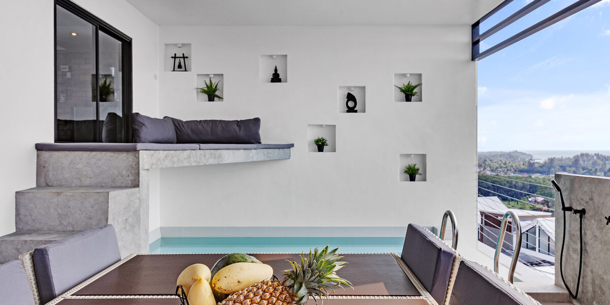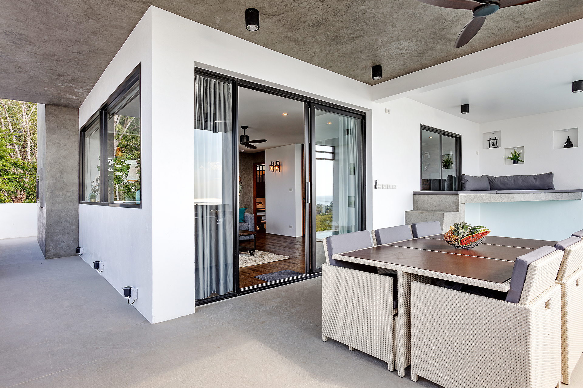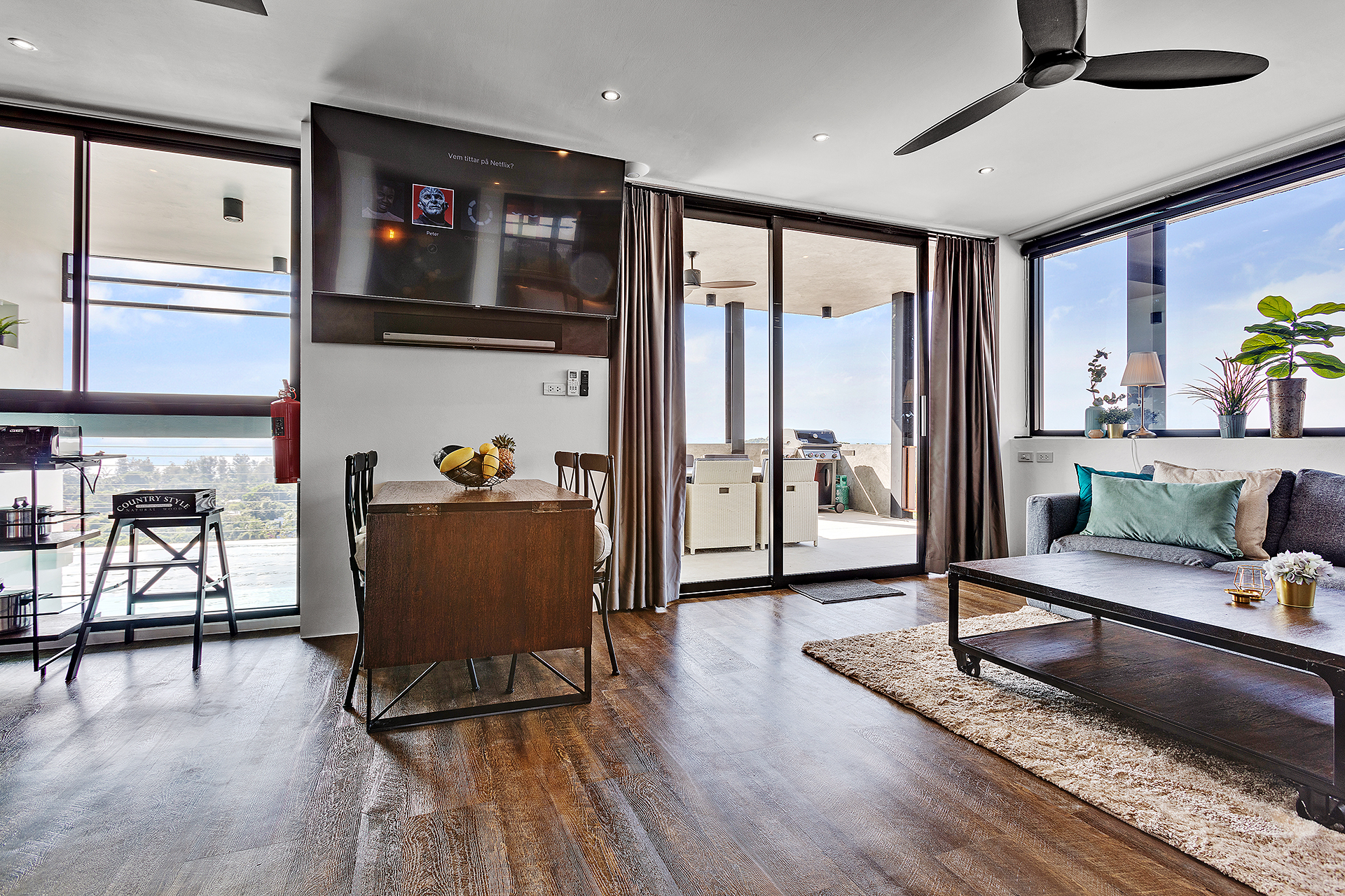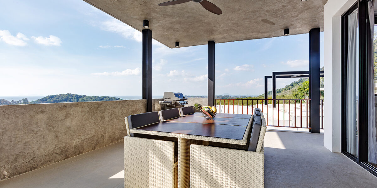 The highlight of B4 is its incredible sea-view terrace, featuring an infinity pool, a luxurious daybed above the pool with a wall fan, a large dining table with a ceiling fan, and a barbecue—creating the ultimate outdoor space for relaxation and dining while taking in the breath-taking surroundings.