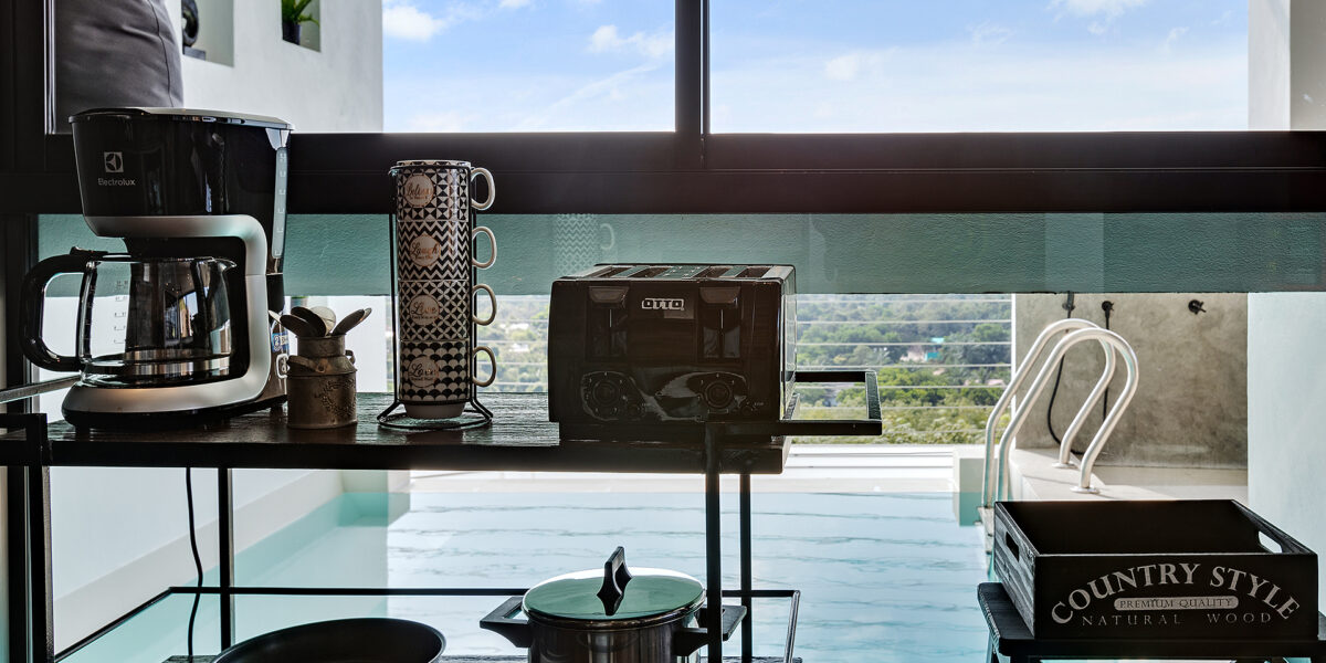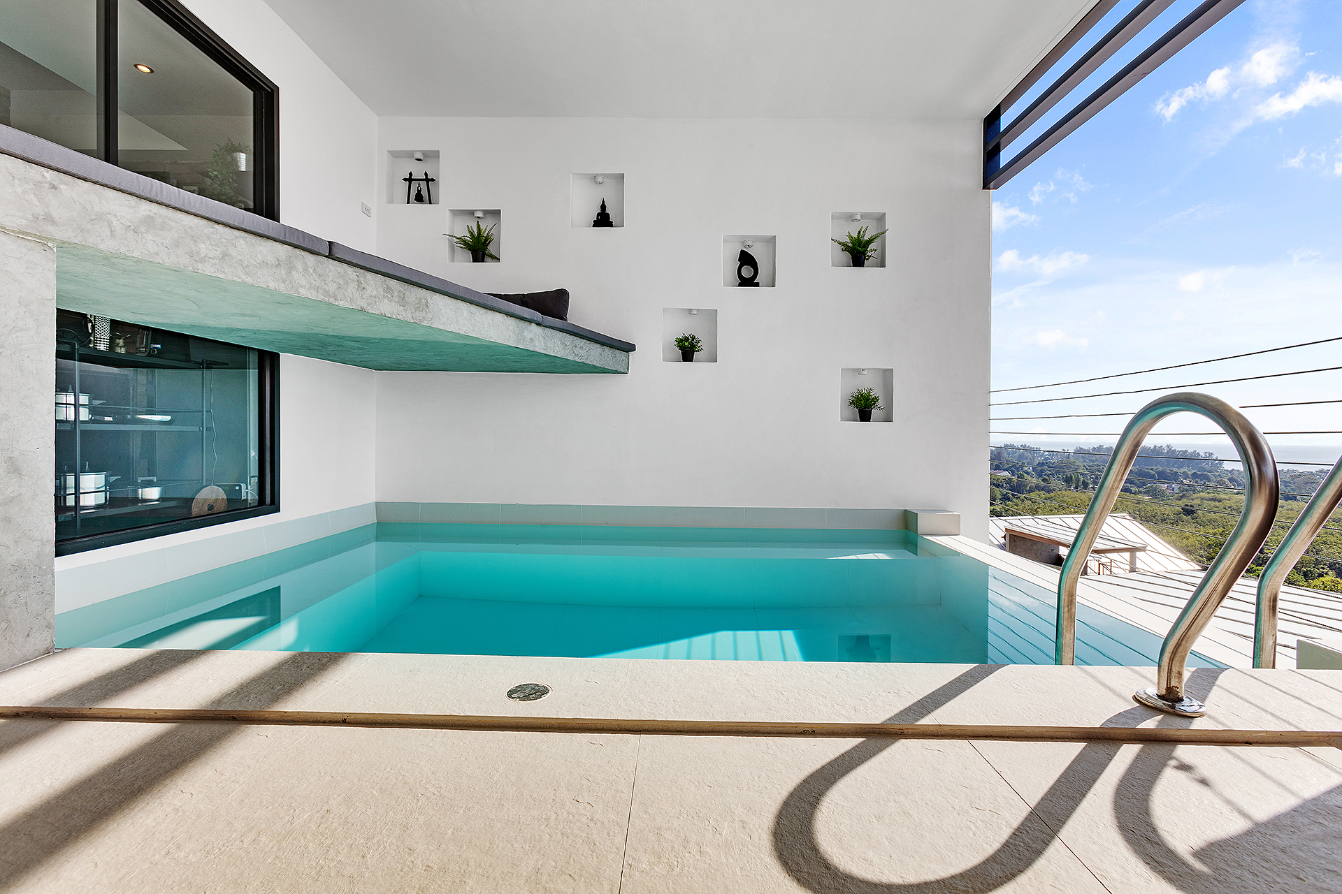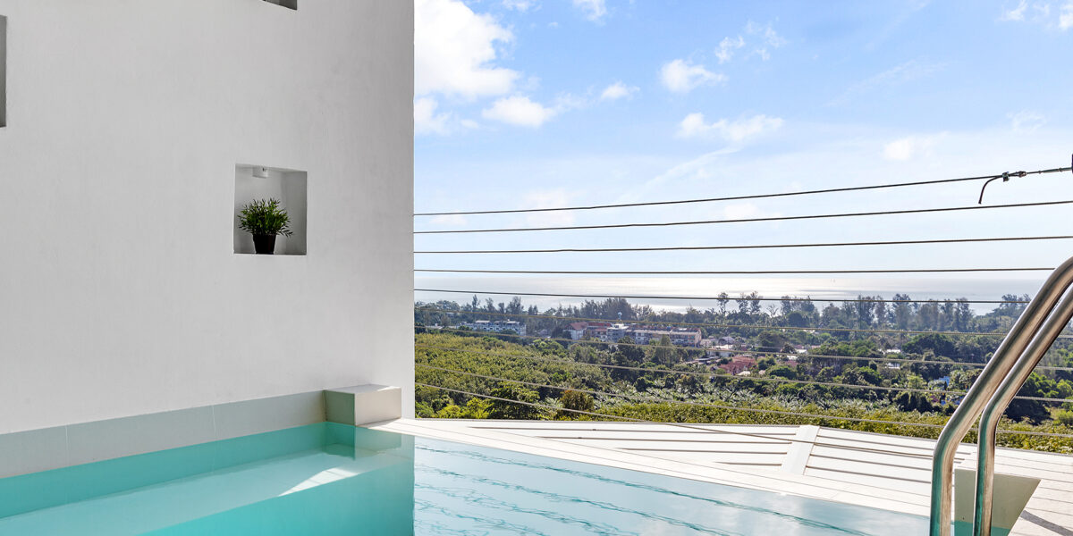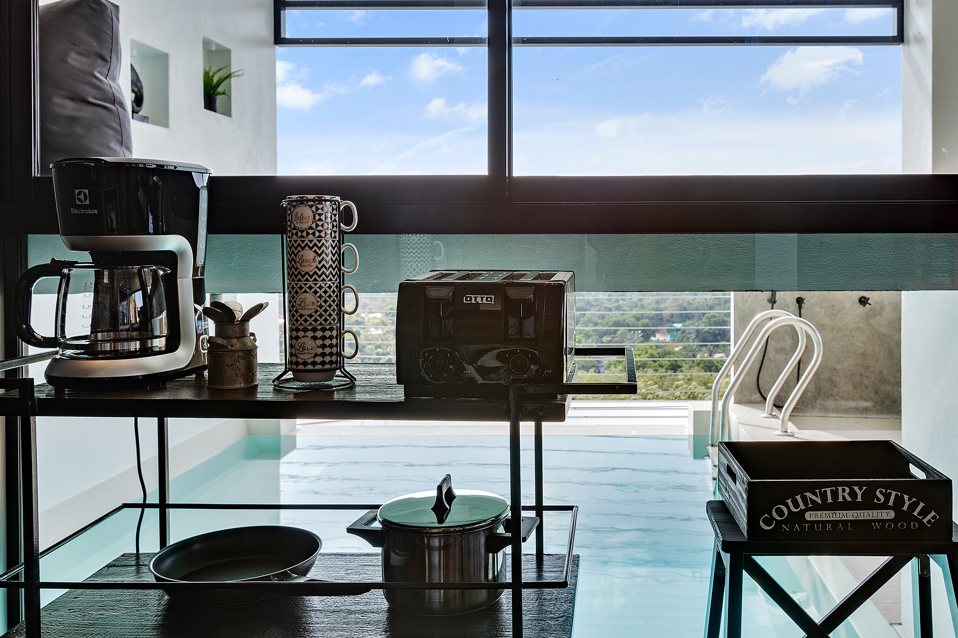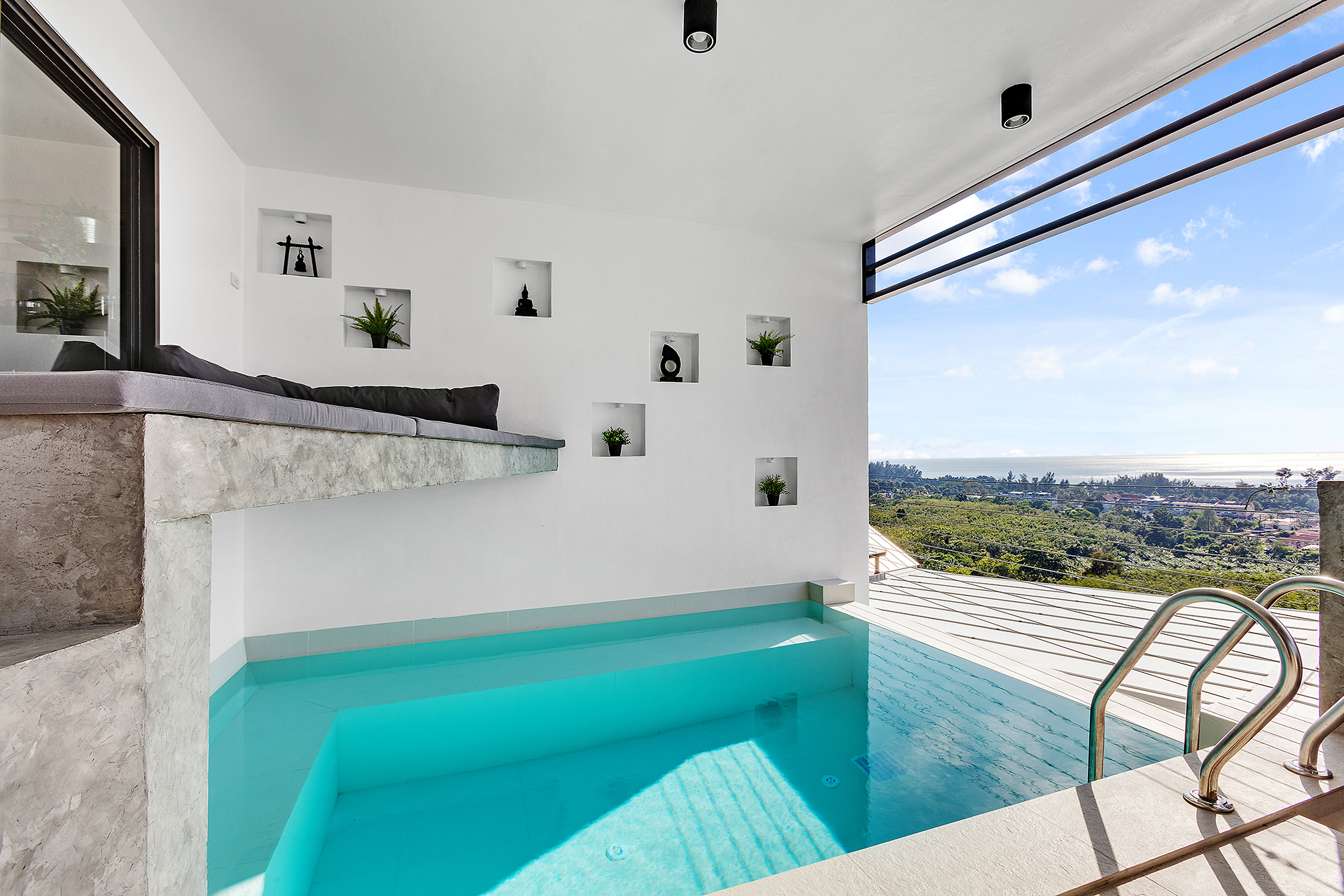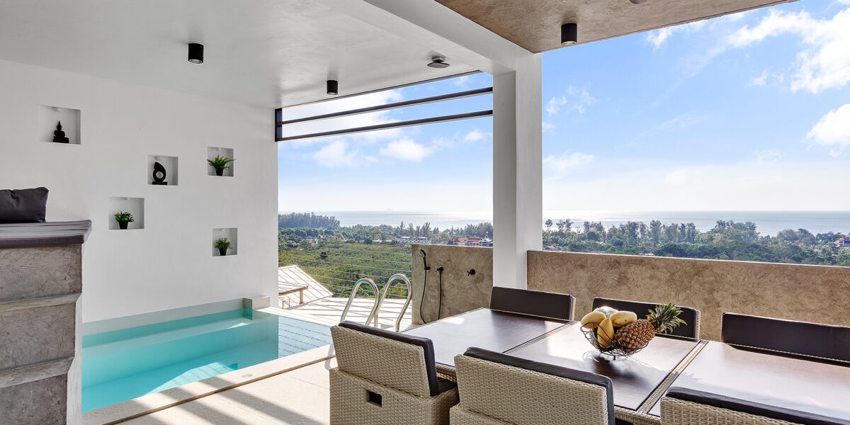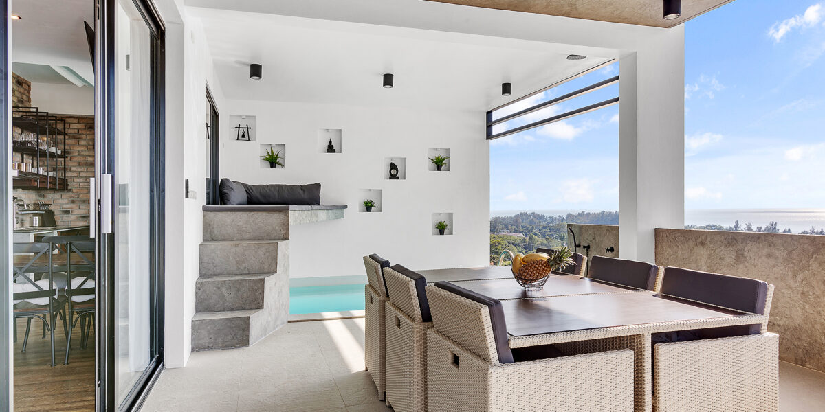 The highlight of B4 is its incredible sea-view terrace, featuring an infinity pool, a luxurious daybed above the pool with a wall fan, a large dining table with a ceiling fan, and a barbecue—creating the ultimate outdoor space for relaxation and dining while taking in the breath-taking surroundings.