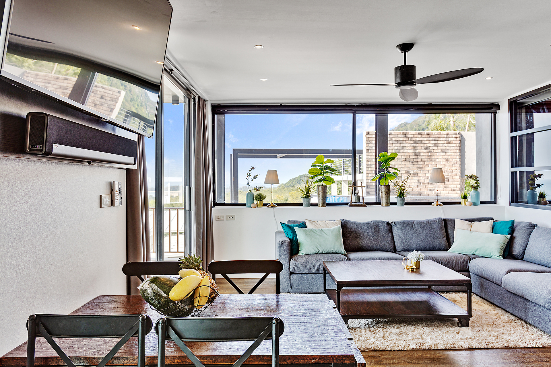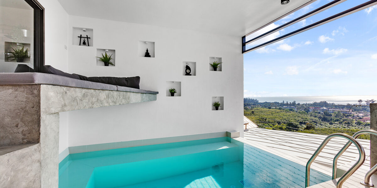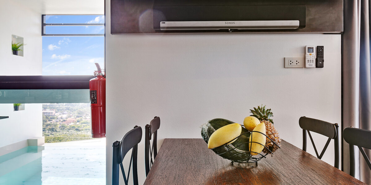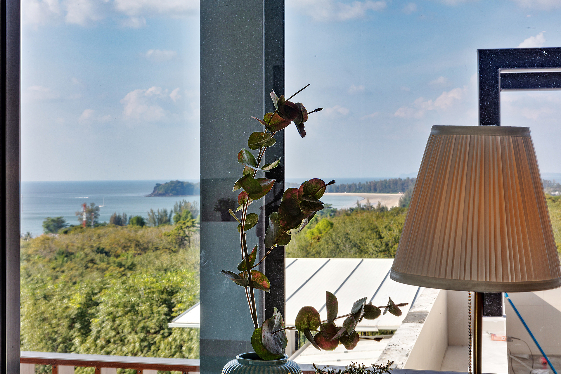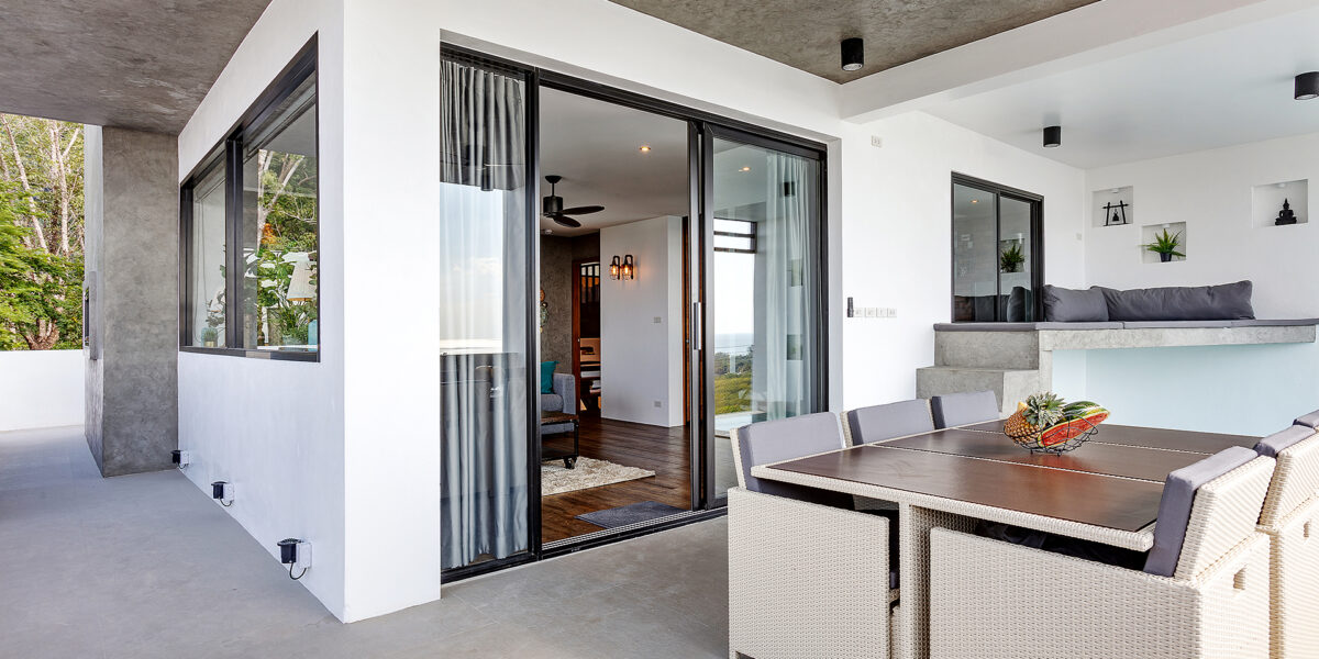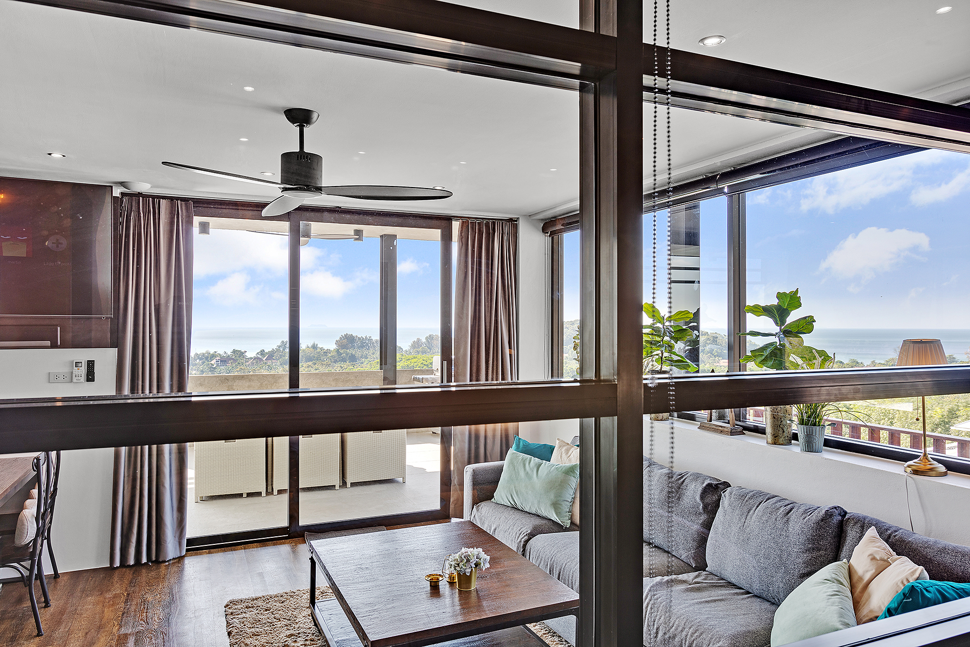 The highlight of B4 is its incredible sea-view terrace, featuring an infinity pool, a luxurious daybed above the pool with a wall fan, a large dining table with a ceiling fan, and a barbecue—creating the ultimate outdoor space for relaxation and dining while taking in the breath-taking surroundings.
