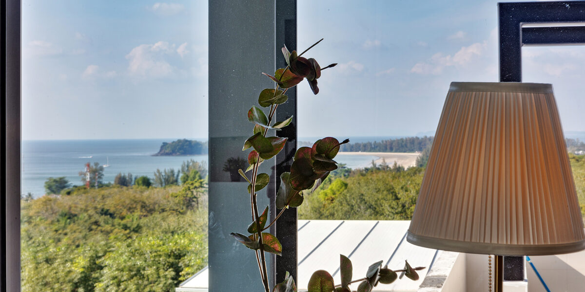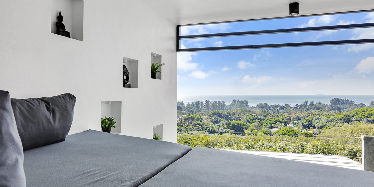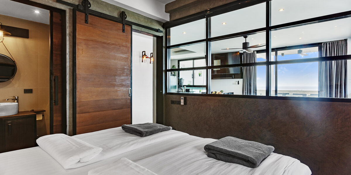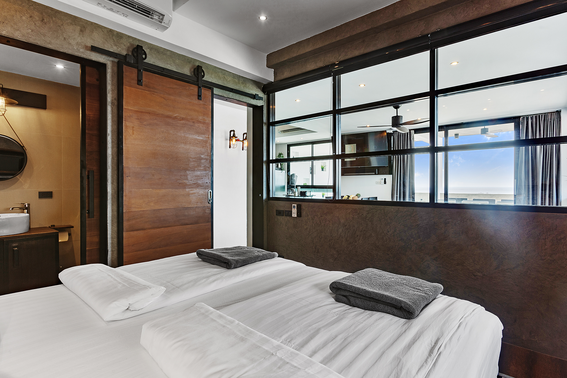 The master bedroom features a king-size bed, a work desk, and an en-suite bathroom. A large interior window enhances the spacious feel of the room by providing a stunning view through the living area and out to the ocean.