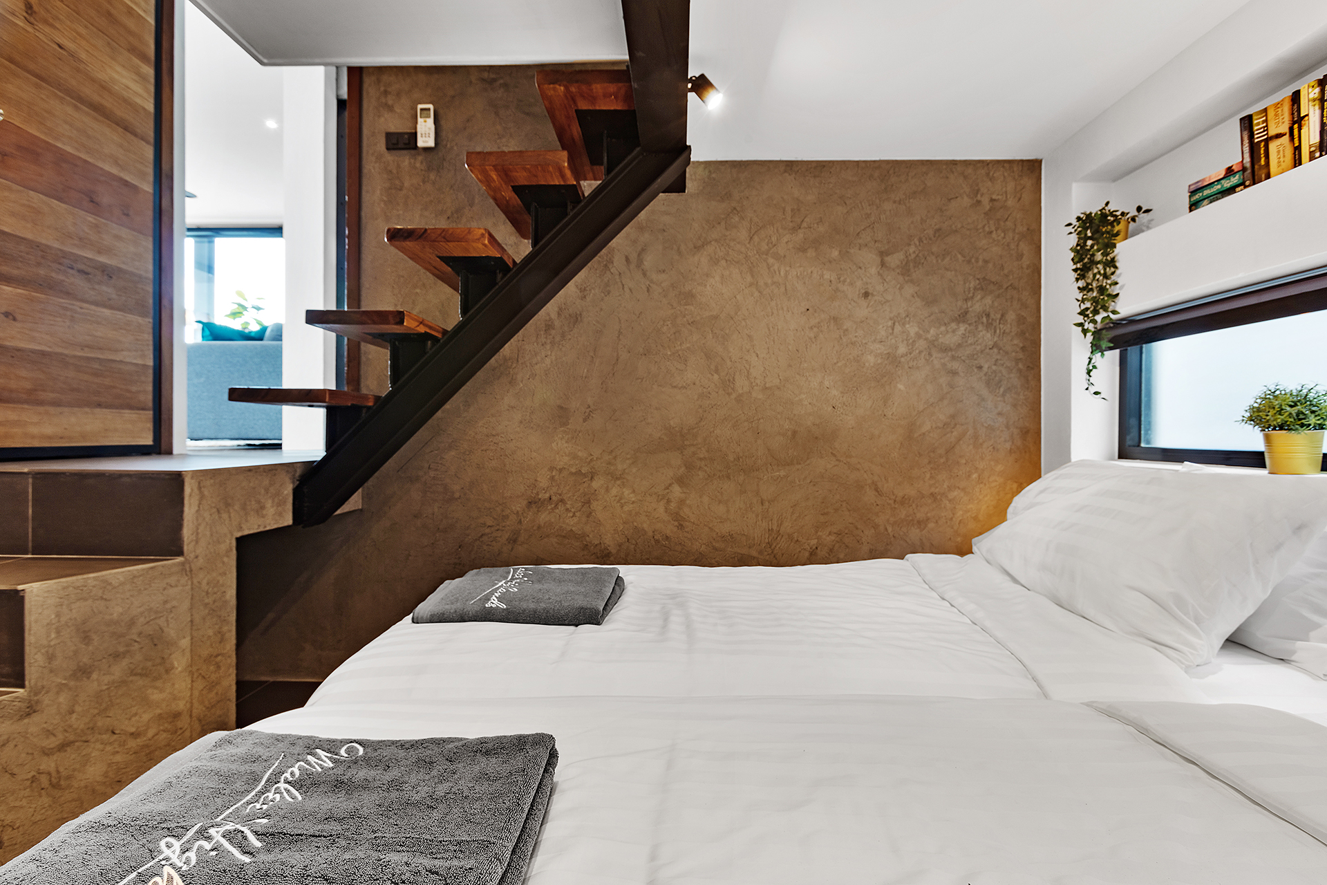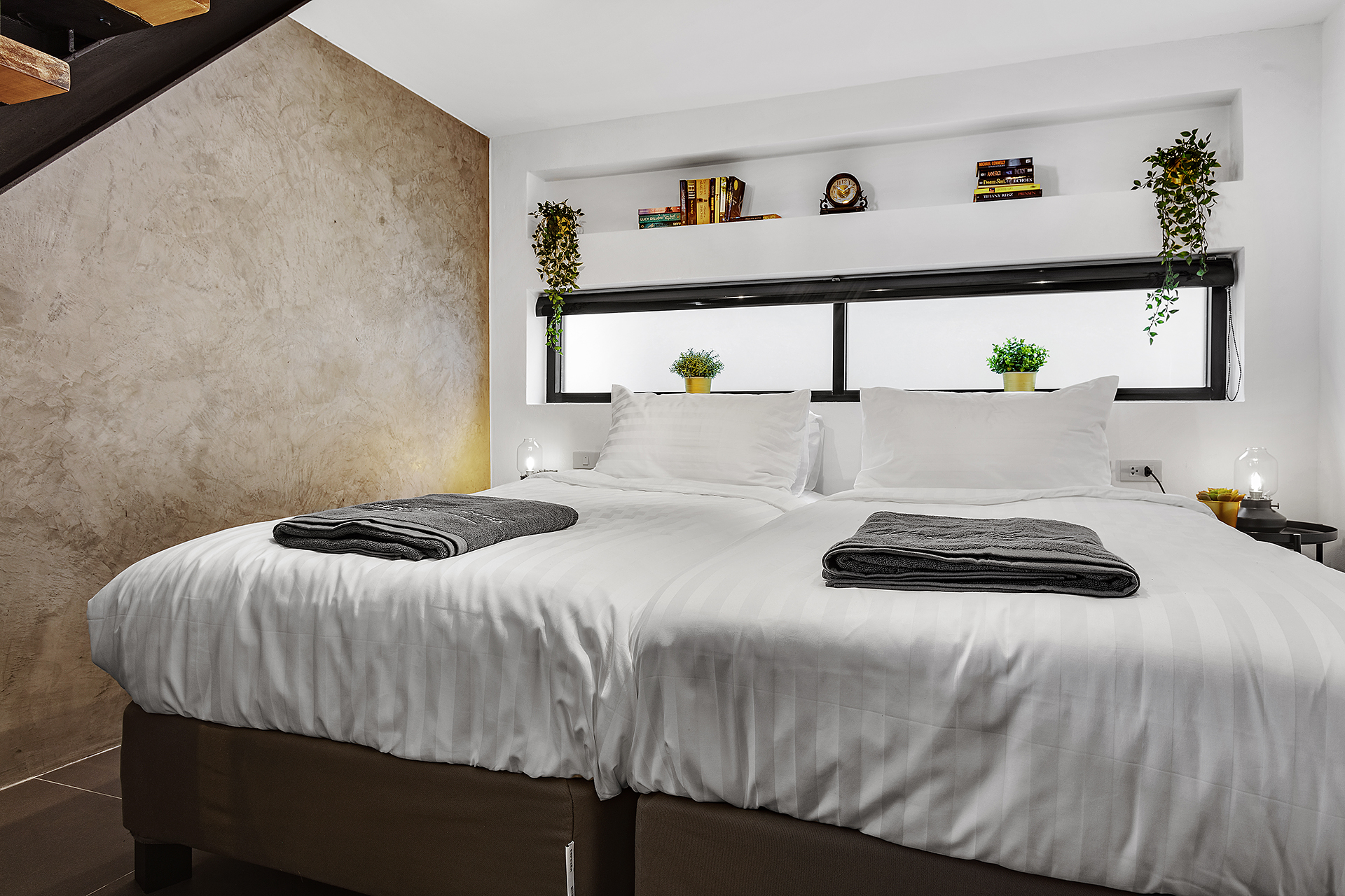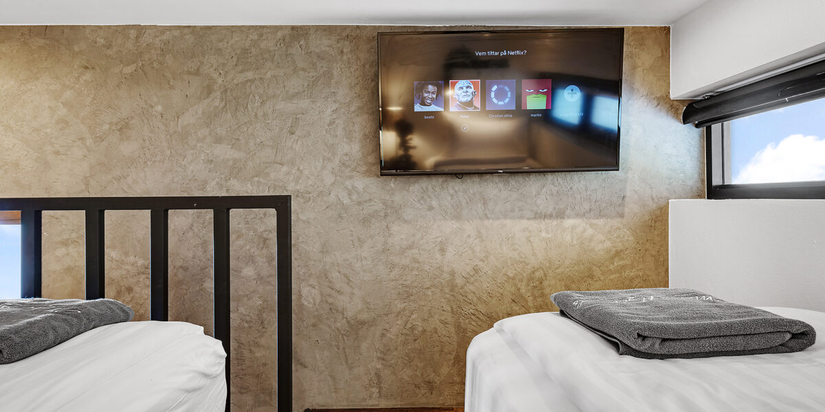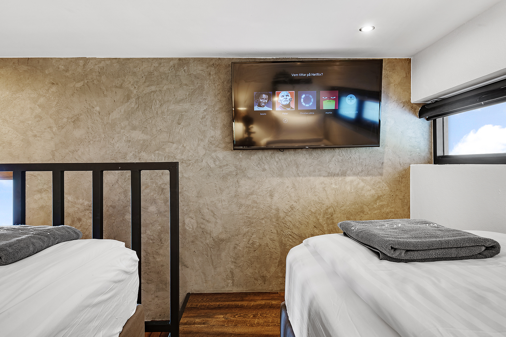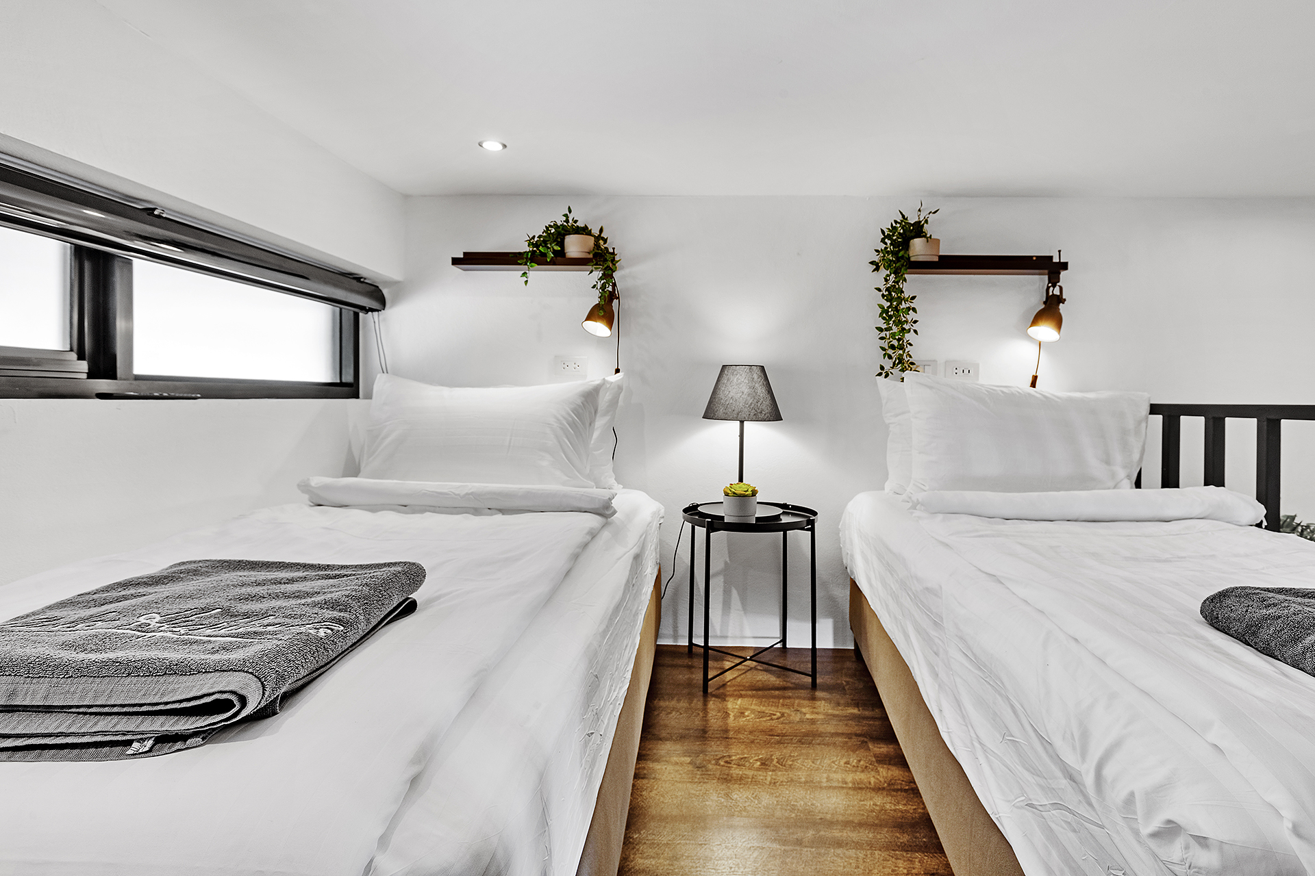 The second bedroom is a cleverly designed two-level space, with two single beds on the lower level and two single beds on the upper level, along with a TV—perfect for families or groups needing flexible sleeping arrangements. All beds are fitted with high-quality IKEA mattresses and premium linens to ensure a restful night’s sleep.
