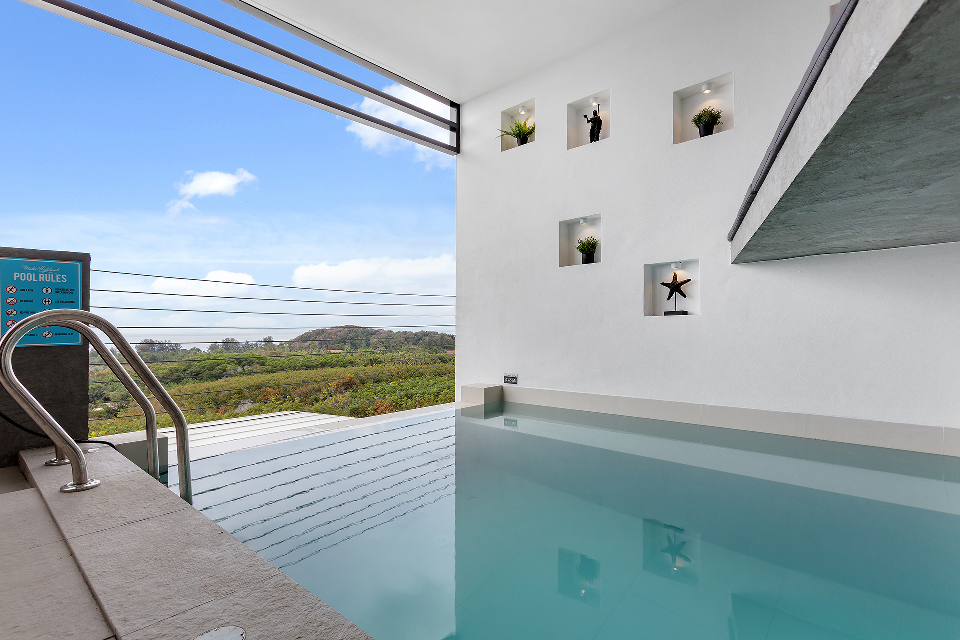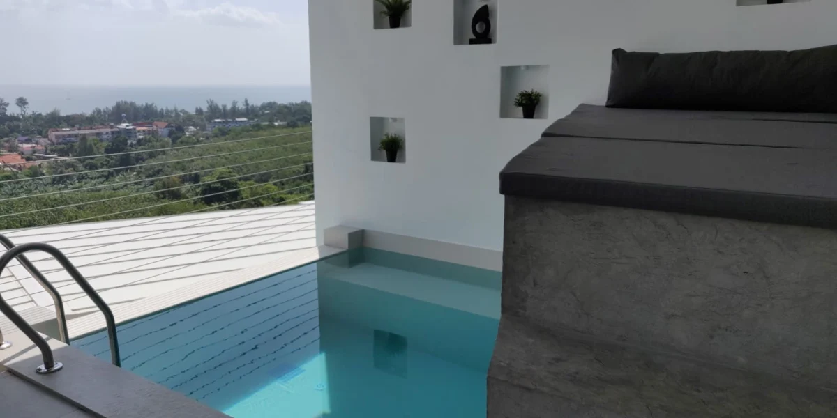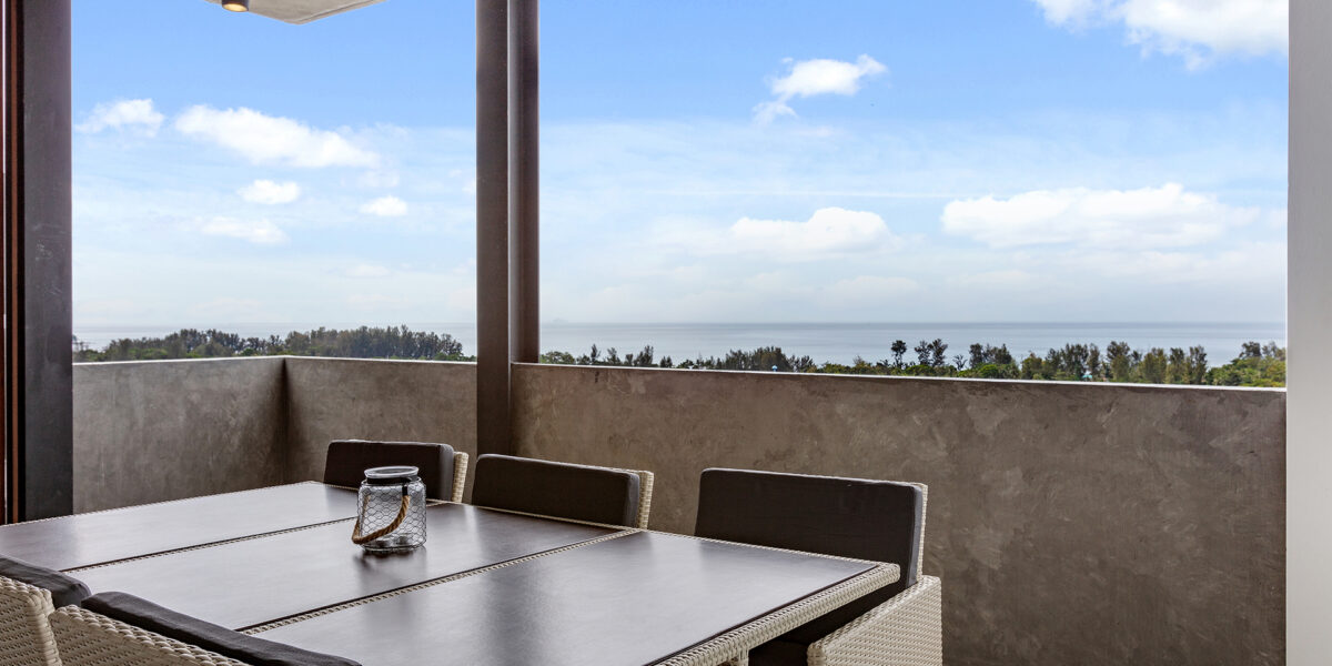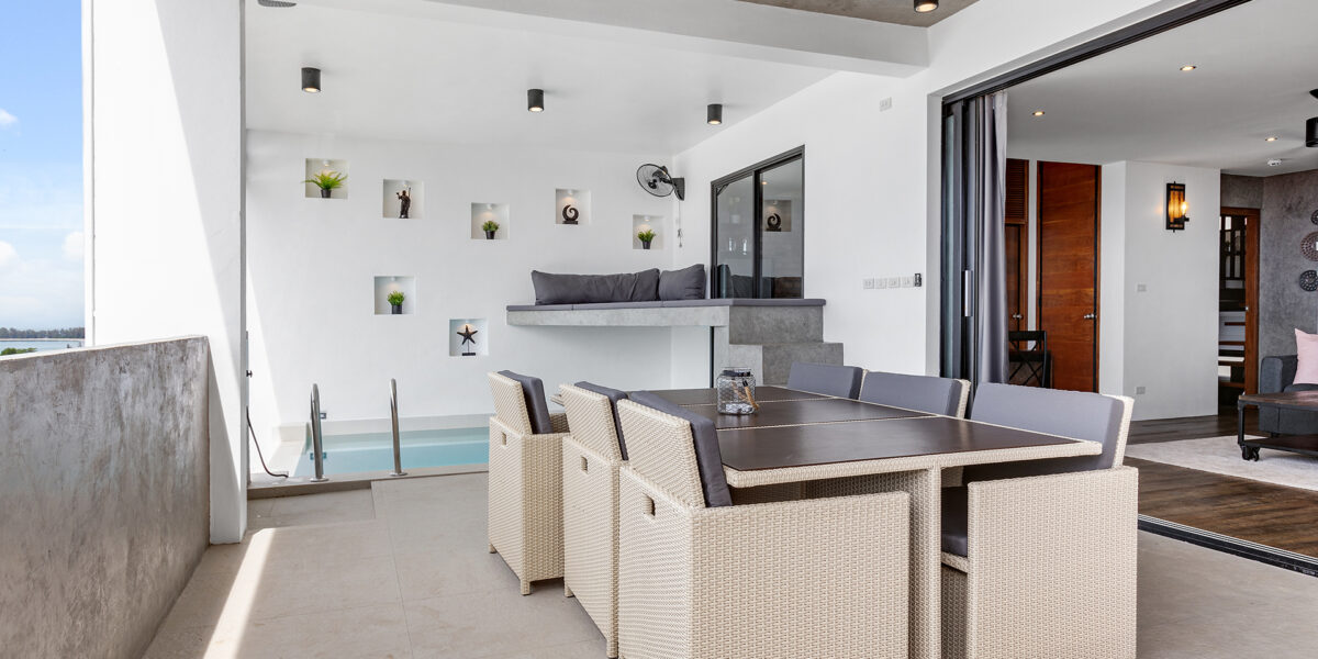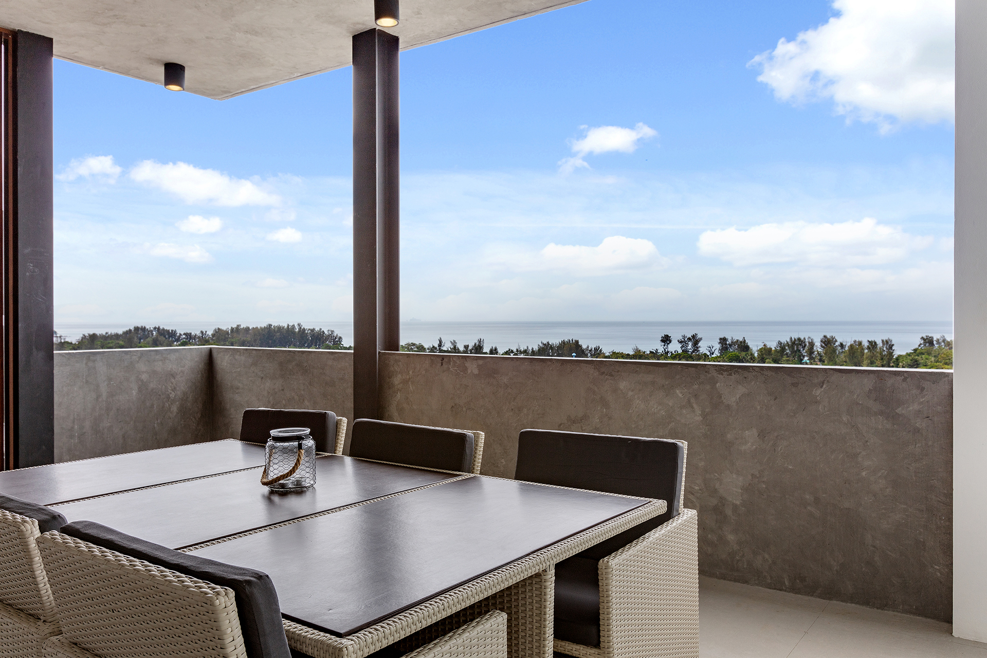 The highlight of B4 is its incredible sea-view terrace, featuring an infinity pool, a luxurious daybed above the pool with a wall fan, a large dining table with a ceiling fan, and a barbecue—creating the ultimate outdoor space for relaxation and dining while taking in the breath-taking surroundings.