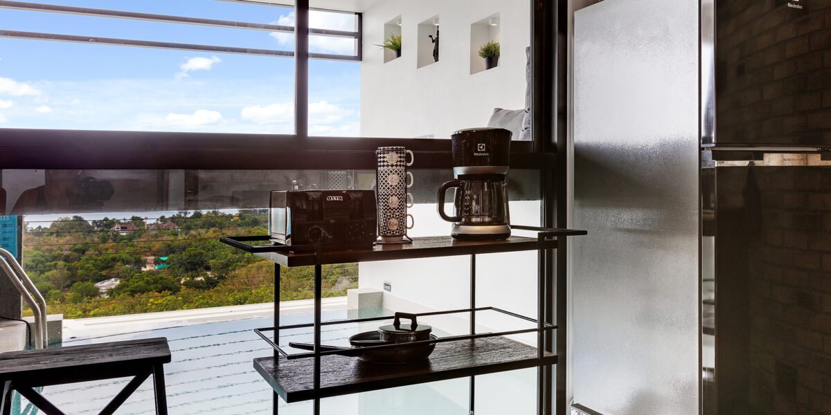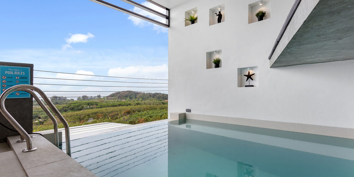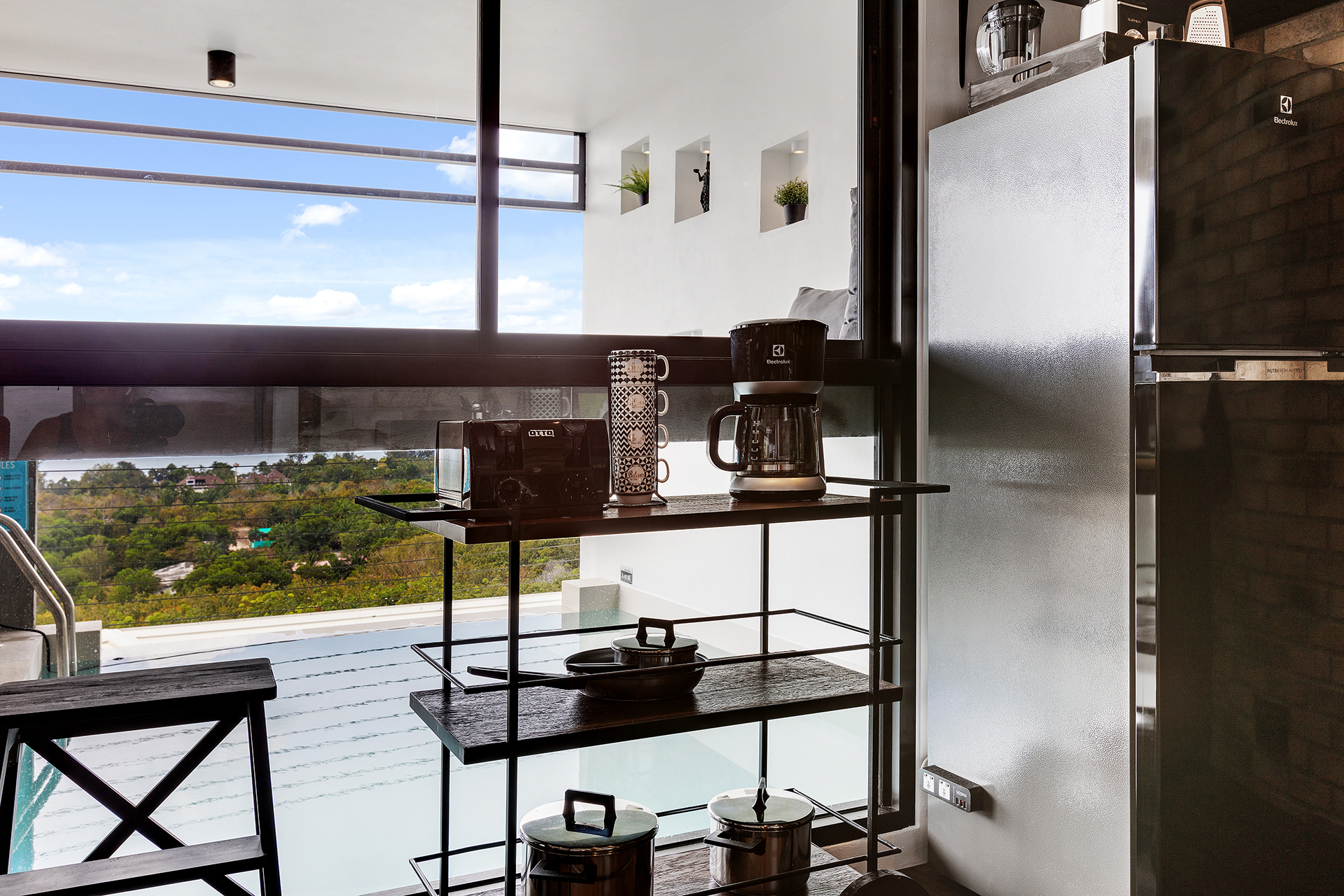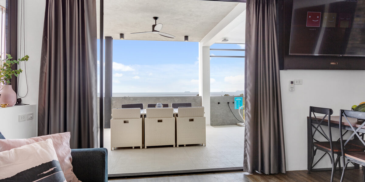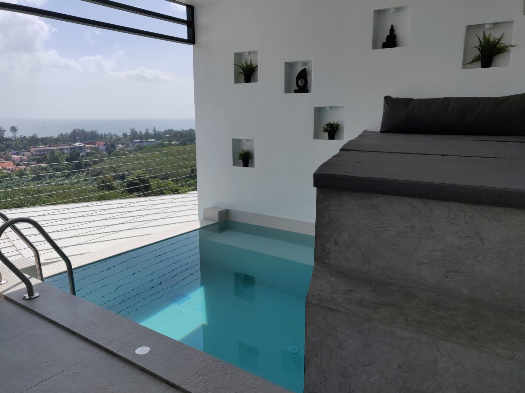 The highlight of B4 is its incredible sea-view terrace, featuring an infinity pool, a luxurious daybed above the pool with a wall fan, a large dining table with a ceiling fan, and a barbecue—creating the ultimate outdoor space for relaxation and dining while taking in the breath-taking surroundings.