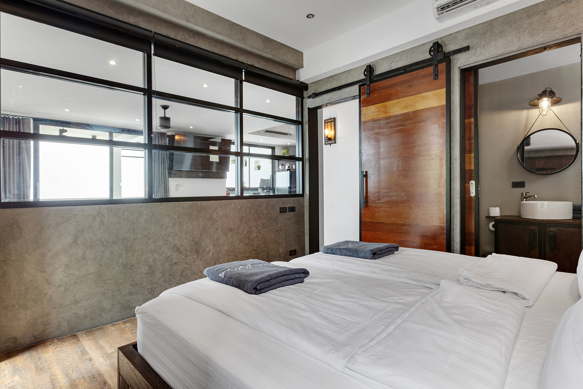 The master bedroom features a king-size bed, a work desk, and an en-suite bathroom. A large interior window enhances the spacious feel of the room by providing a stunning view through the living area and out to the ocean.