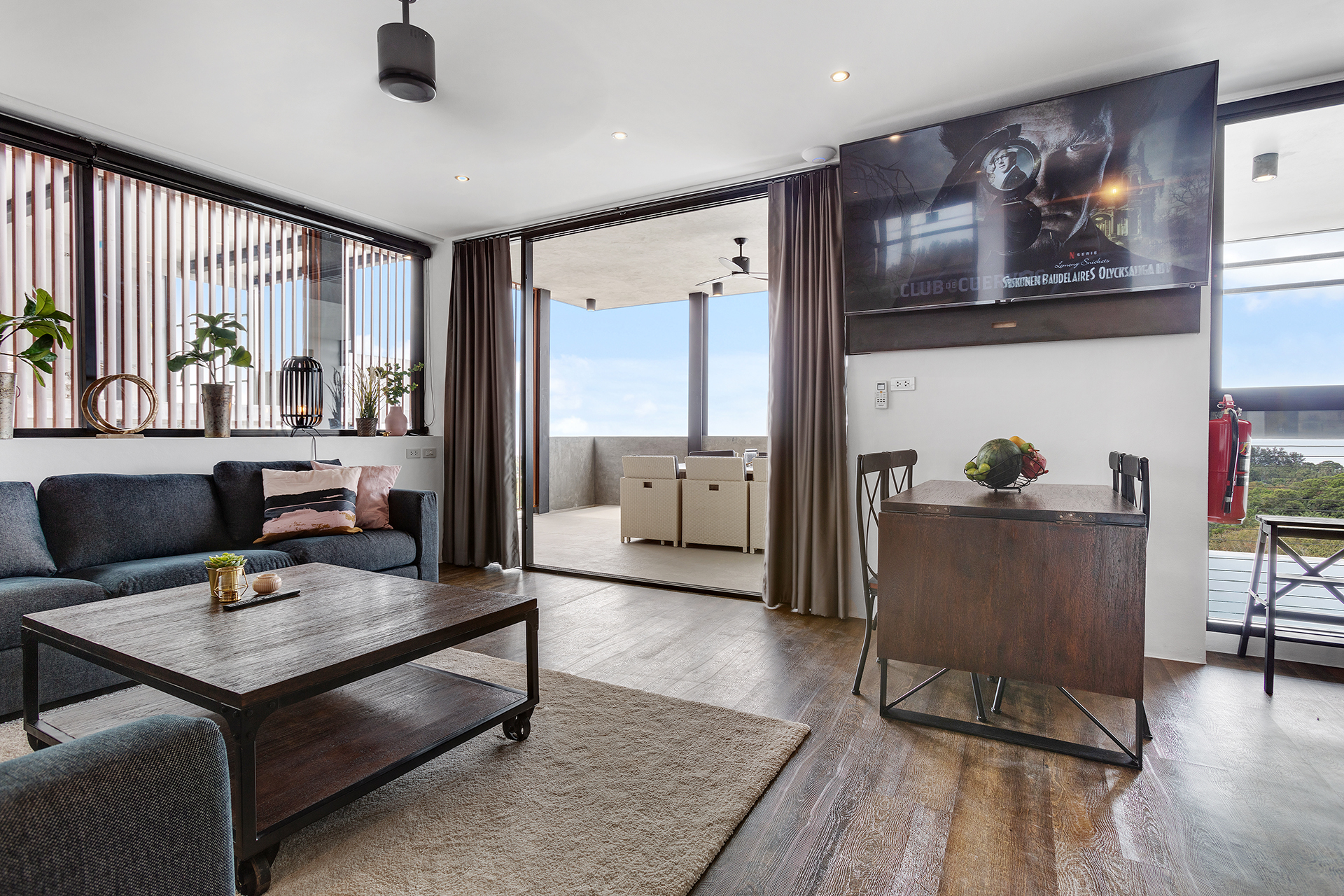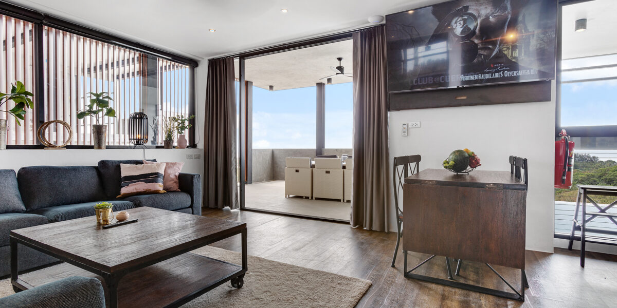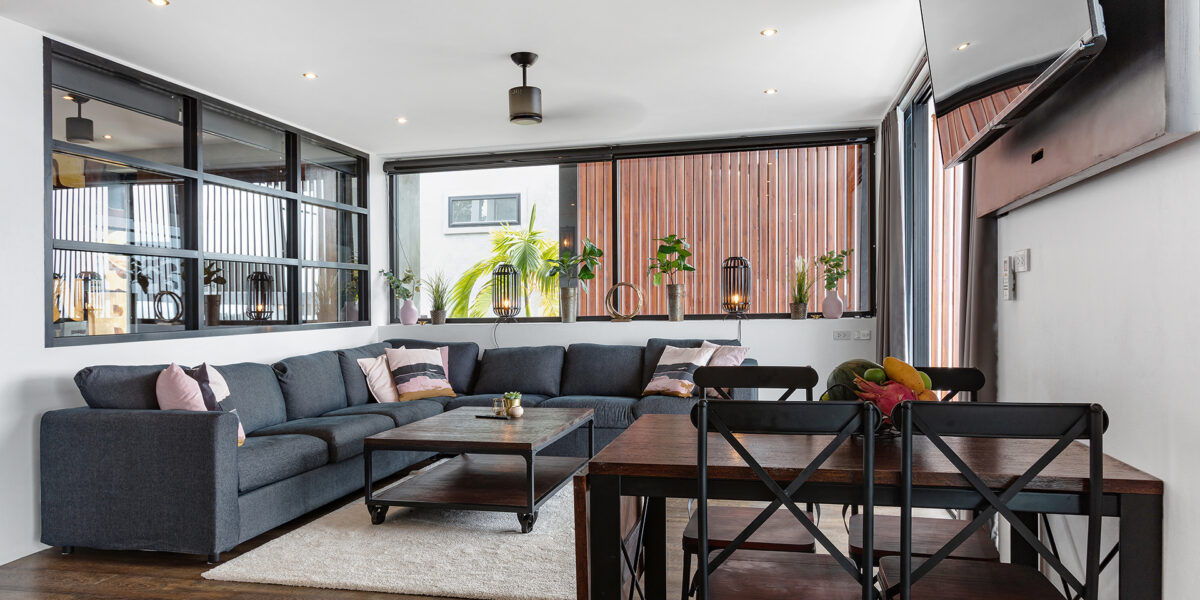 The living area is designed for comfort and entertainment, with a massive 65-inch smart TV that can be positioned for optimal viewing from anywhere in the room. A large, cozy sofa invites you to relax, while the sliding glass doors open fully, allowing for uninterrupted ocean views and refreshing sea breezes. The dining area offers flexible seating with expandable tables, so you can choose to dine inside or outside on the sea-view terrace.