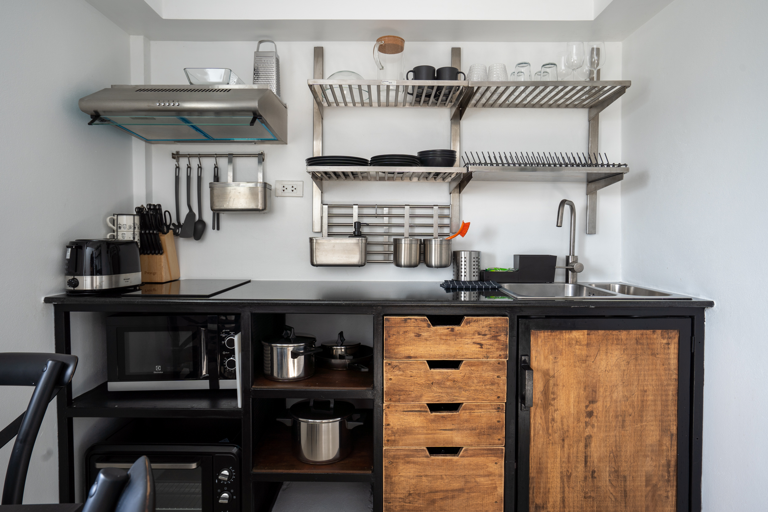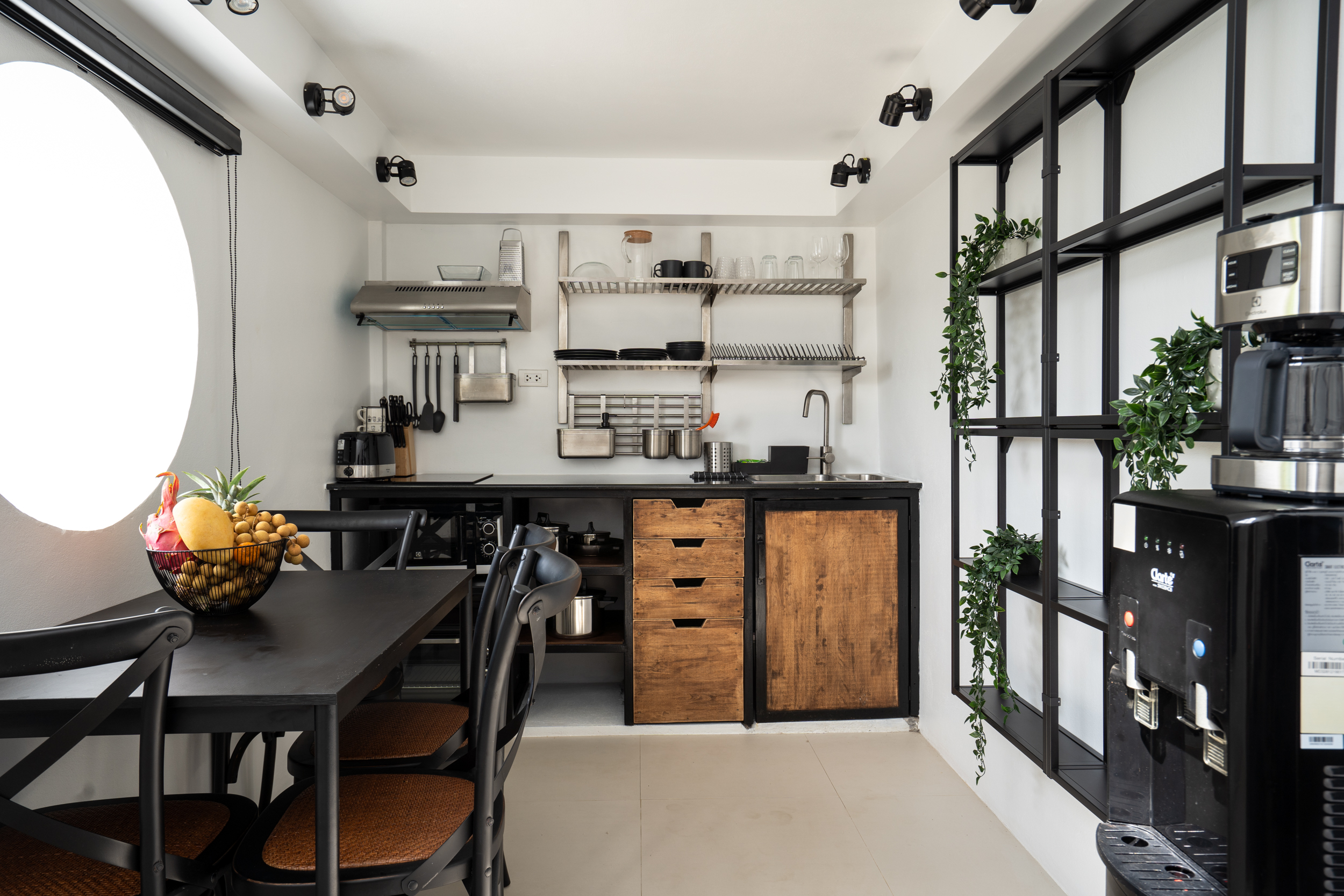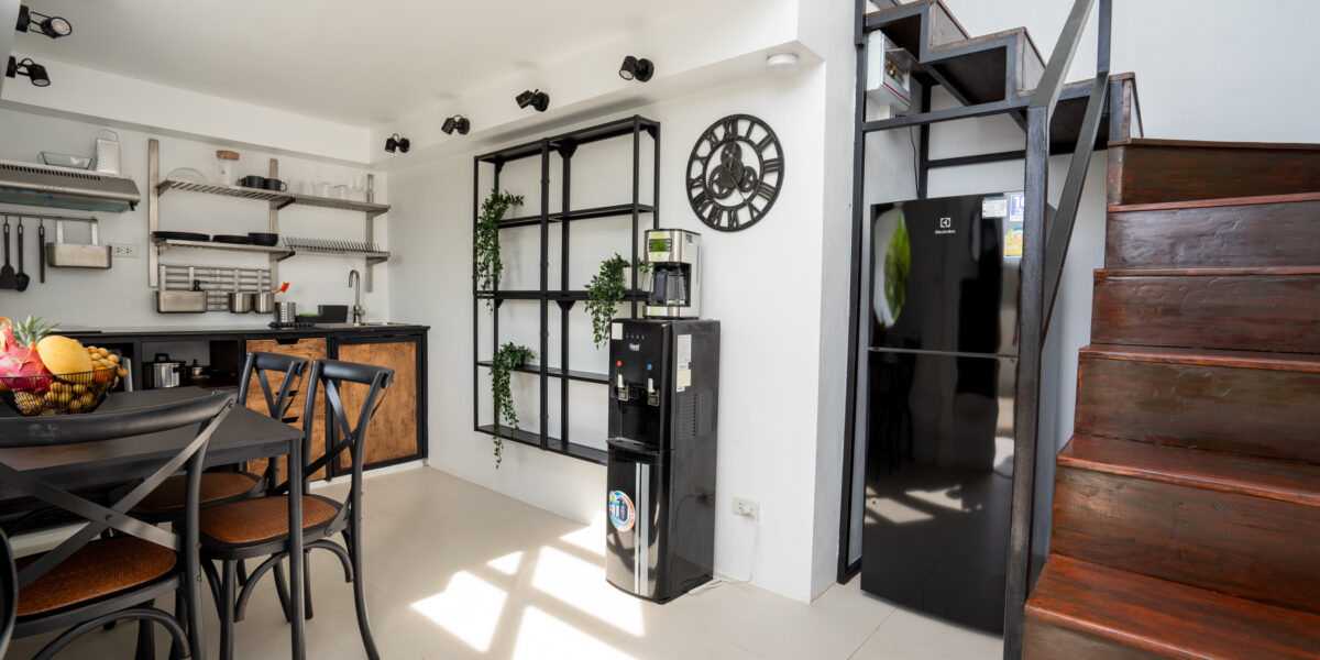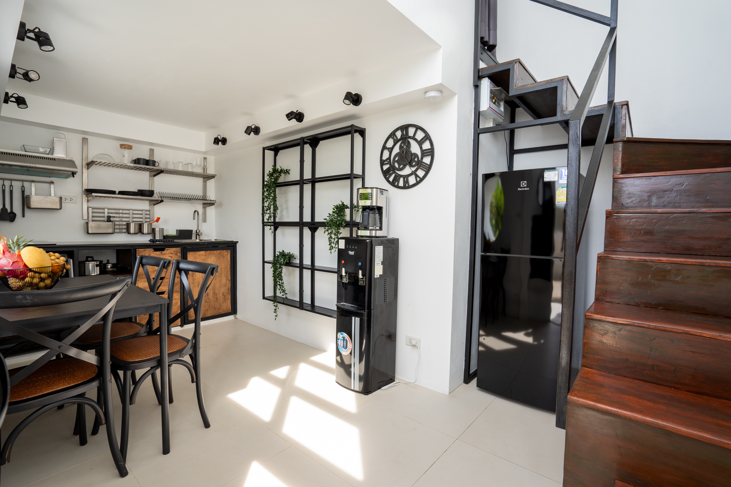 Upon entering, you’ll find a small outdoor patio just outside the front door, with seating for two—perfect for enjoying a morning coffee or fresh air. Inside, the open-plan kitchen and dining area downstairs is fully equipped with a two-burner cooktop, microwave, full-size refrigerator, toaster, coffee machine, and oven, as well as all the necessary pots, utensils, and dishes. The dining table seats four, perfect for meals or work.