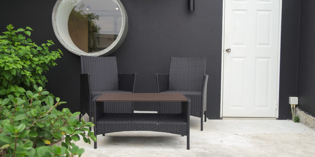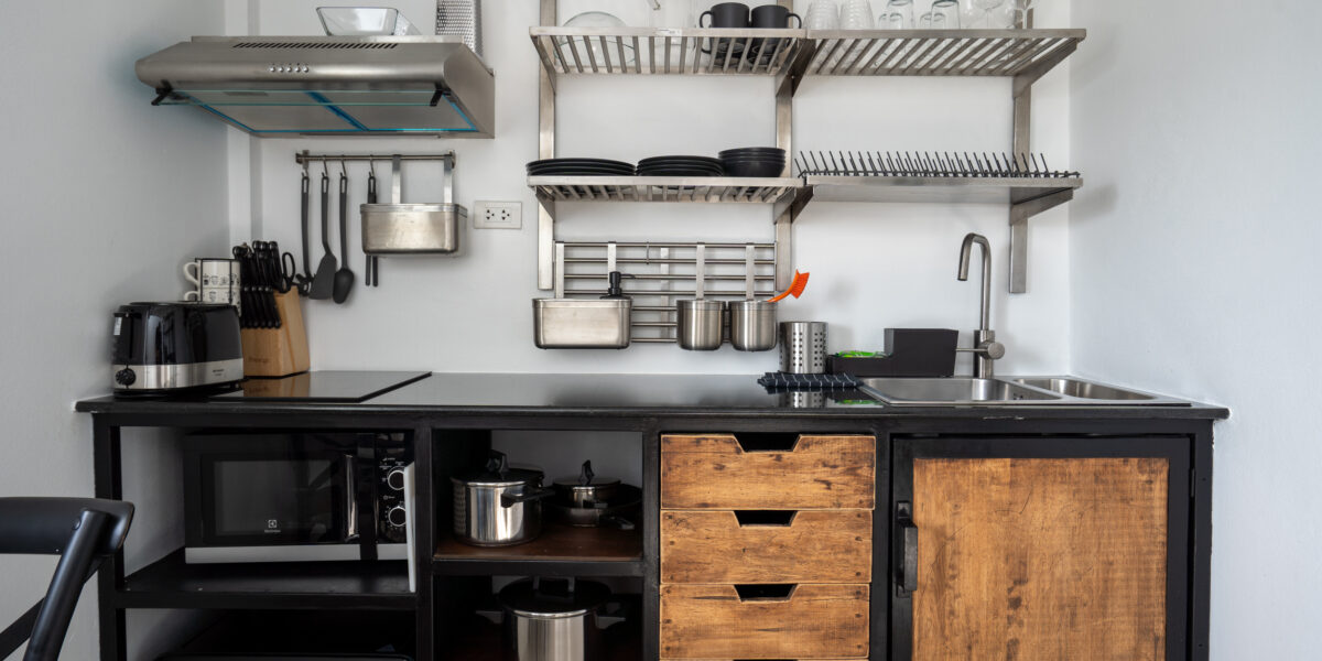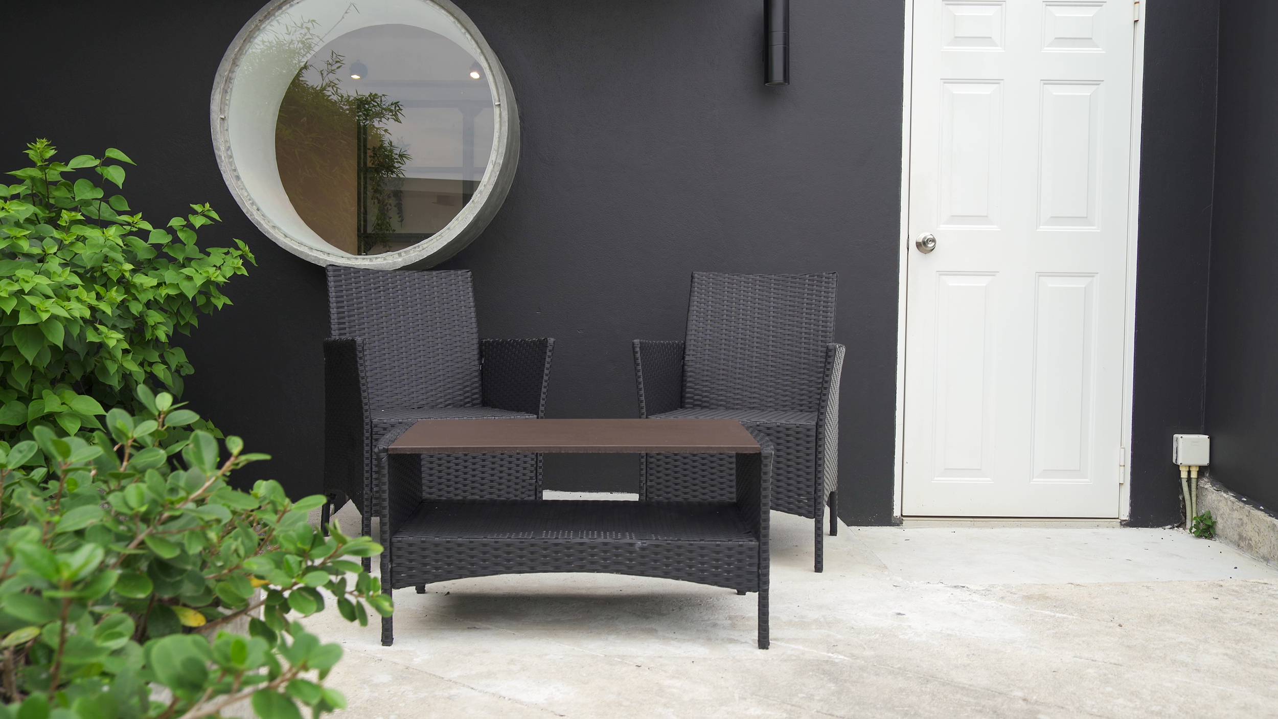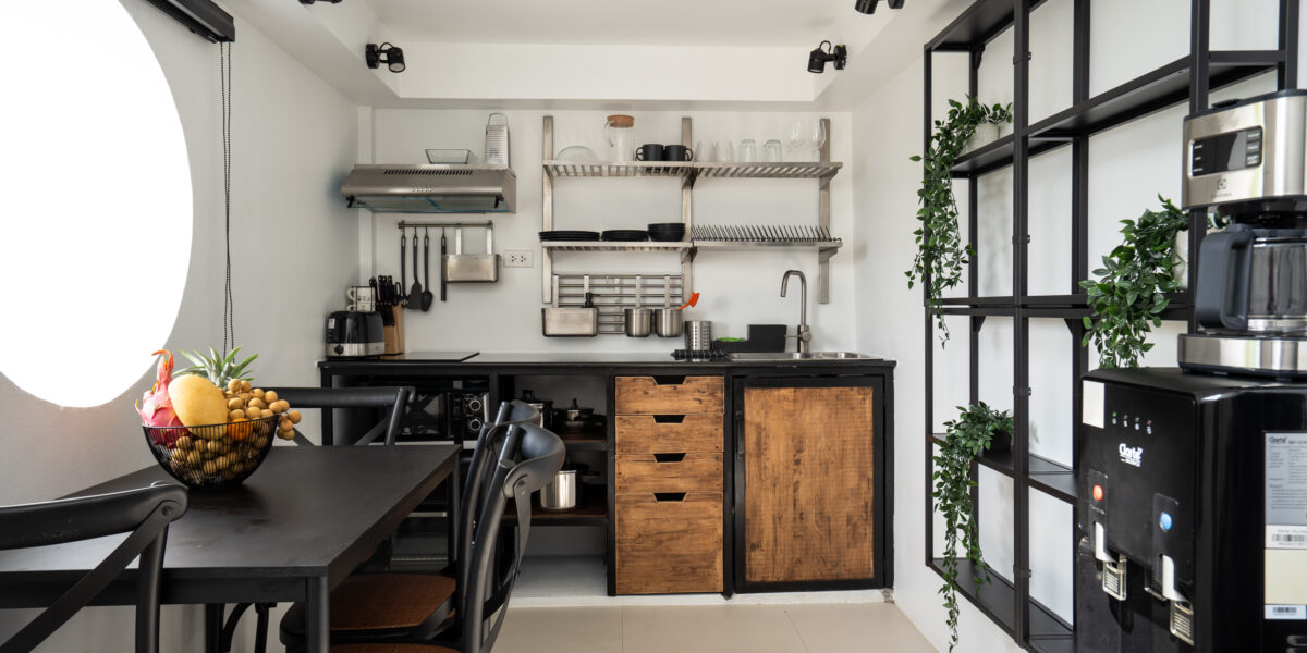 Upon entering, you’ll find a small outdoor patio just outside the front door, with seating for two—perfect for enjoying a morning coffee or fresh air. Inside, the open-plan kitchen and dining area downstairs is fully equipped with a two-burner cooktop, microwave, full-size refrigerator, toaster, coffee machine, and oven, as well as all the necessary pots, utensils, and dishes. The dining table seats four, perfect for meals or work.