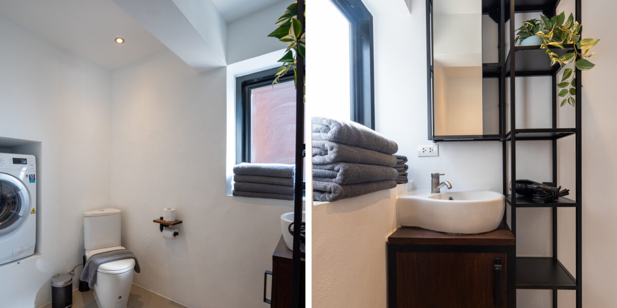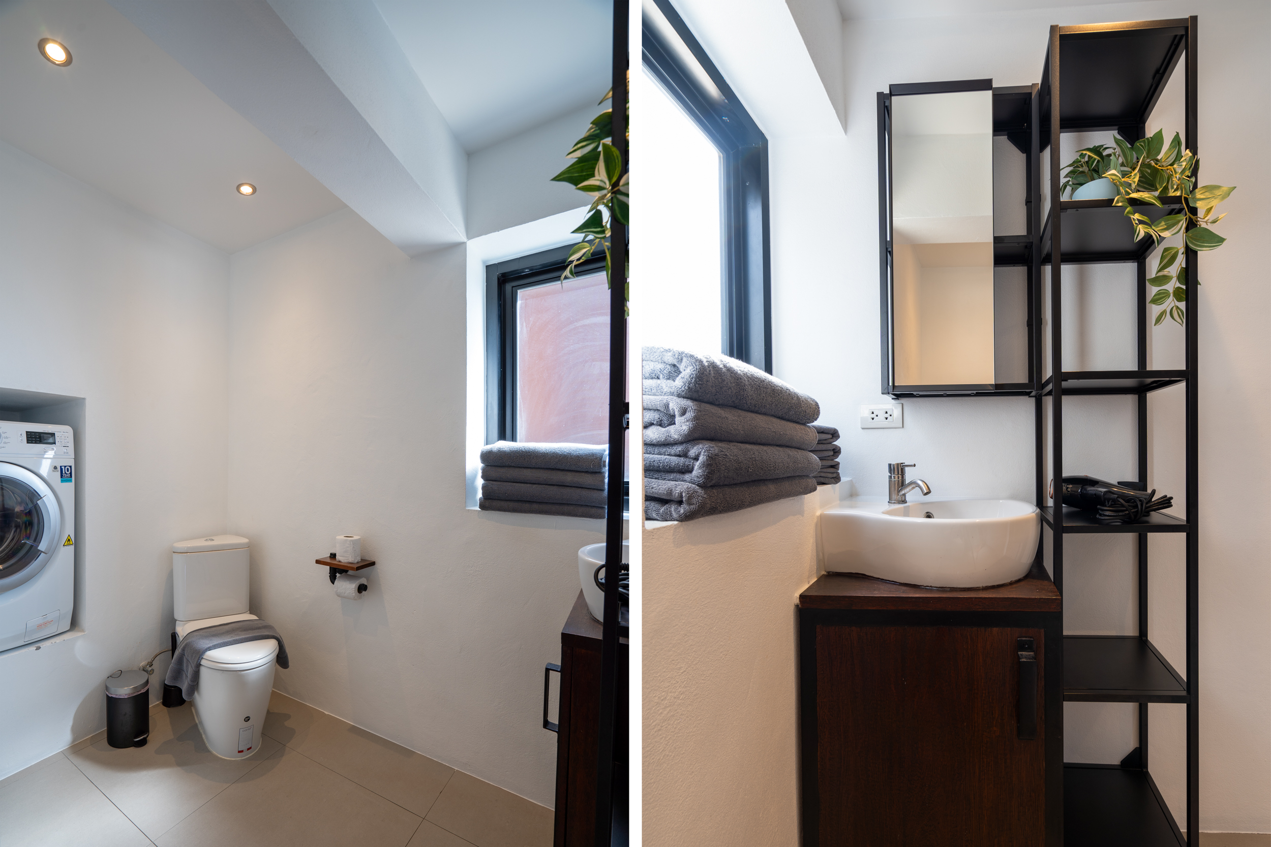 The modern bathroom includes a washing machine/dryer for added convenience during your stay. Step out onto the terrace to soak in the panoramic sea view while seated at the outdoor table for four.