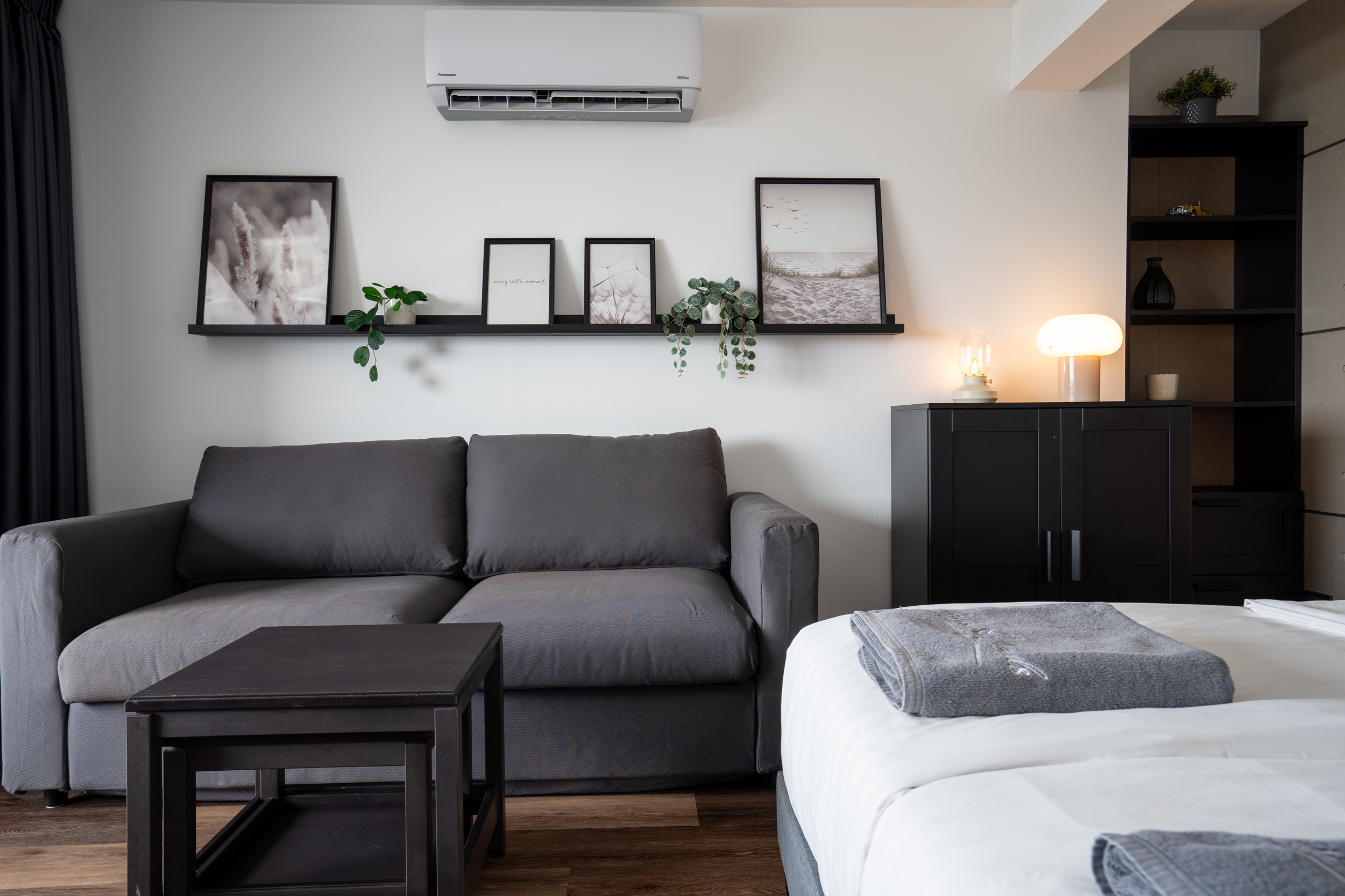 On the upper level, the apartment features a comfortable queen-size bed, with a mattress from IKEA and quality linens to ensure you enjoy a restful night’s sleep. The living area includes a cozy bed sofa and a 42-inch smart TV. High-speed internet, and air conditioning add to your comfort.