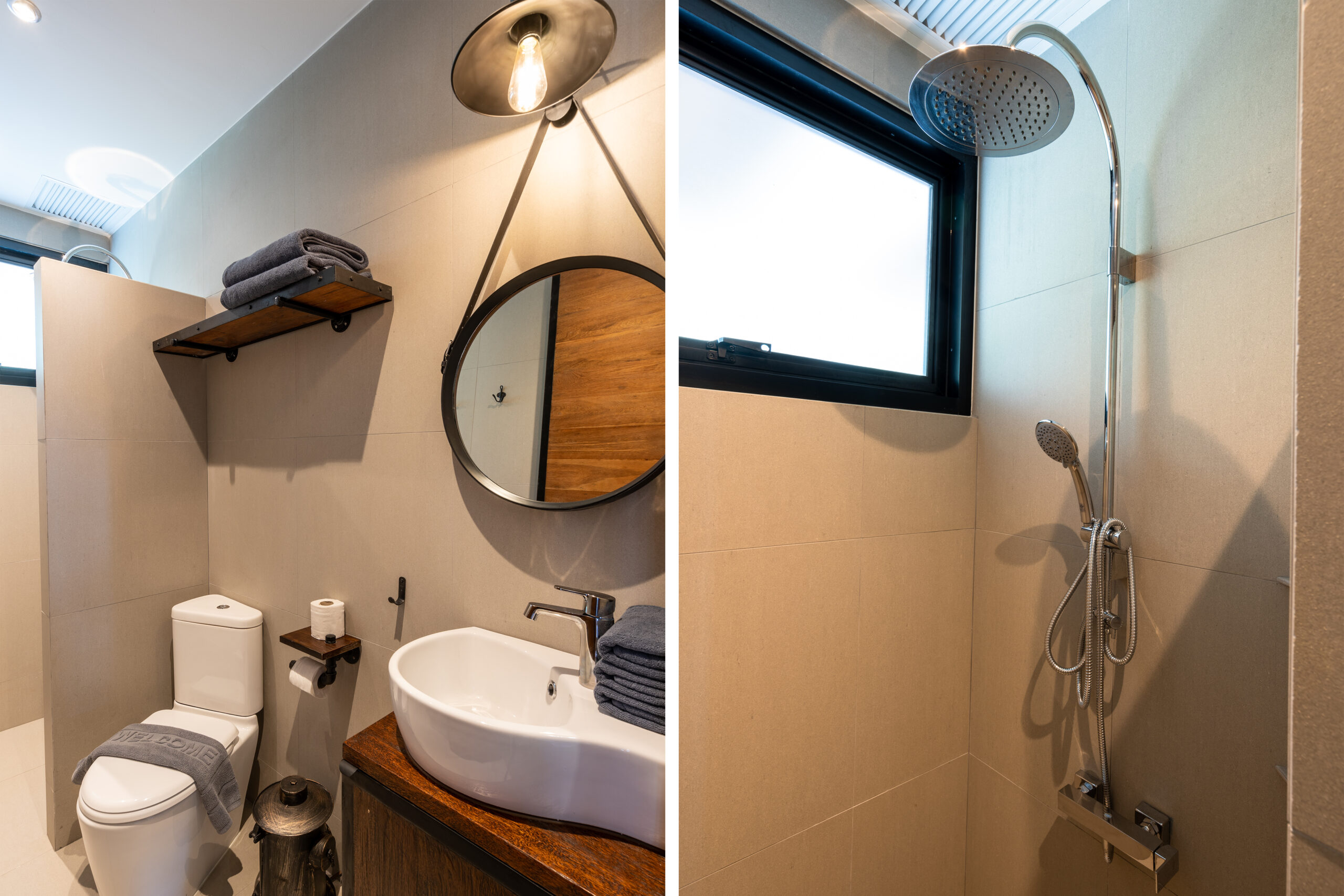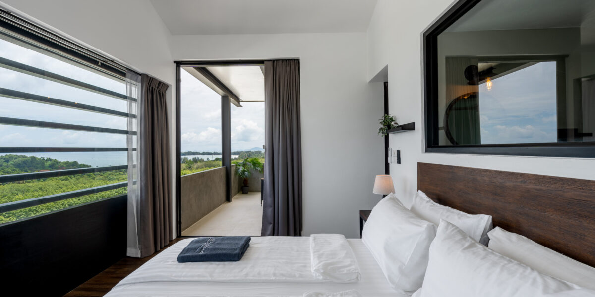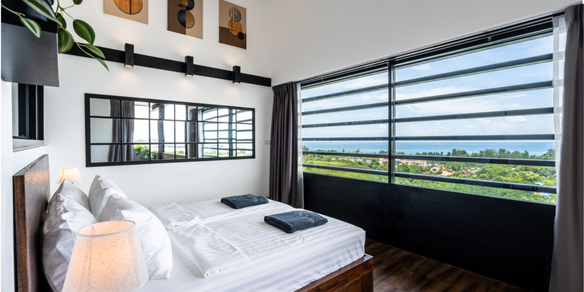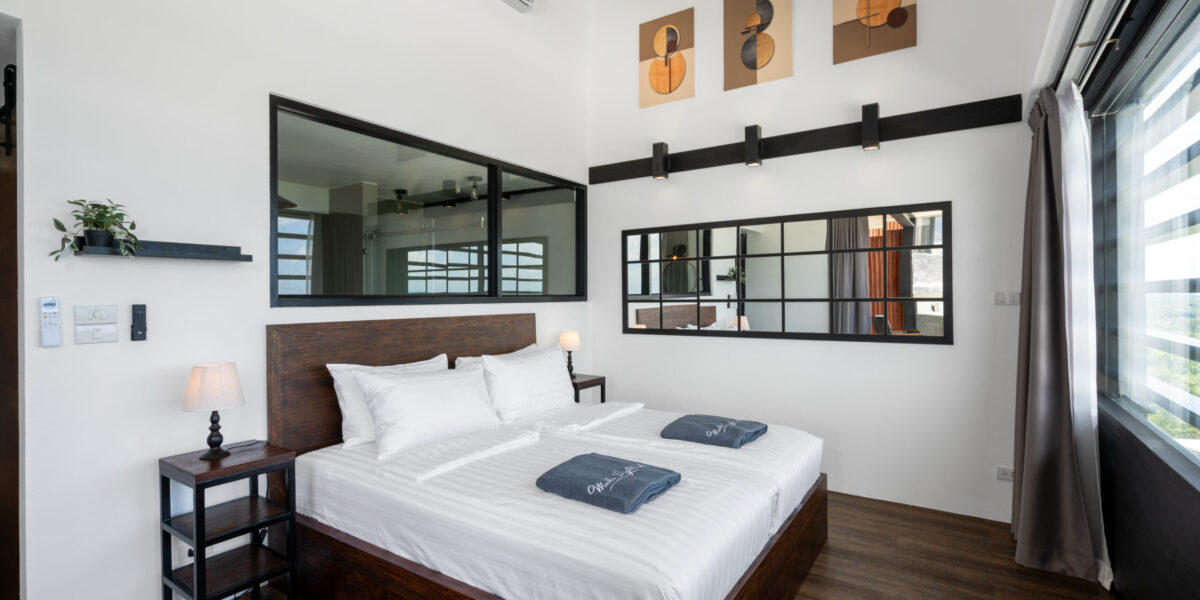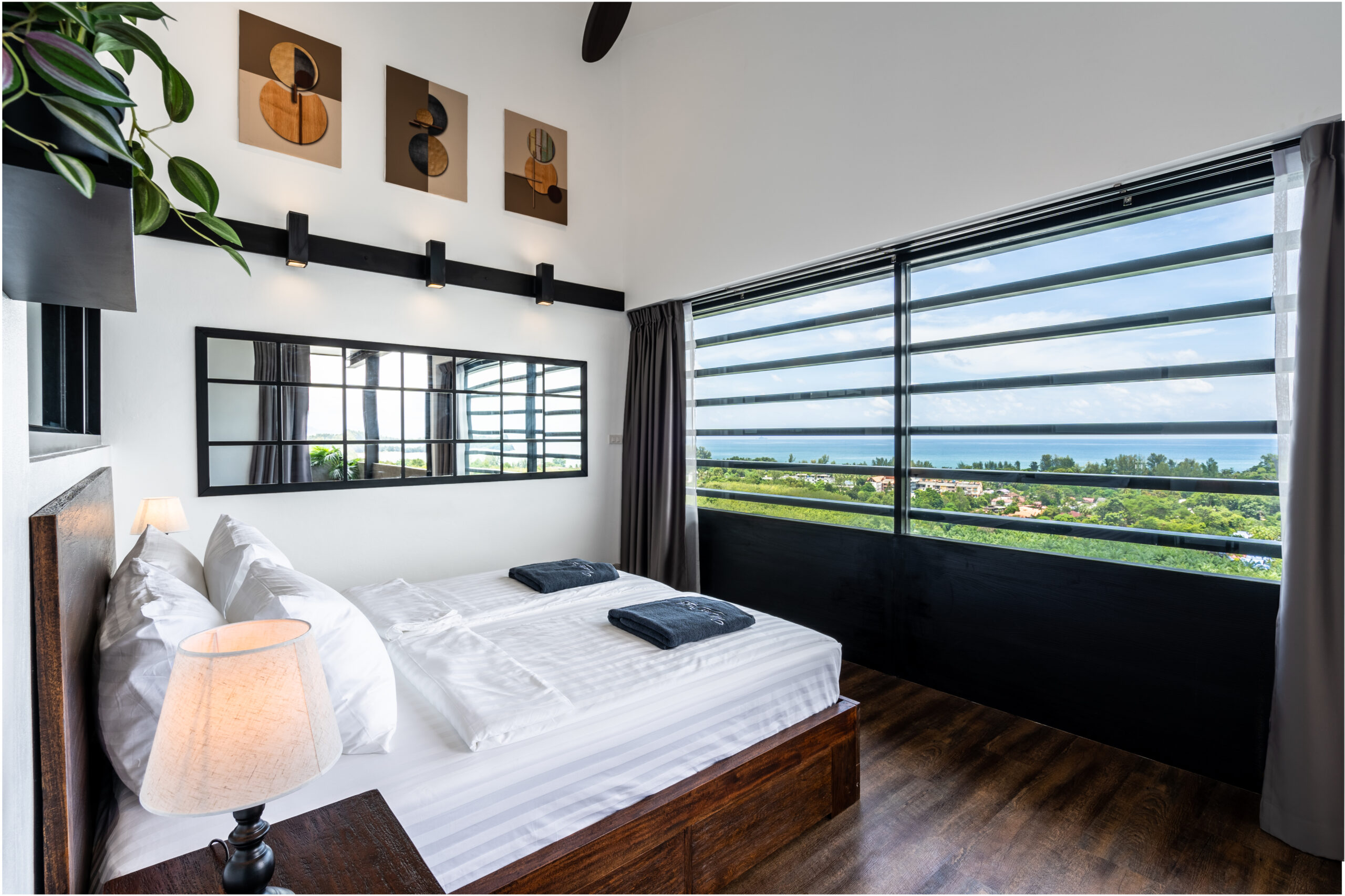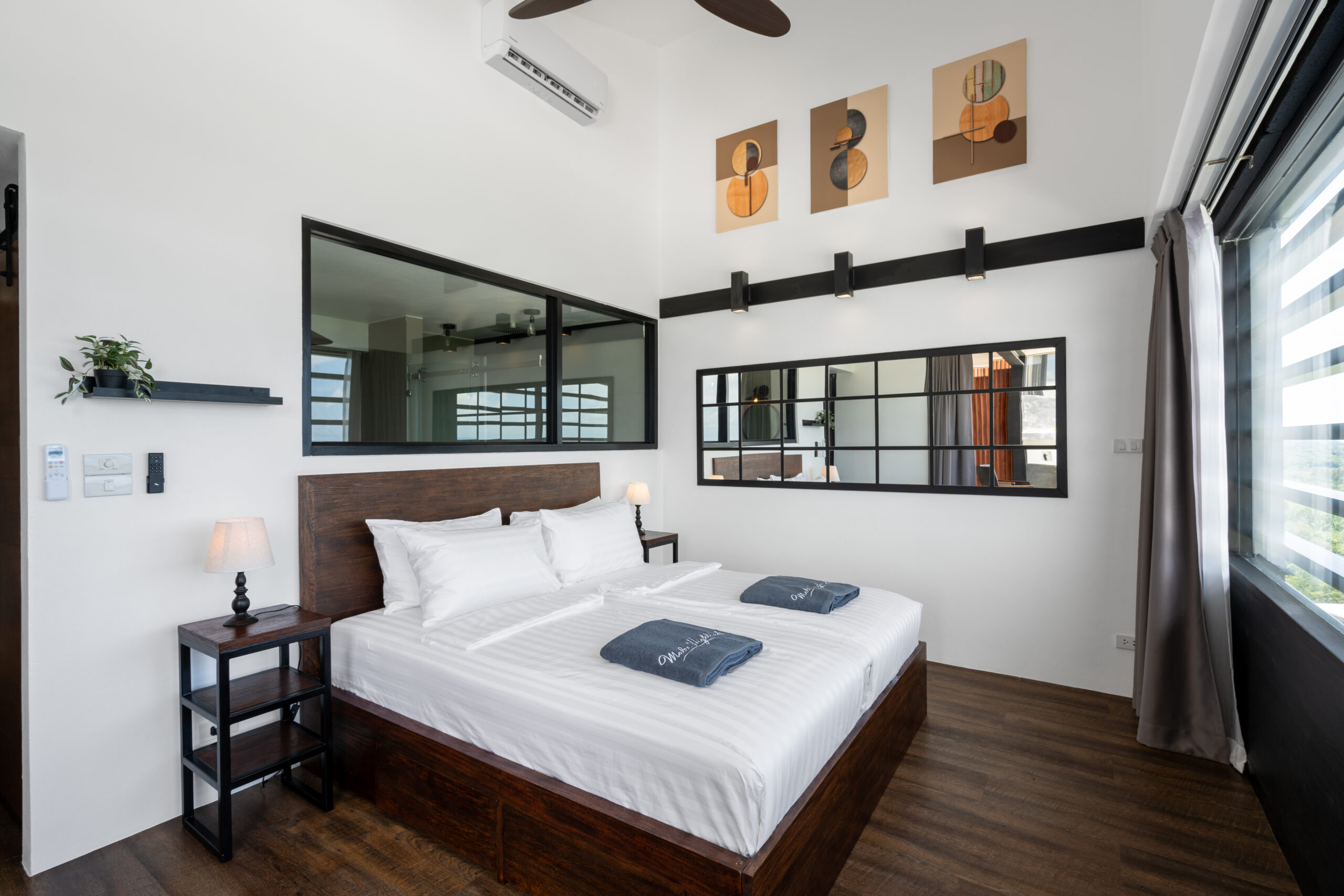 The master bedroom features a king-size bed, an en-suite bathroom, and large windows that offer incredible sea views. It also has its own air conditioning unit, a ceiling fan, and direct access to the lower terrace. All beds are fitted with high-quality IKEA mattresses and premium linens to ensure a restful night’s sleep.