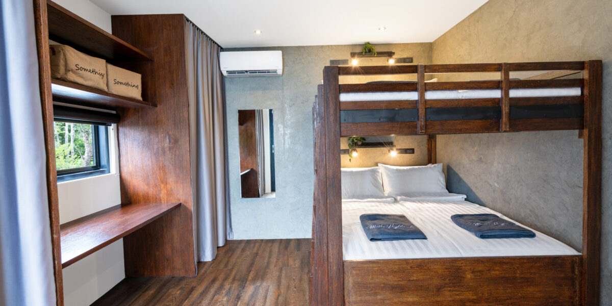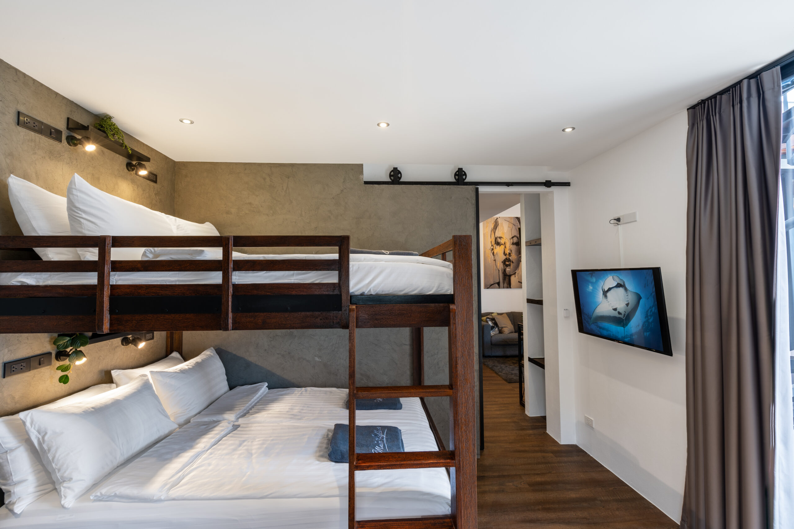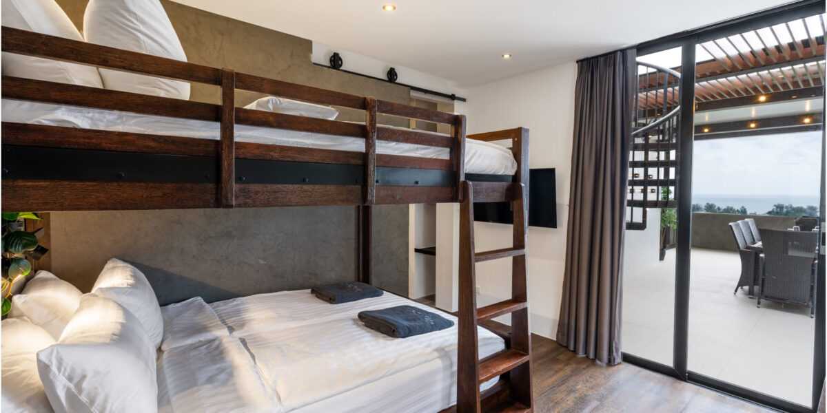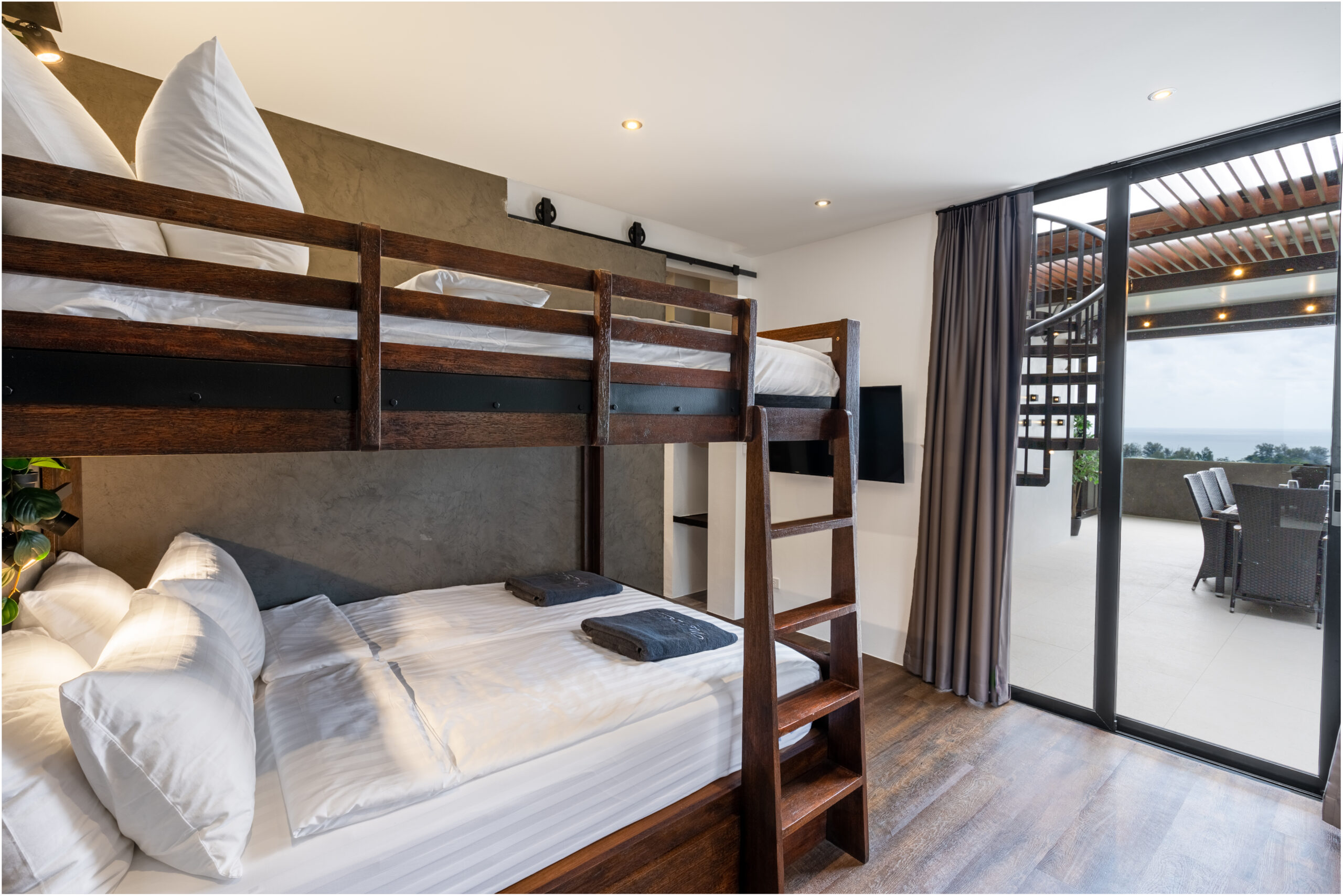 Bedroom two has a queen-size double bunk bed, an air conditioning unit, ample storage space, a work desk, a 43-inch smart TV, and access to the lower terrace with beautiful sea views from the bed. A bathroom is located just outside the door. Bedroom three is a twin-bed loft room with two single beds and a work desk.