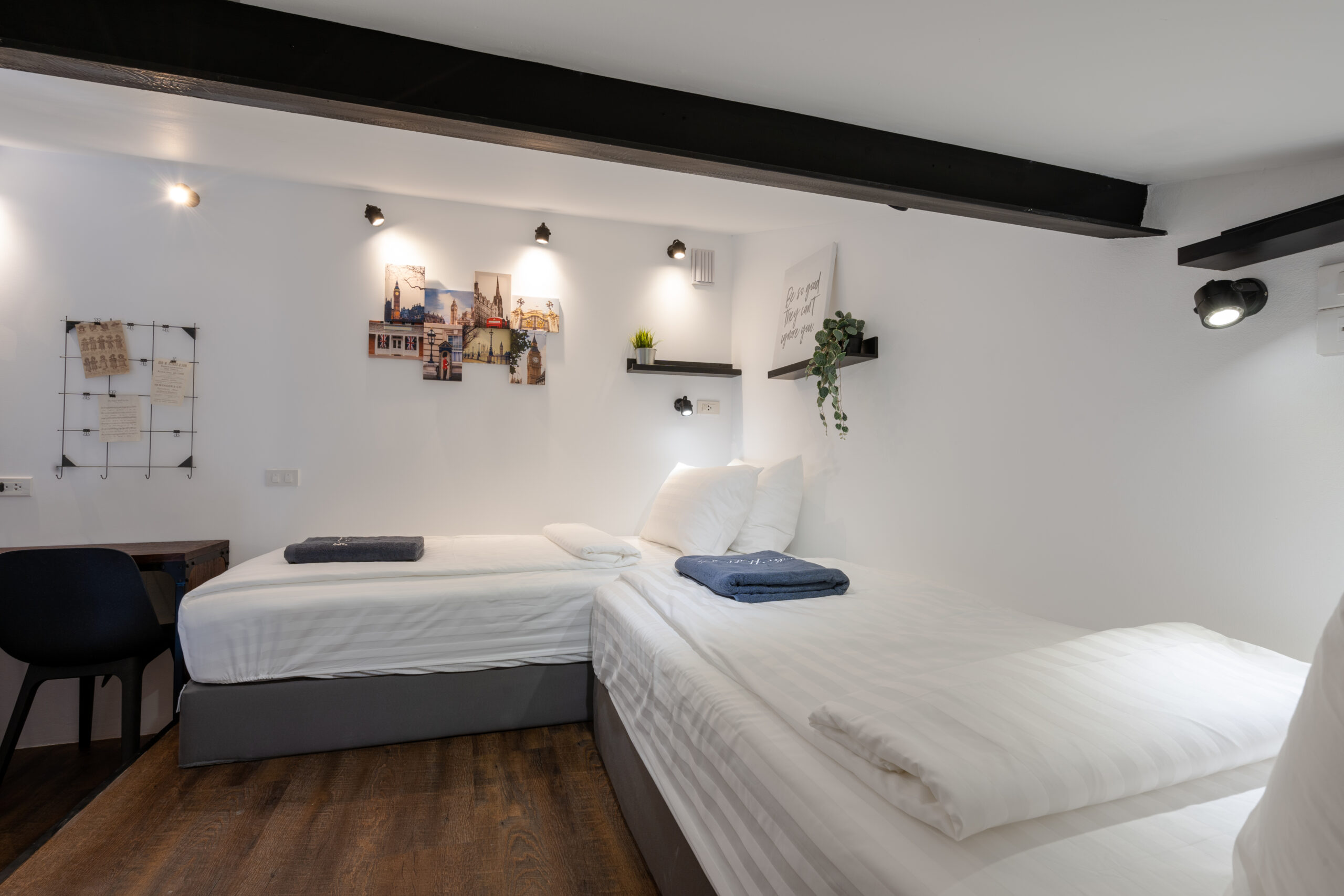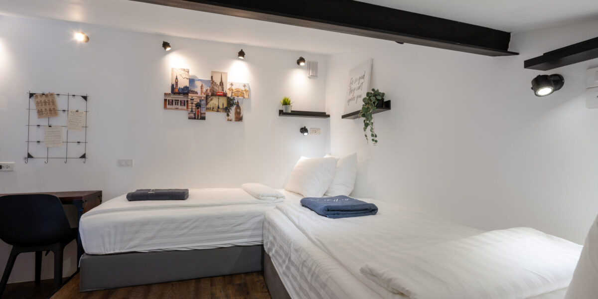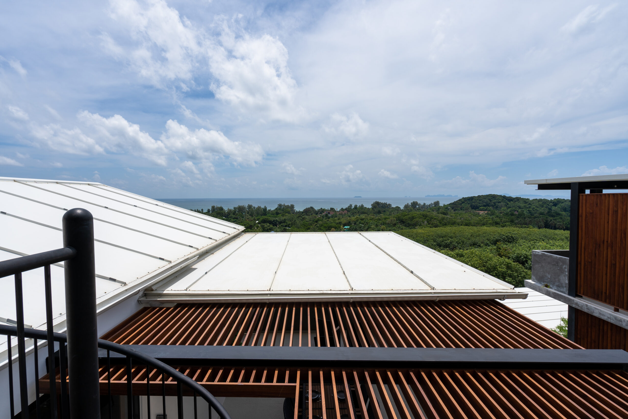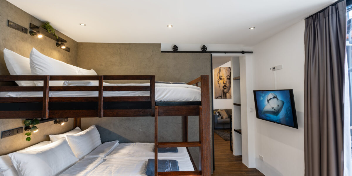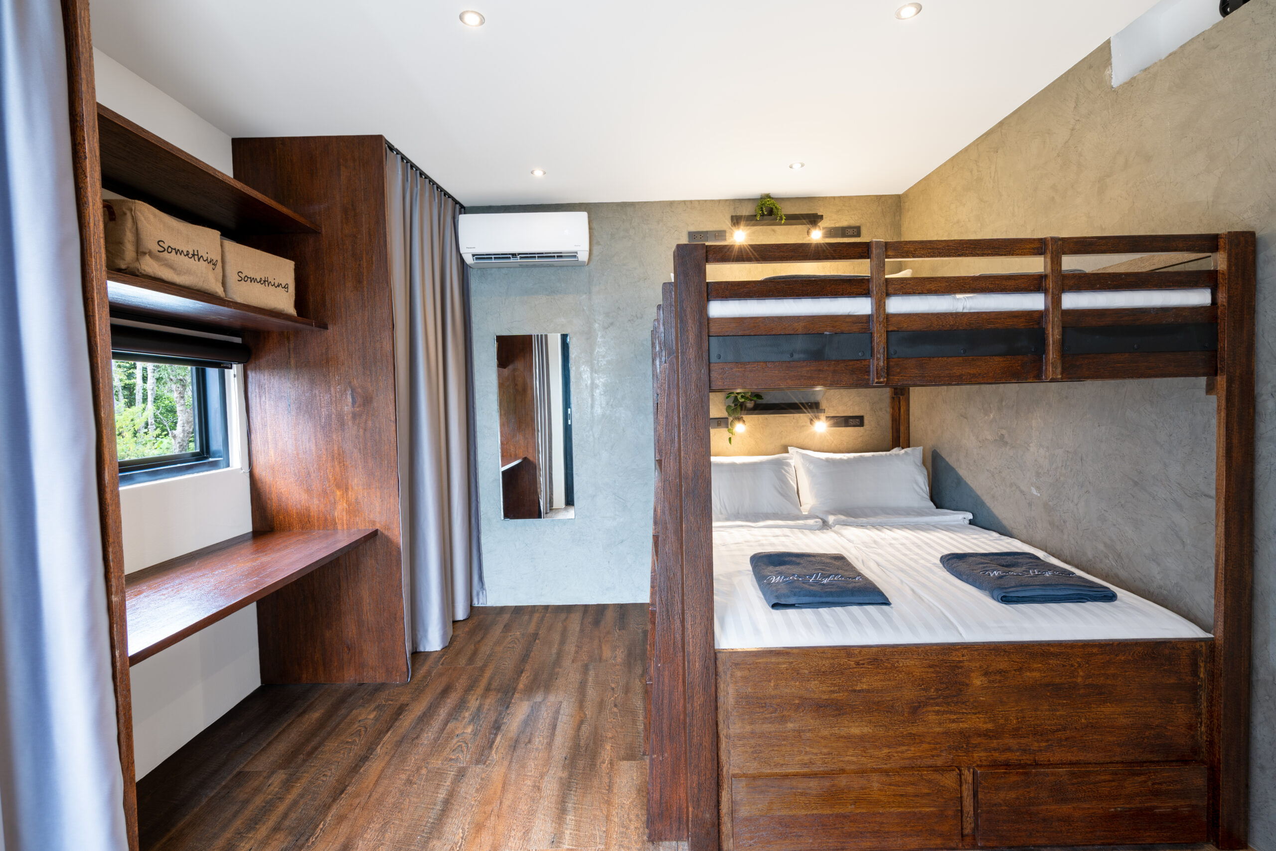 Bedroom two has a queen-size double bunk bed, an air conditioning unit, ample storage space, a work desk, a 43-inch smart TV, and access to the lower terrace with beautiful sea views from the bed. A bathroom is located just outside the door. Bedroom three is a twin-bed loft room with two single beds and a work desk.