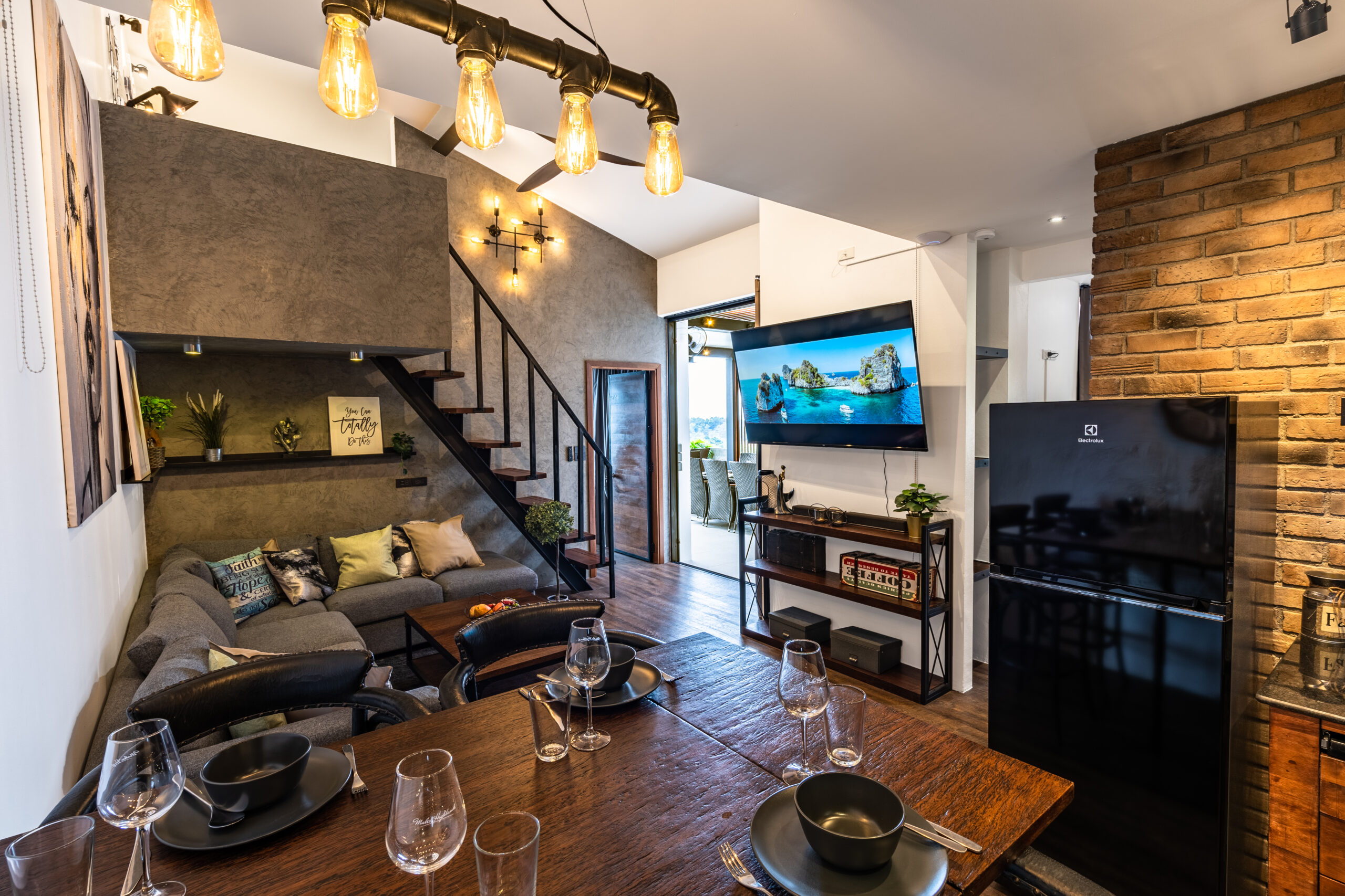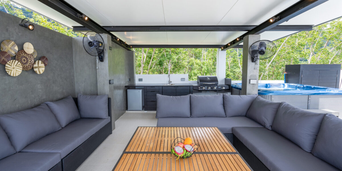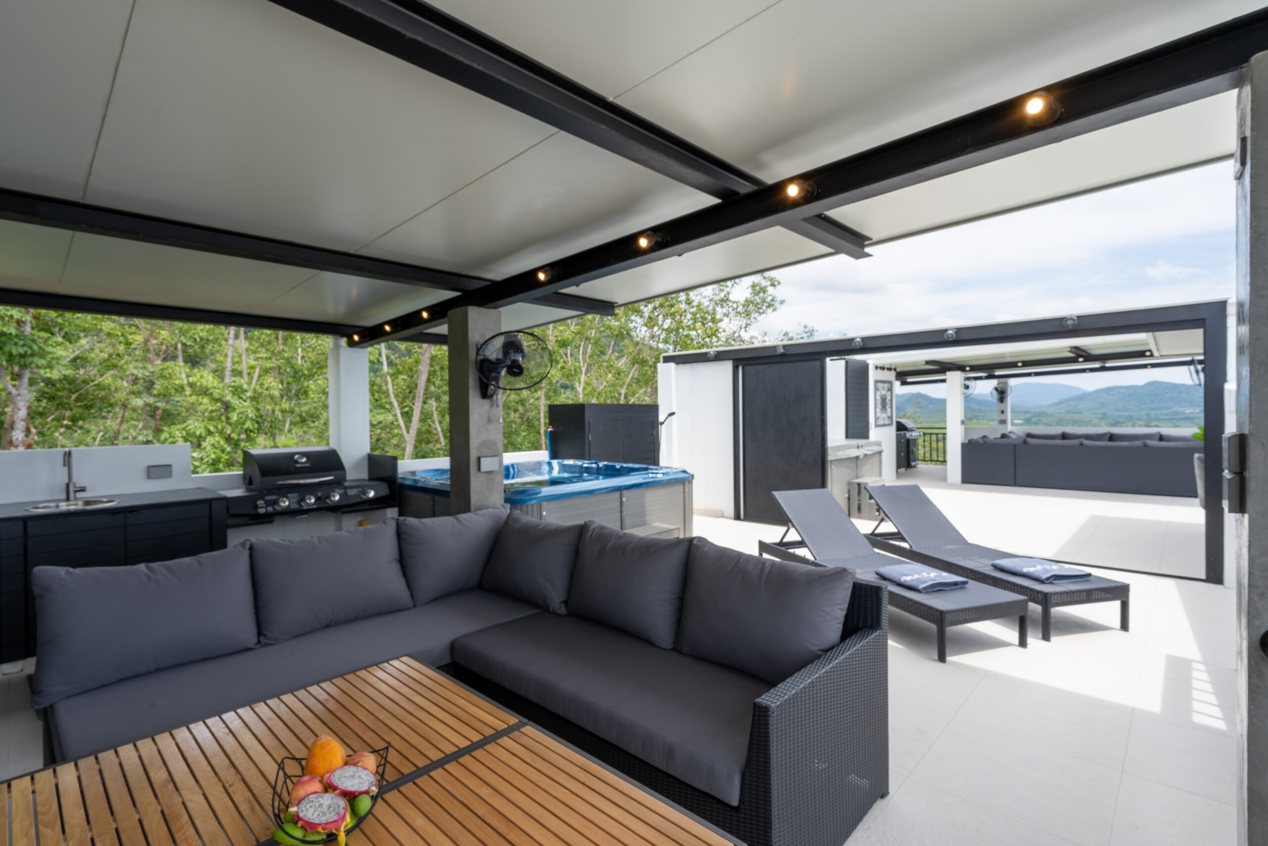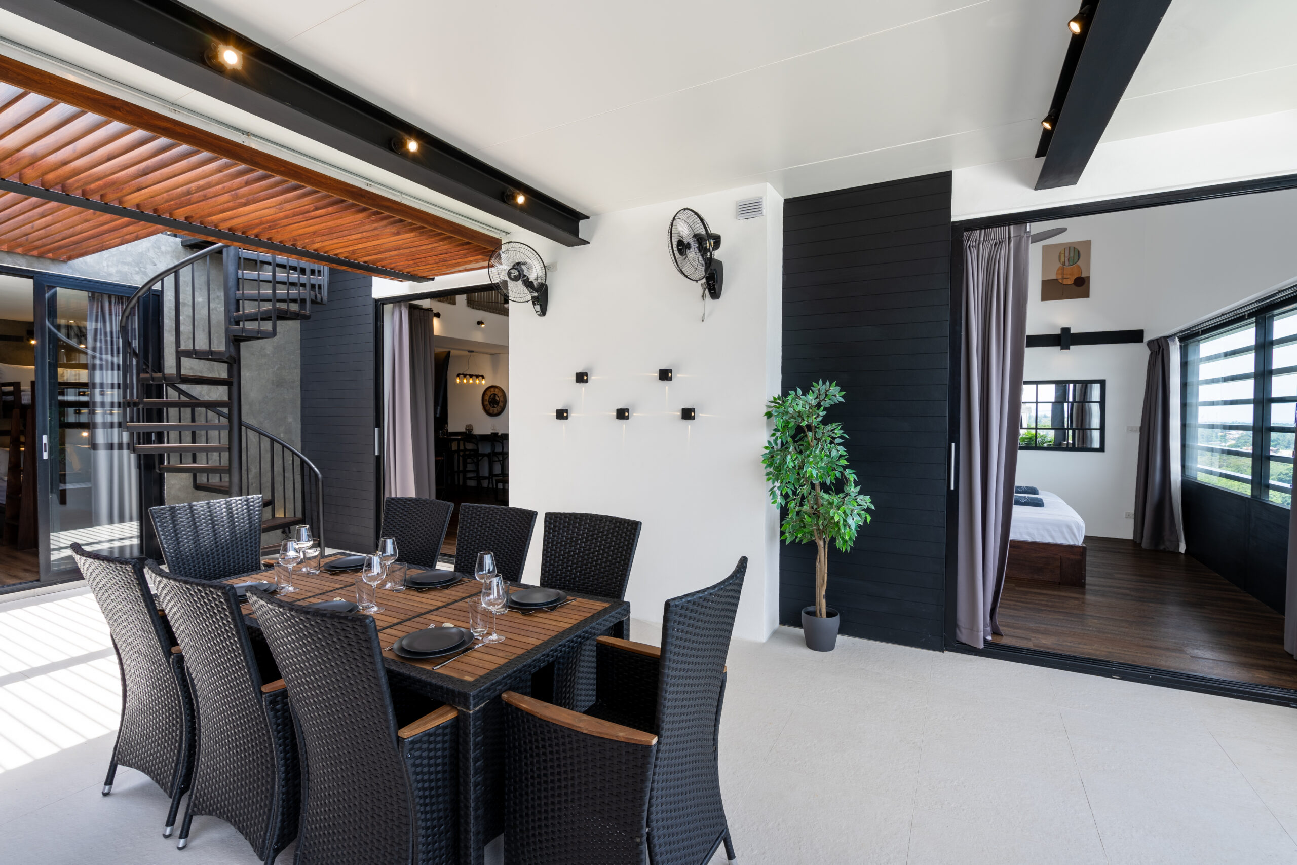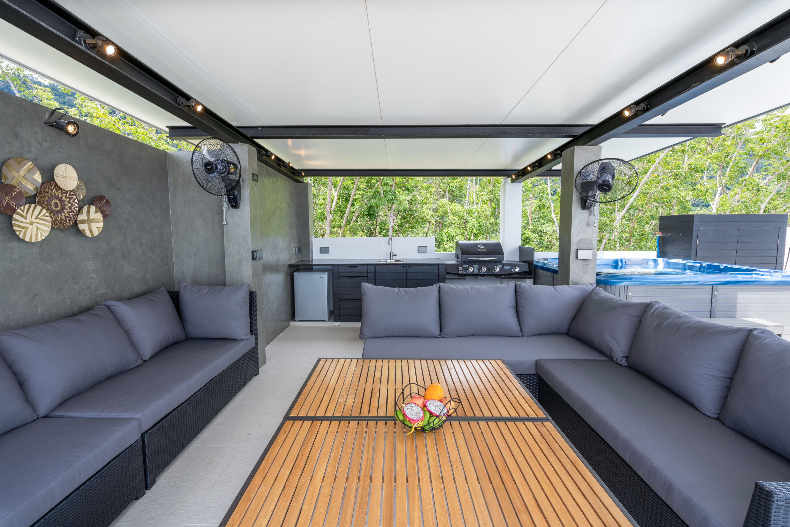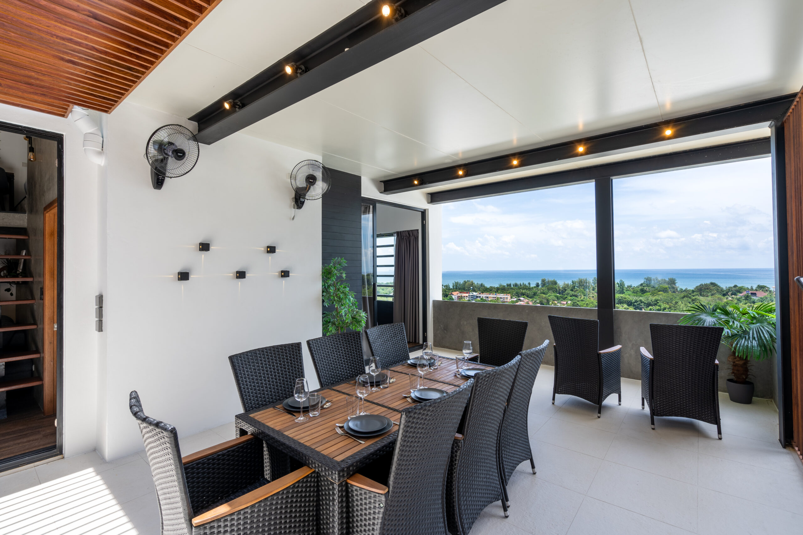 The living area is expansive, with high ceilings, a large sofa, air conditioning, a ceiling fan, and a 55-inch smart TV. It has direct access to the lower terrace, where you’ll find a comfortable outdoor dining area for 8 people, perfect for enjoying meals with a view.