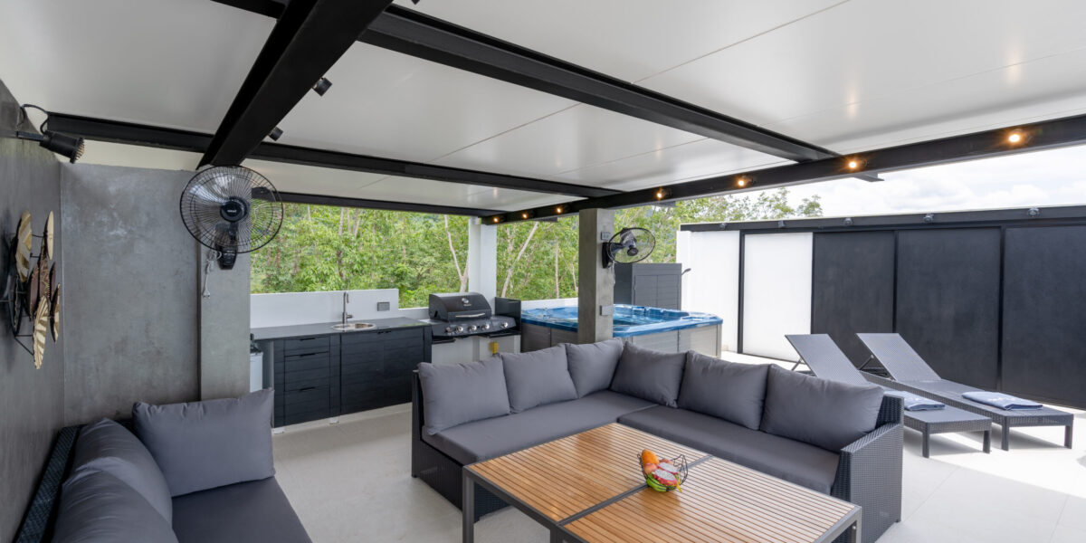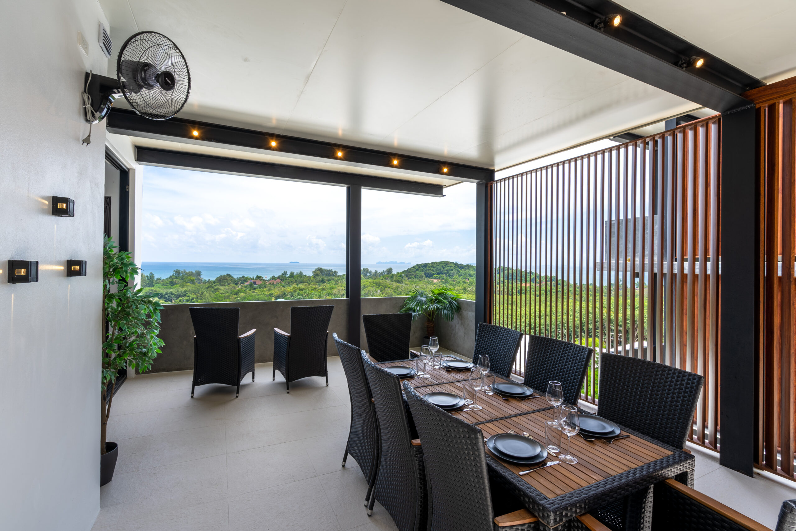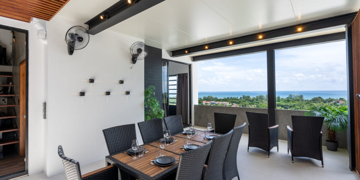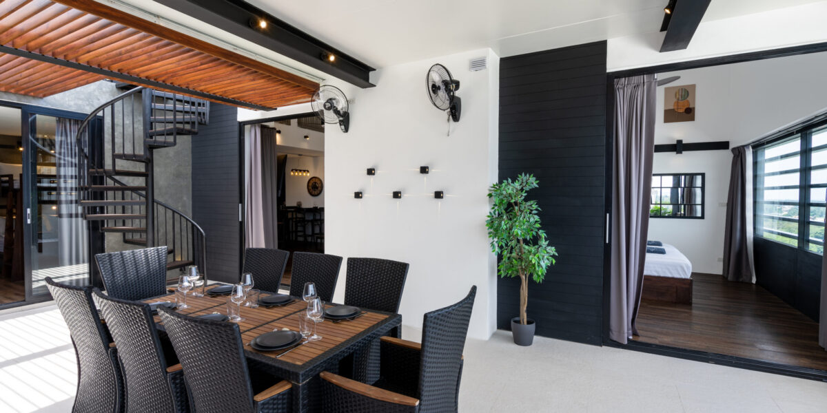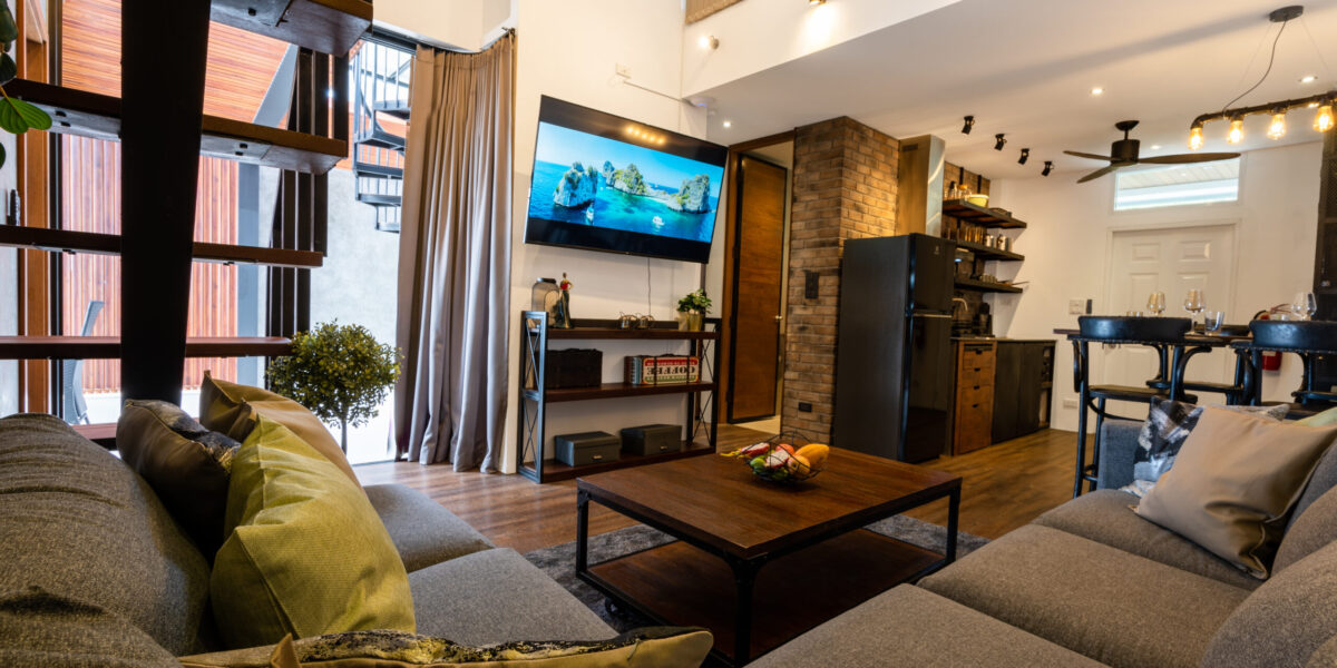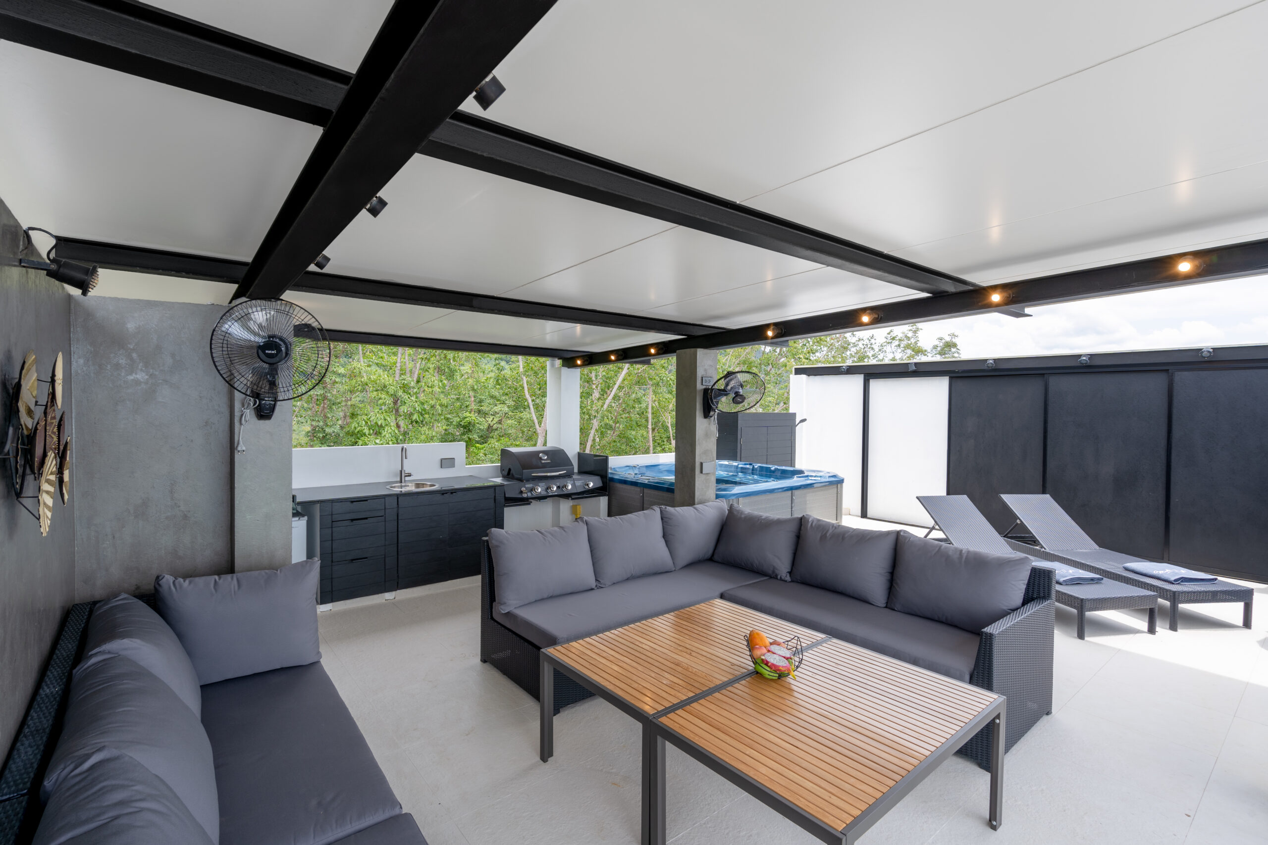 The living area is expansive, with high ceilings, a large sofa, air conditioning, a ceiling fan, and a 55-inch smart TV. It has direct access to the lower terrace, where you’ll find a comfortable outdoor dining area for 8 people, perfect for enjoying meals with a view.