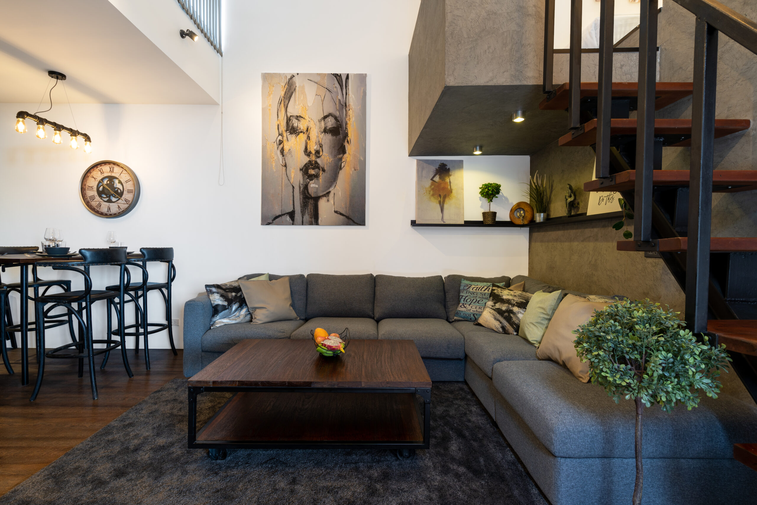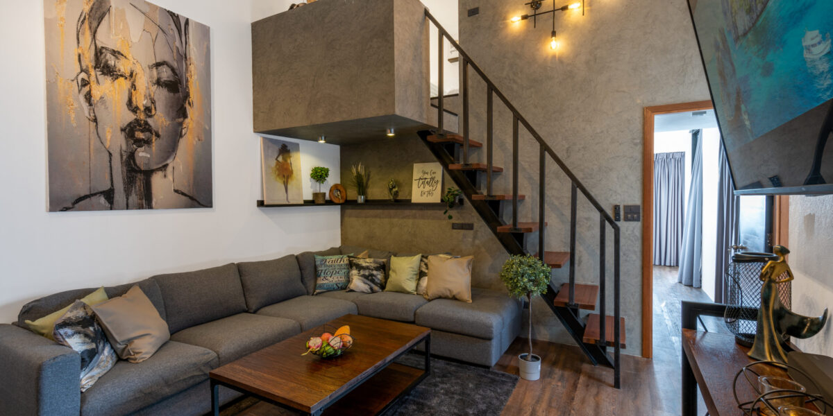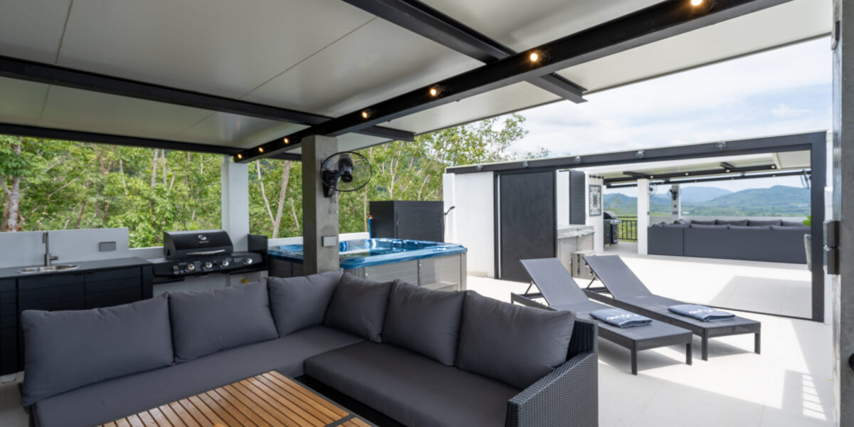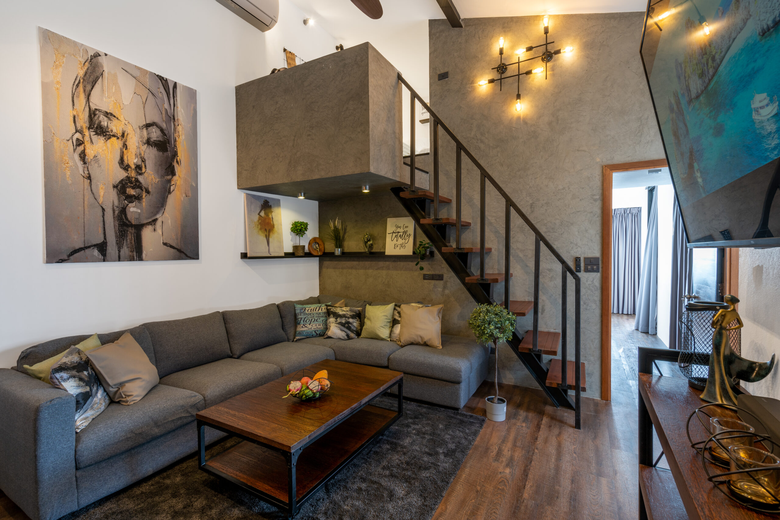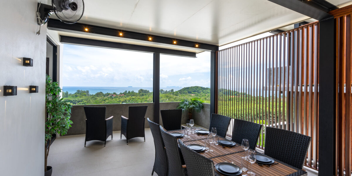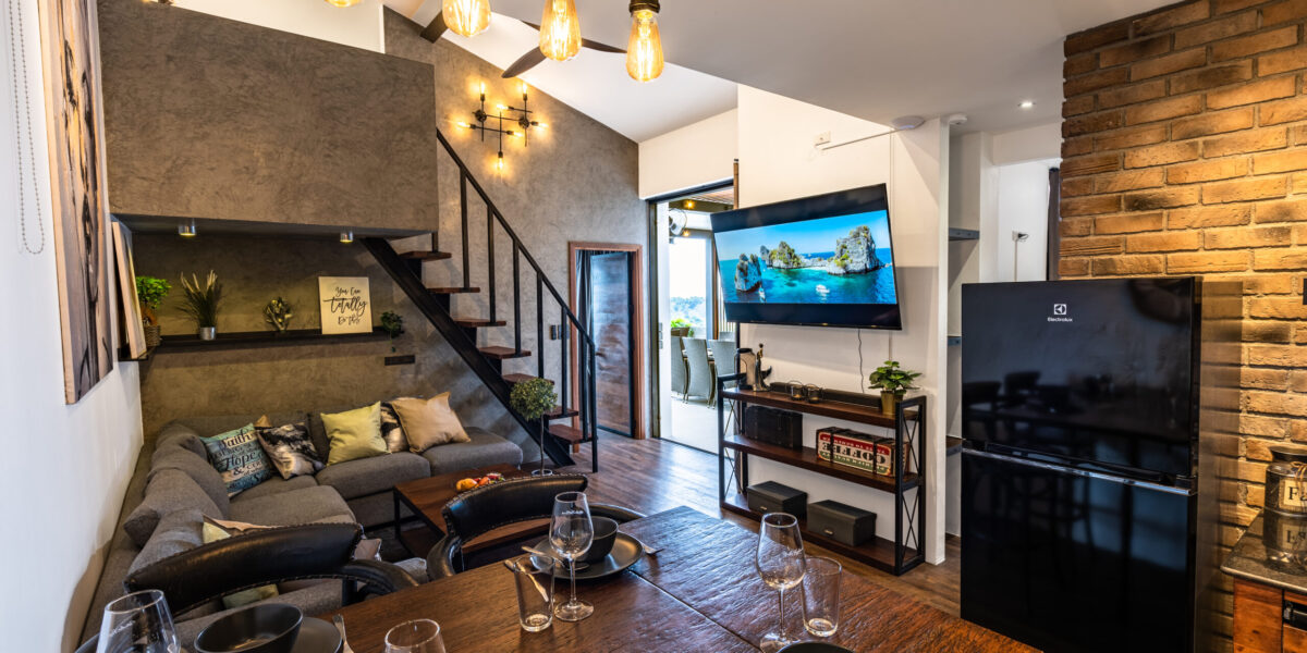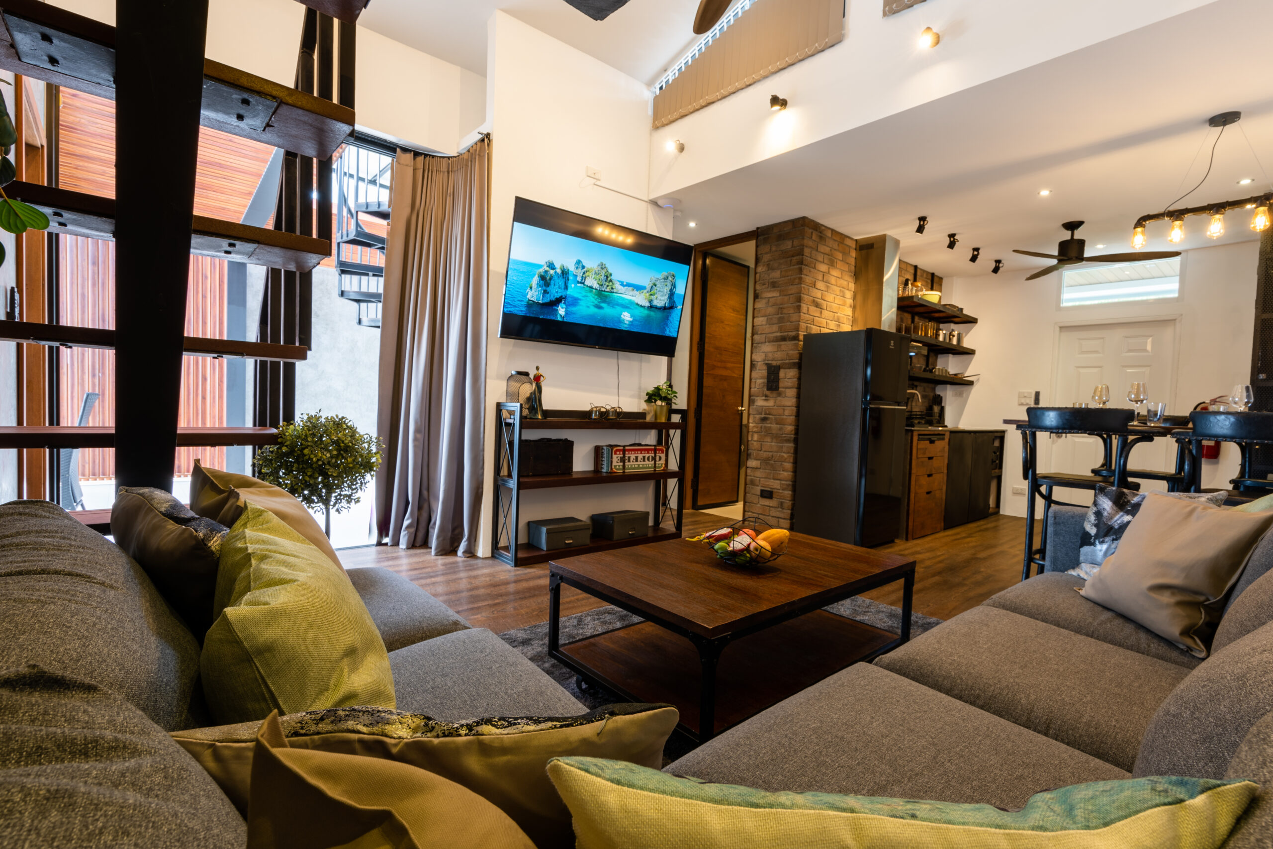 The living area is expansive, with high ceilings, a large sofa, air conditioning, a ceiling fan, and a 55-inch smart TV. It has direct access to the lower terrace, where you’ll find a comfortable outdoor dining area for 8 people, perfect for enjoying meals with a view.
