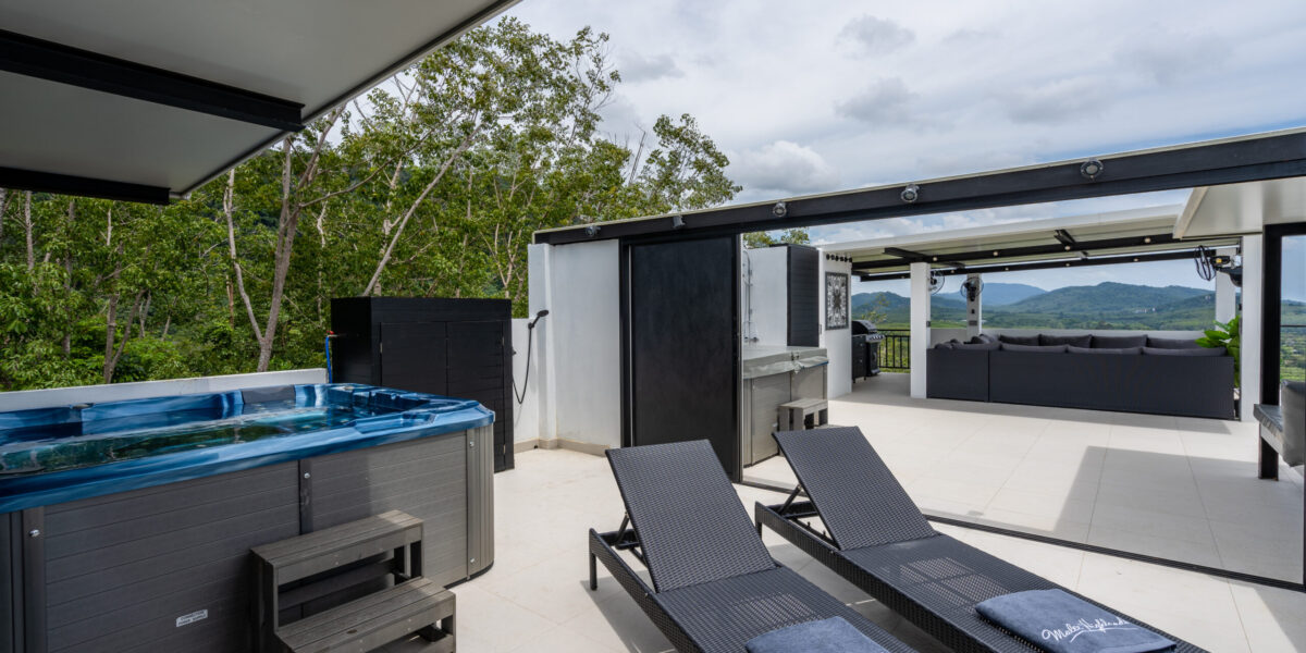 The highlight of this apartment is the private upper sea-view terrace. This outdoor oasis features a large, comfortable sofa, wall fans, sunbeds, a jacuzzi, an outdoor shower, and an outdoor kitchen with a sink, fridge, and barbecue. The terrace can also open up to apartment C2, making it ideal for larger groups.