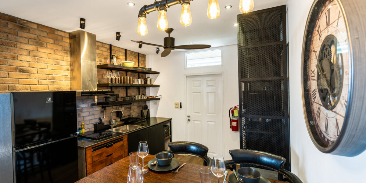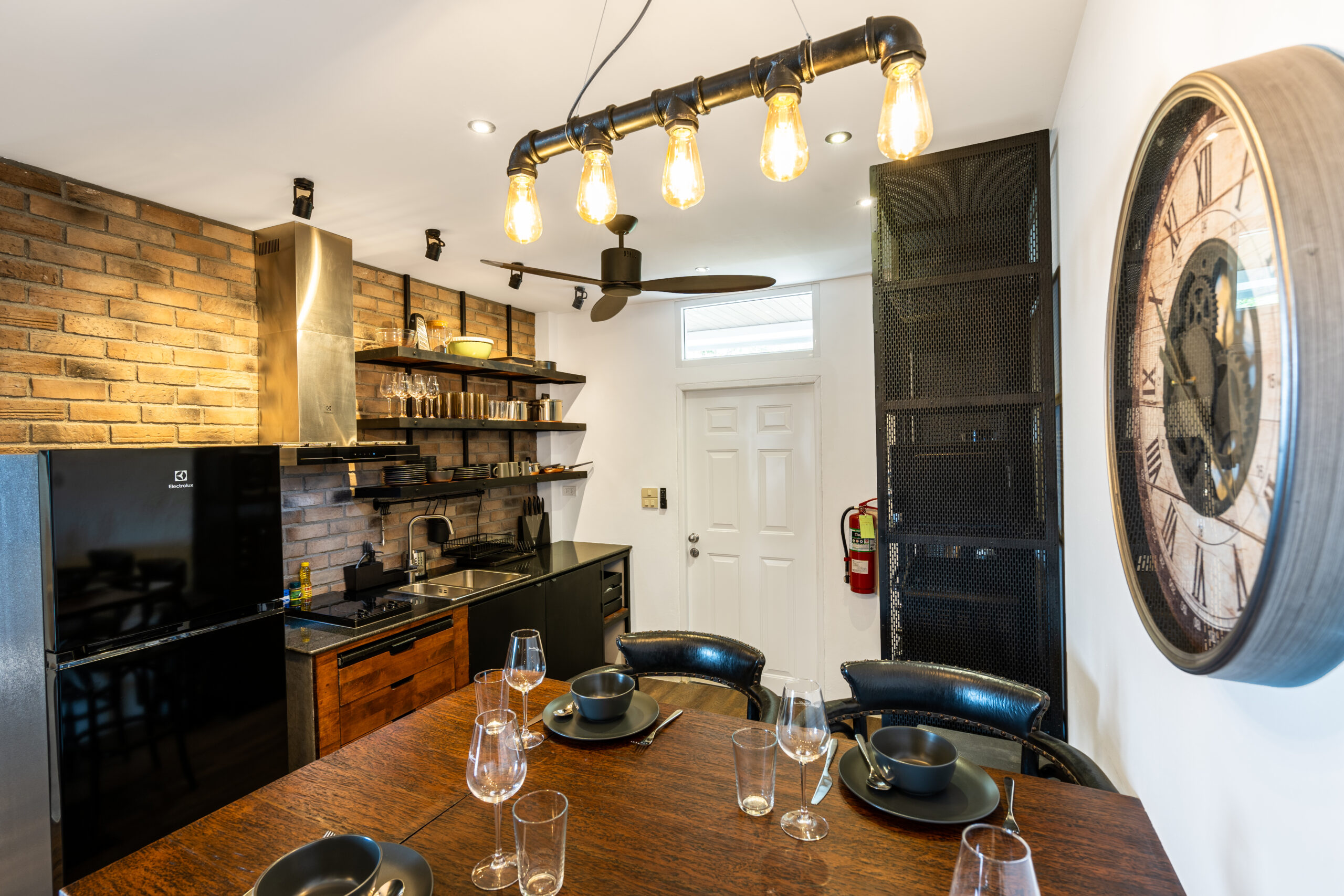 The fully equipped kitchen includes everything you need for a seamless stay, such as a two-burner cooktop, oven, microwave, full-size refrigerator, toaster, coffee machine, and all essential cookware and utensils. A washer/dryer is also included for added convenience. The dining area offers ample space for your group, whether you choose to dine indoors or outside on the terrace.
